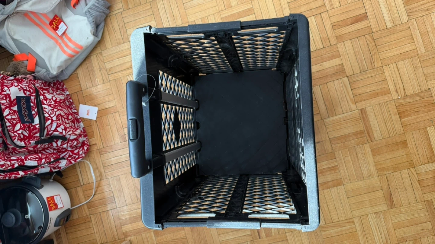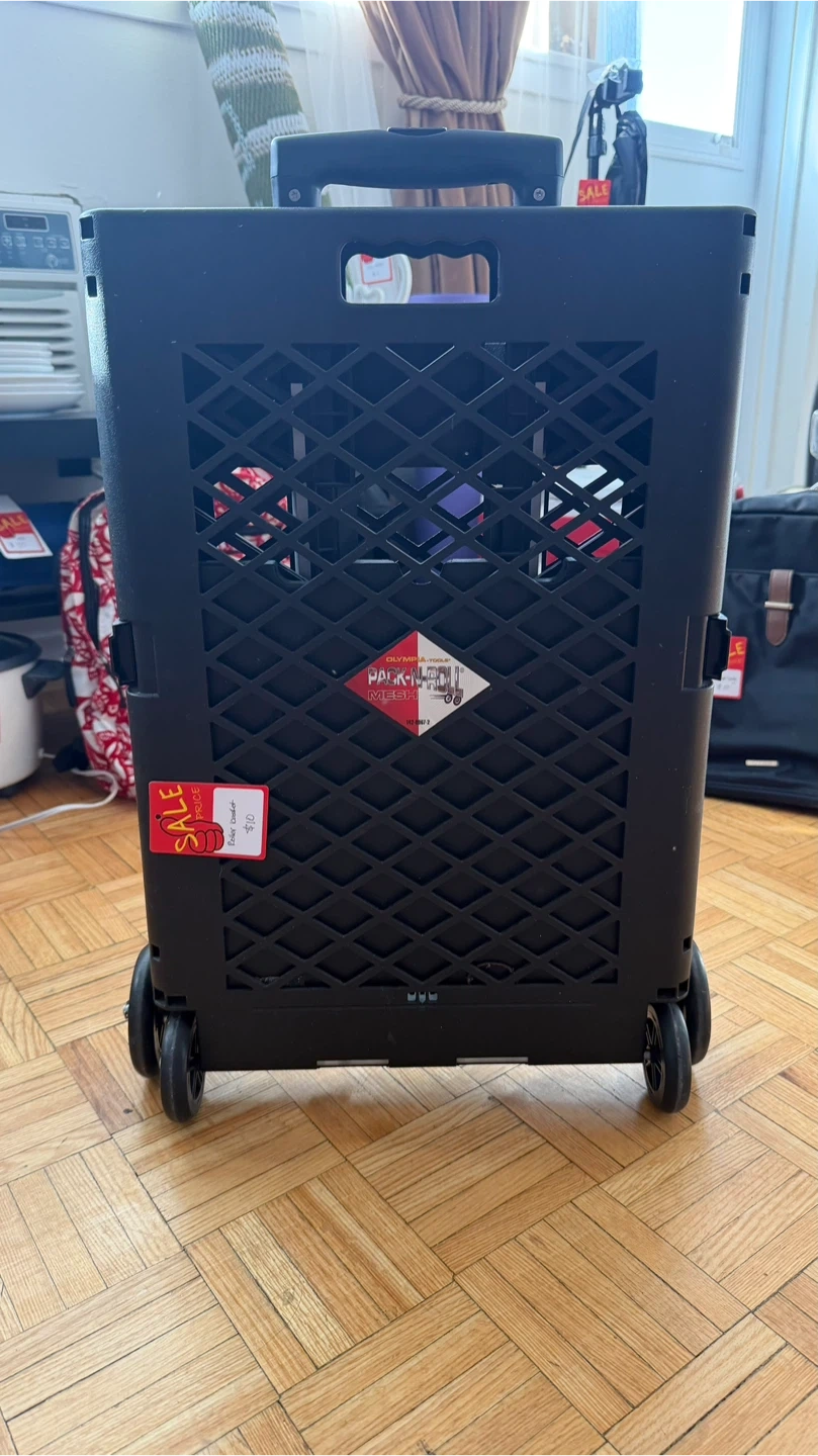 This black rolling utility cart is great for carrying groceries or other items. It's made of durable plastic and features smooth-rolling wheels. It folds up compactly for easy storage when not in use. This cart is perfect for students, apartment dwellers, or anyone who needs a hand with their haul!