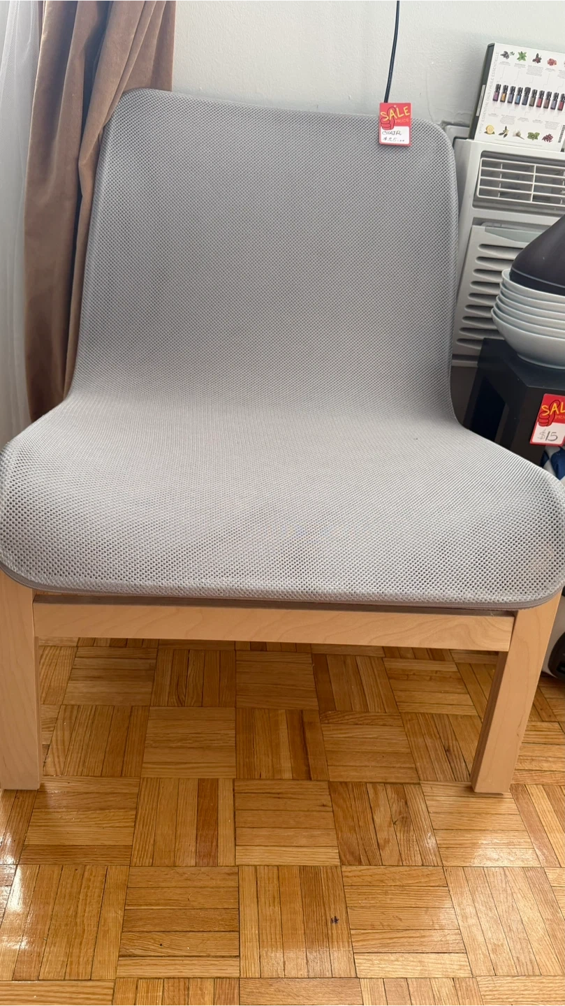 This is a light grey IKEA chair with a wooden frame. It's a comfortable accent chair that would fit well in many rooms. The seat and back are made of a breathable mesh fabric.