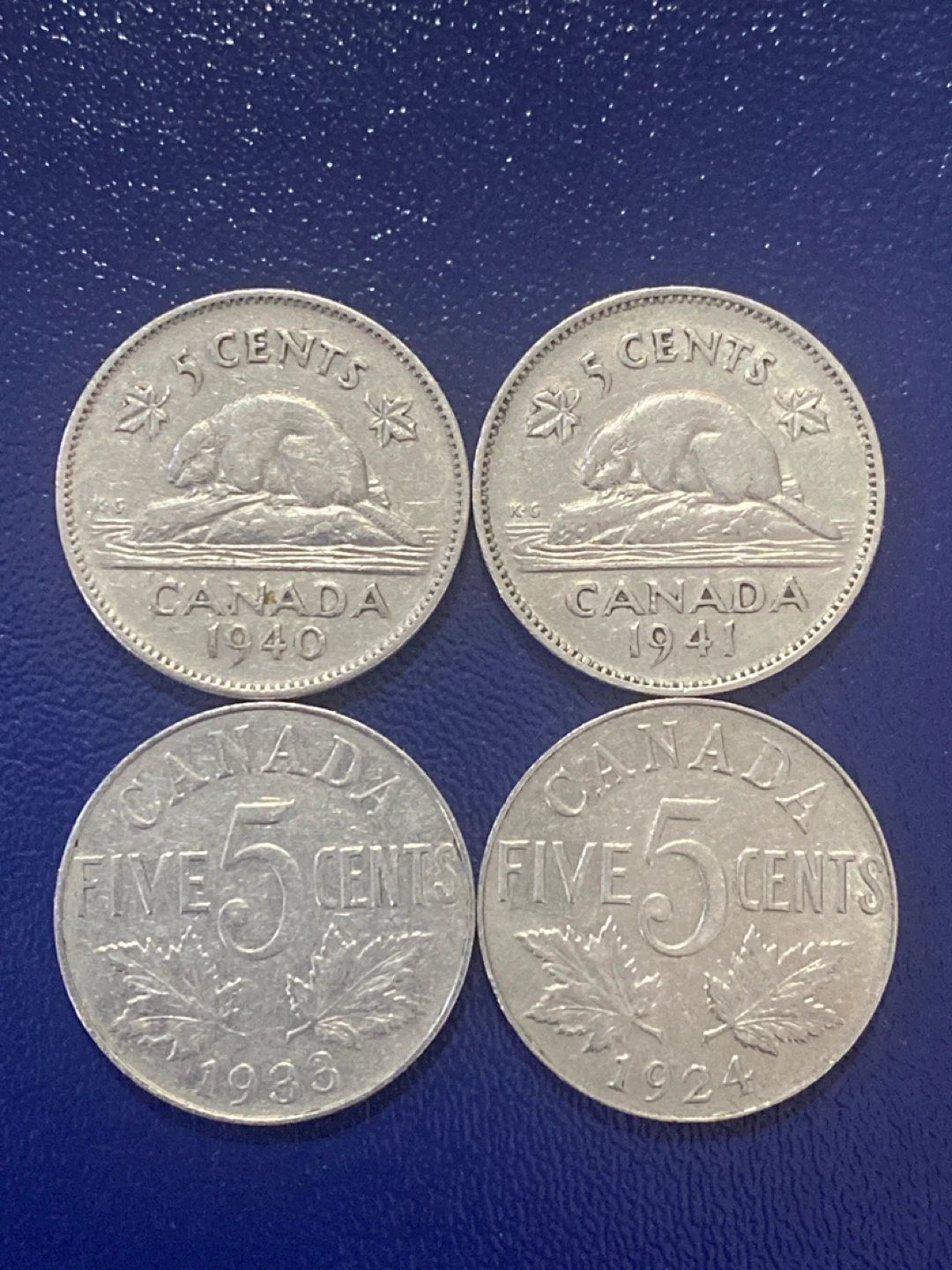 This listing includes four Canadian 5 cent coins. Two coins are dated 1940 and 1941, featuring the beaver design. The other two coins are dated 1933 and 1924, also featuring the maple leaf design. These are nickel coins.