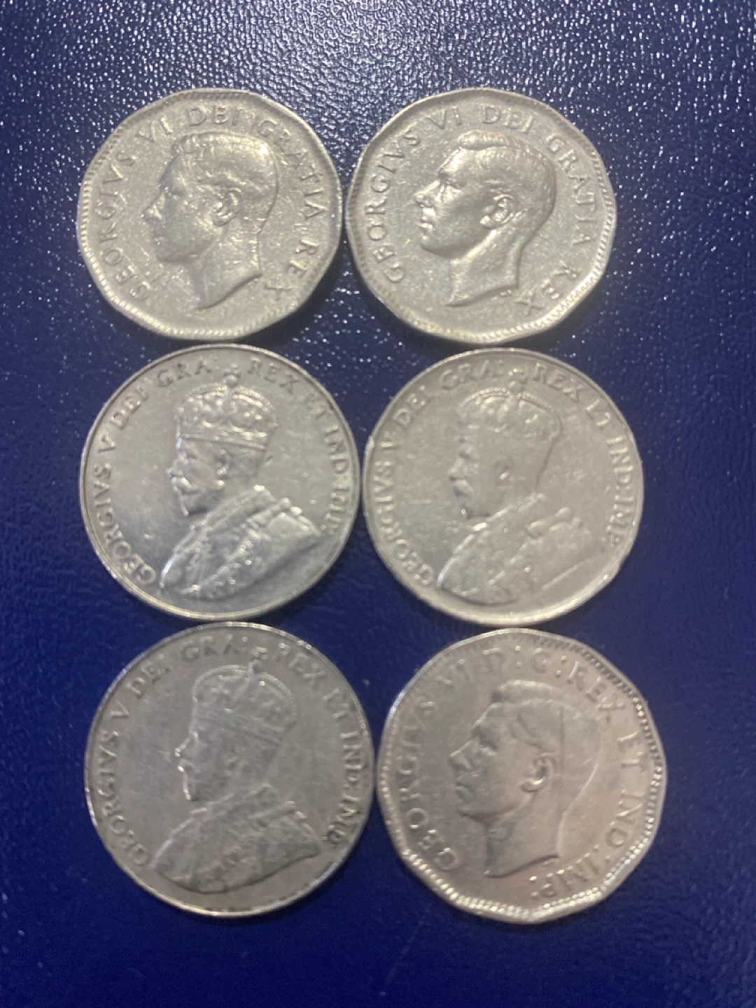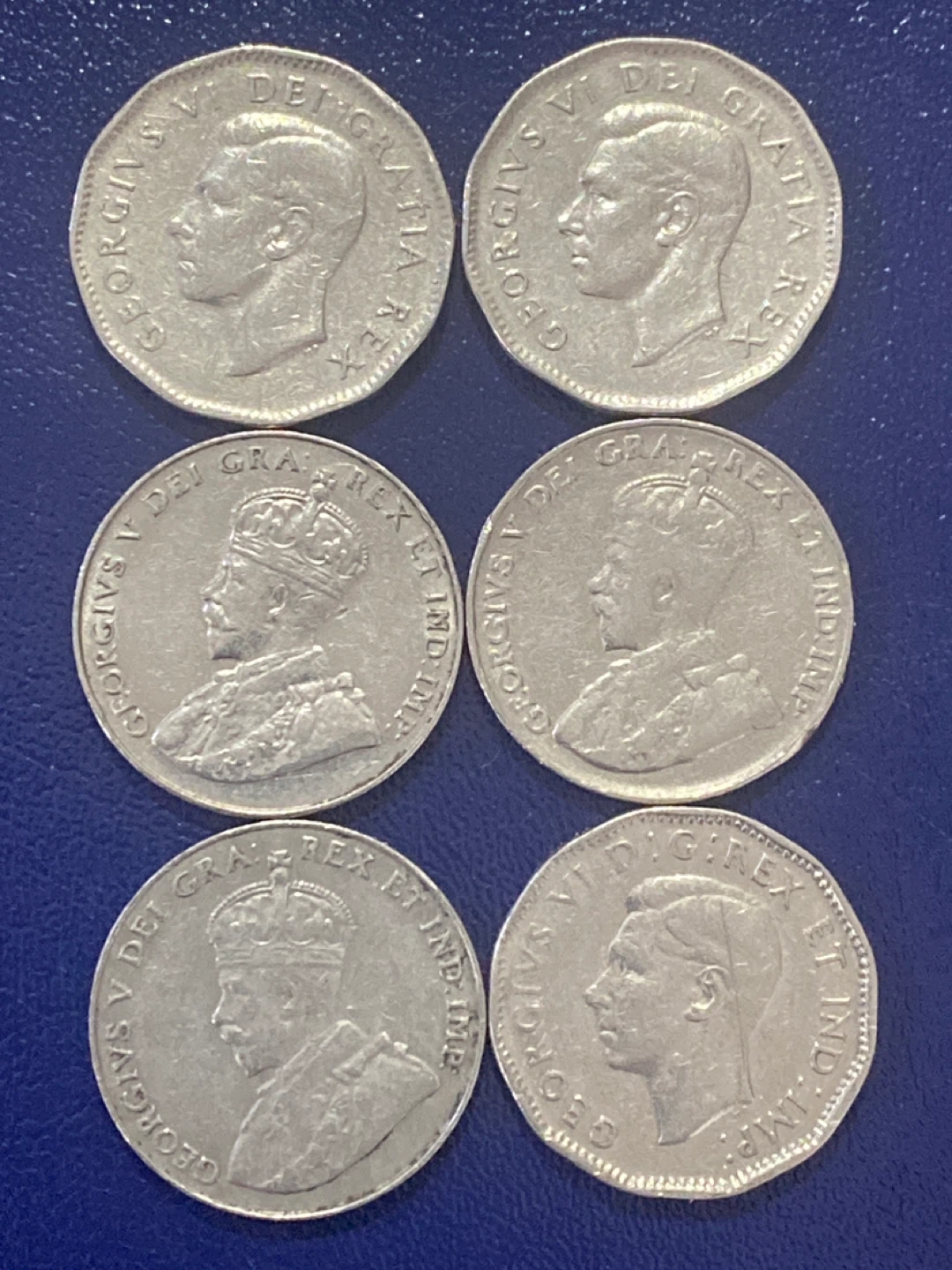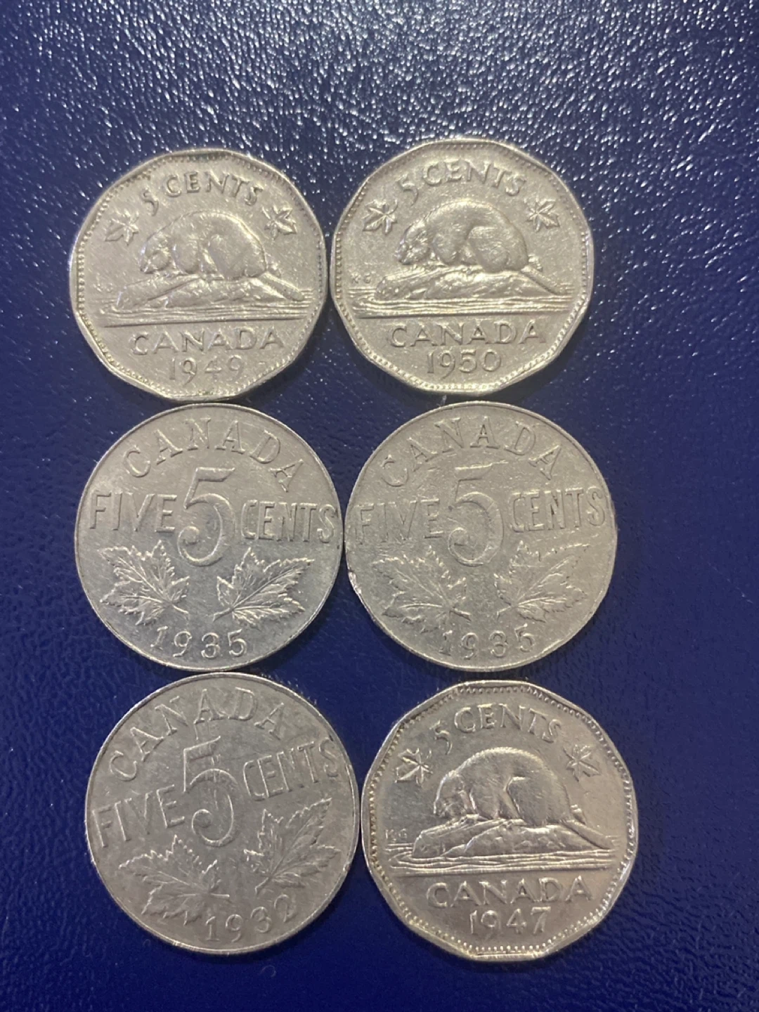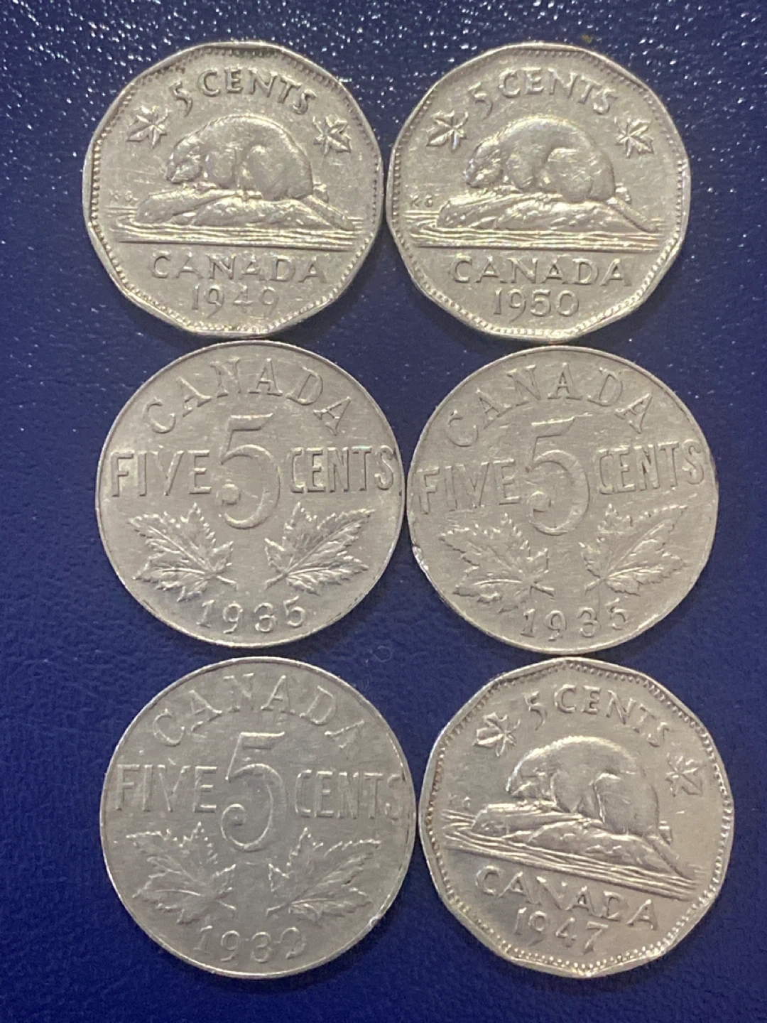 This listing is for six Canadian 5 cent coins. It includes two coins from 1949 and 1950 featuring a beaver. There are also two coins from 1935 featuring maple leaves, and one coin from 1939, and one coin from 1947, also featuring maple leaves. These are great for coin collectors!