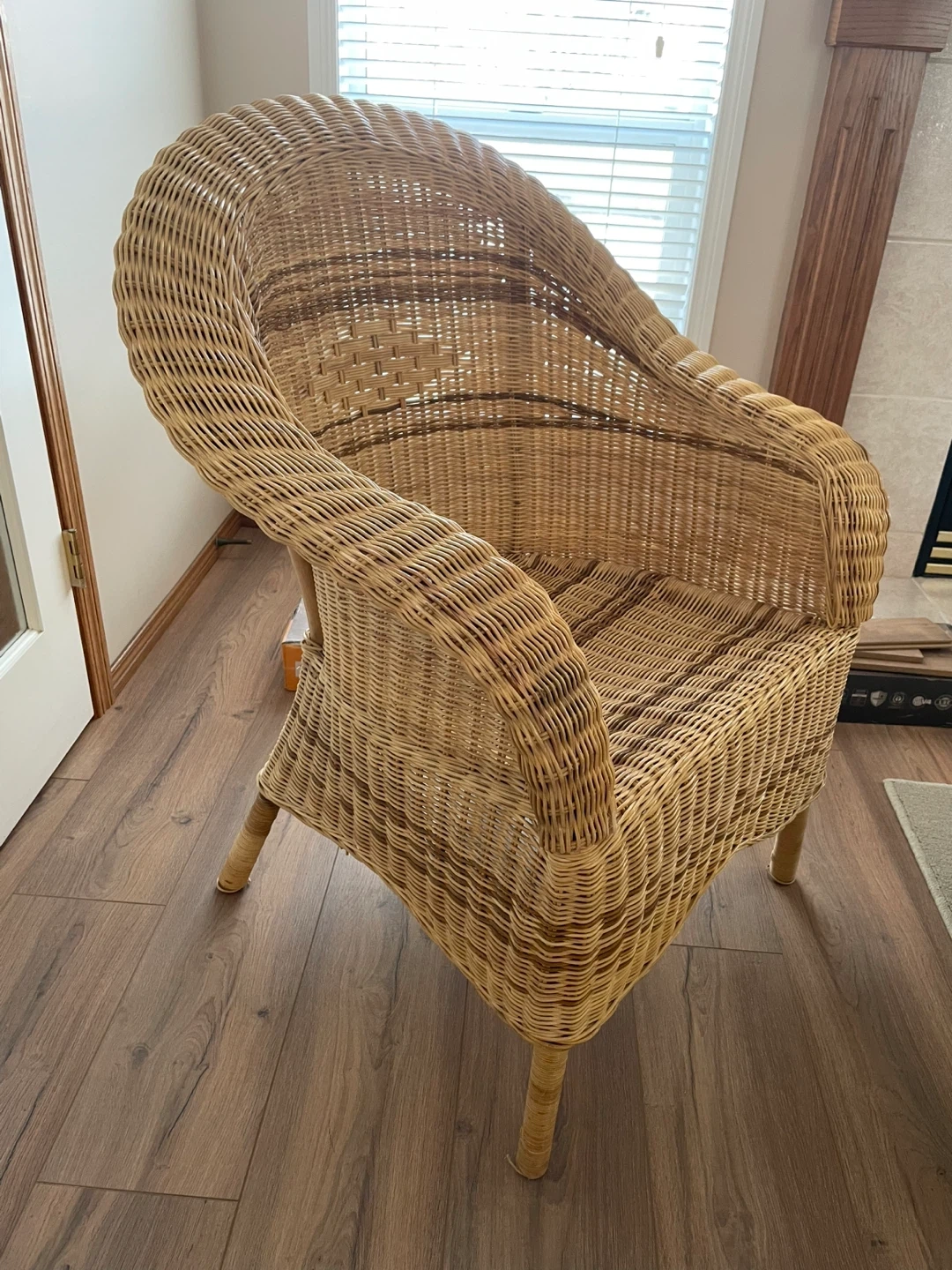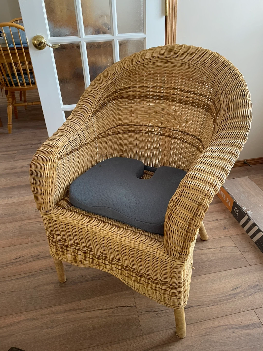 This accent chair is made from woven wicker. It includes a comfortable grey cushion. Its sturdy construction makes it a great addition to any room!
