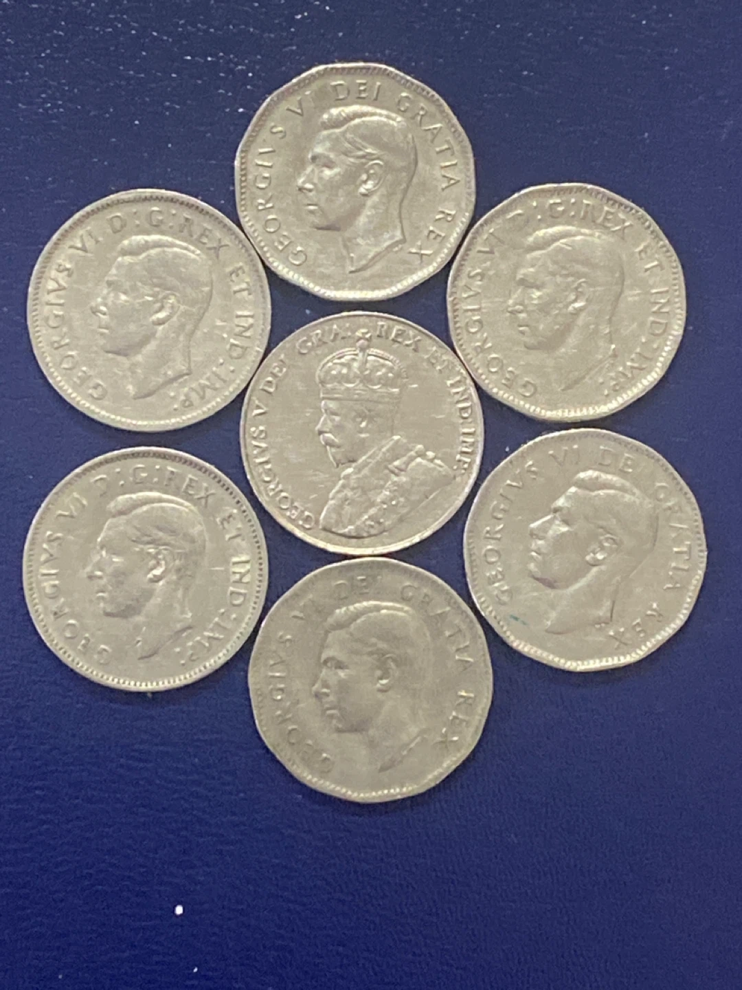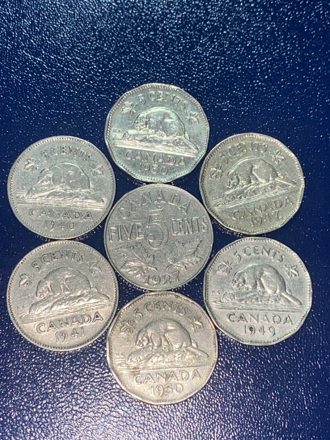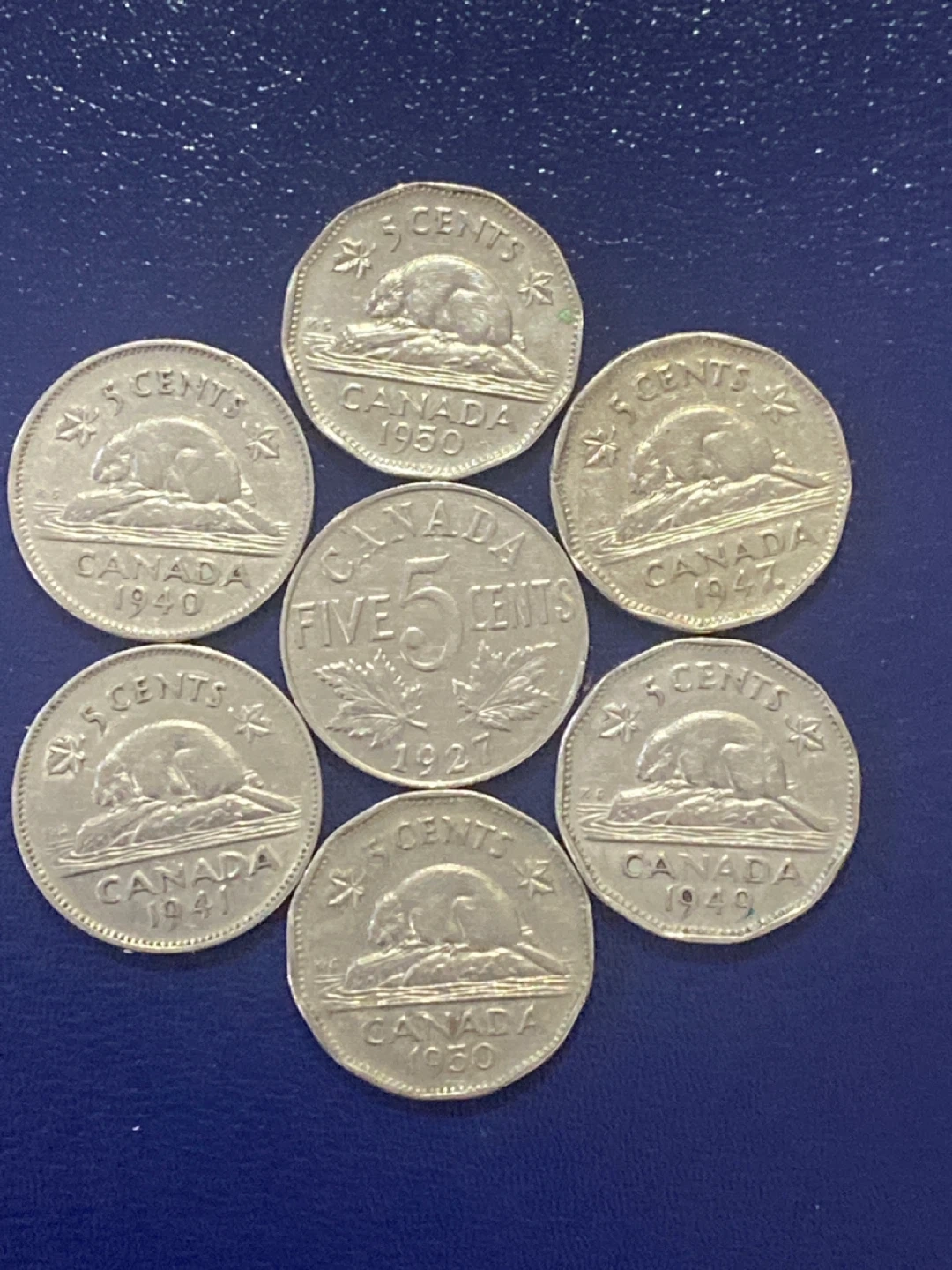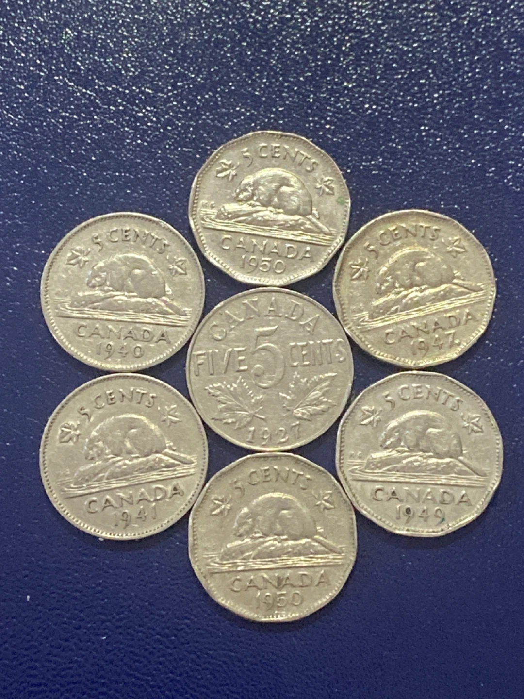 A collection of seven Canadian 5 cent coins featuring the beaver. Years include 1927, 1940, 1941, 1947, 1949, and two from 1950. These coins would be great for any coin collector. Metal composition: 99.5% nickel, 0.5% copper.