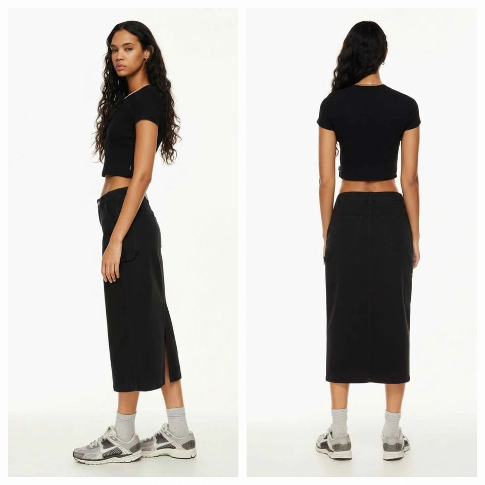 Details: This is a high-rise midi skirt featuring classic carpenter/utility details, including side patch pockets and a functional hammer loop. The Wash: Features Aritzia’s signature Trooper Wash (Garment Dye), which gives it a unique,
