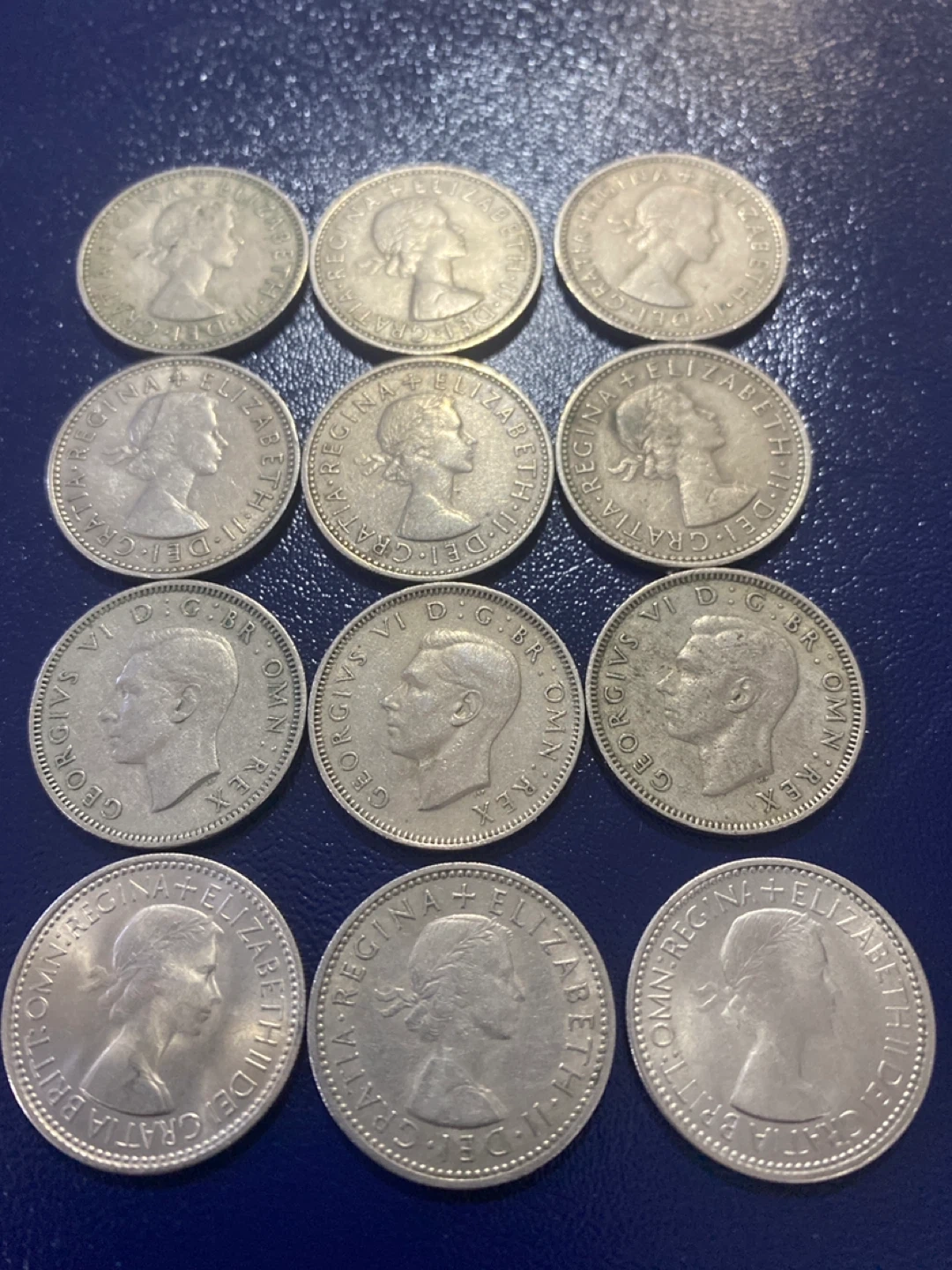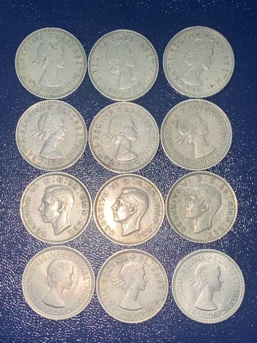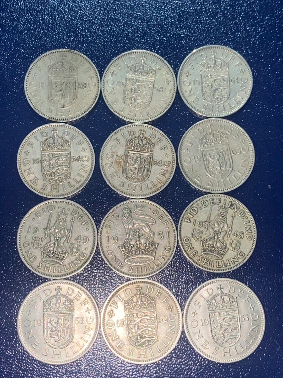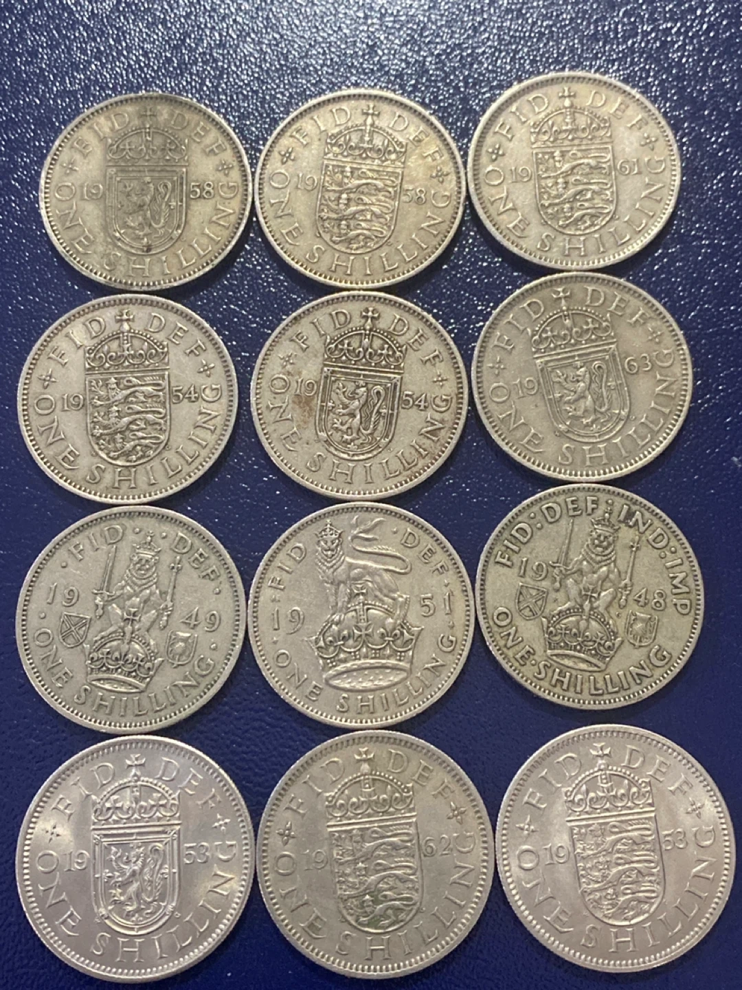 This collection features several British one shilling coins with various mint years. The coins show different monarchs, including Queen Elizabeth II and King George VI. A great addition for coin collectors!
