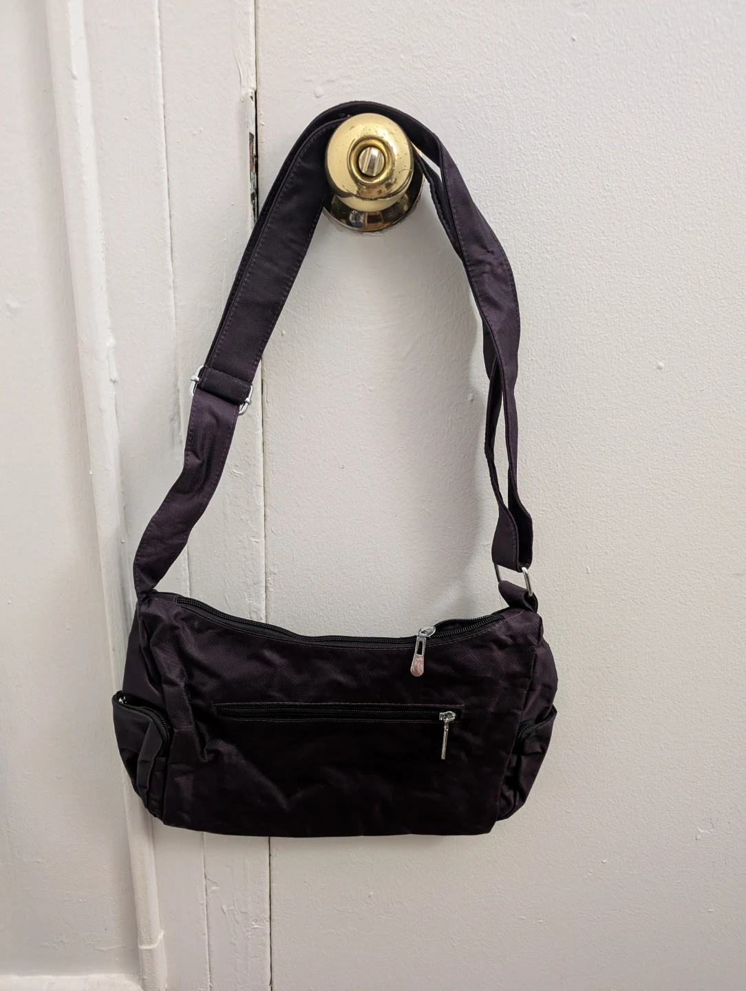 This purple crossbody shoulder bag has multiple zippered compartments. It's made of durable nylon fabric. This bag is perfect for everyday use!