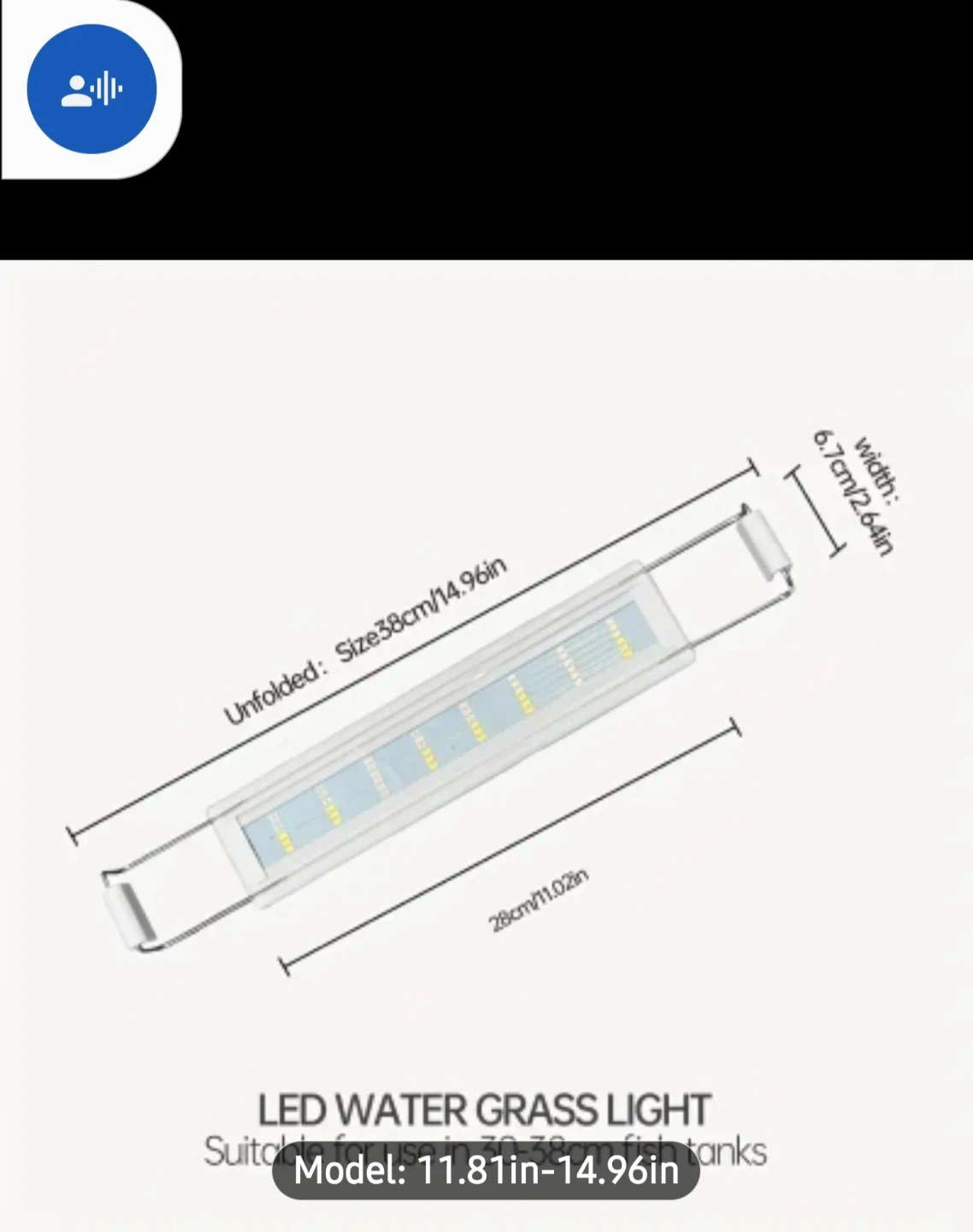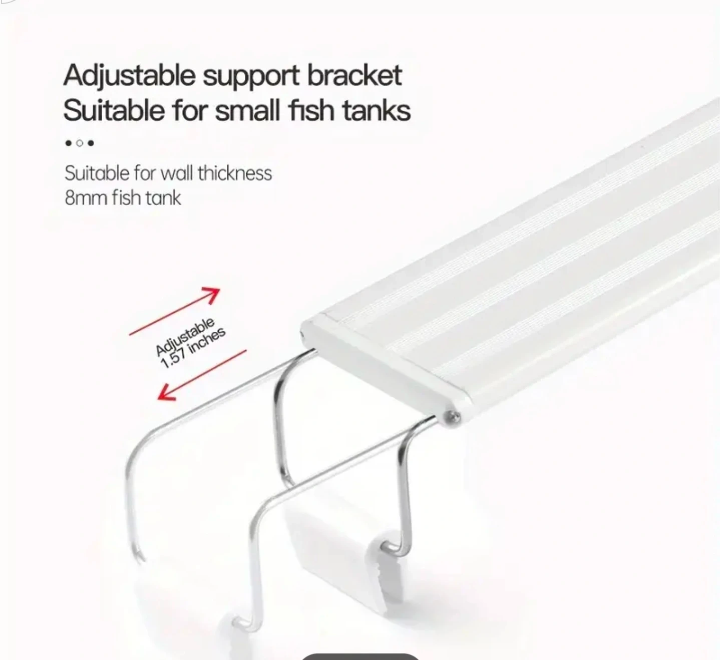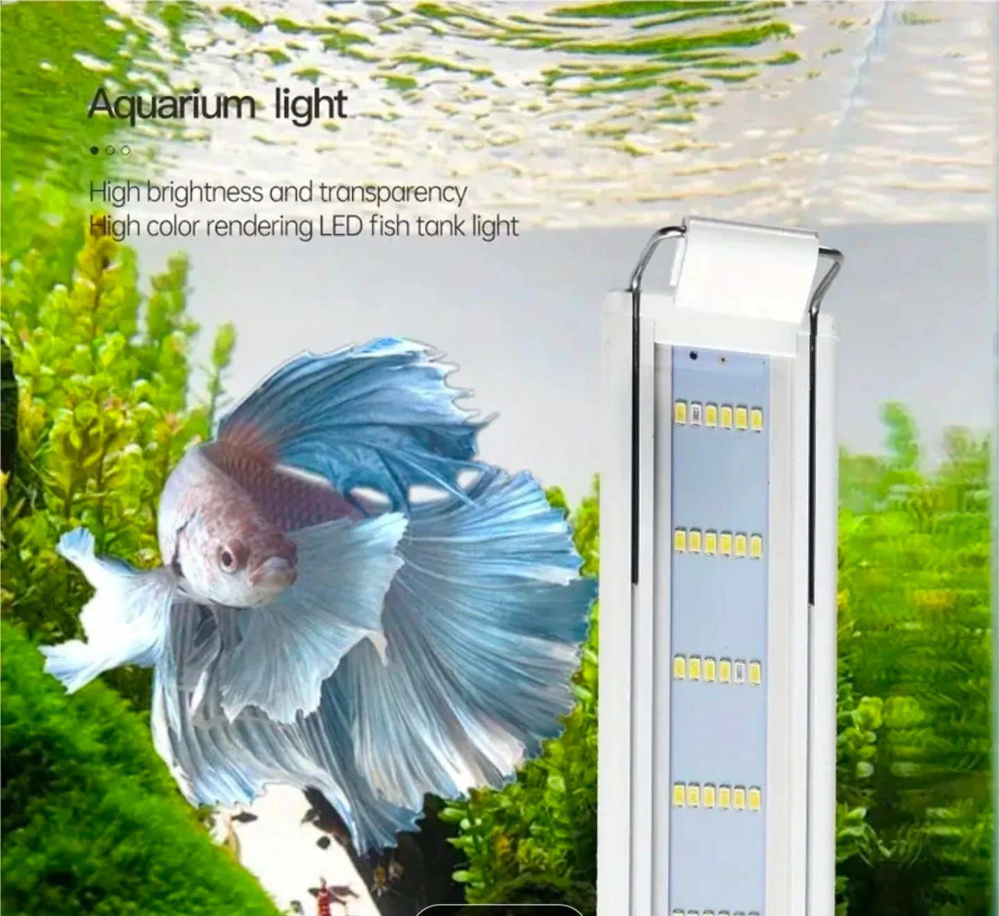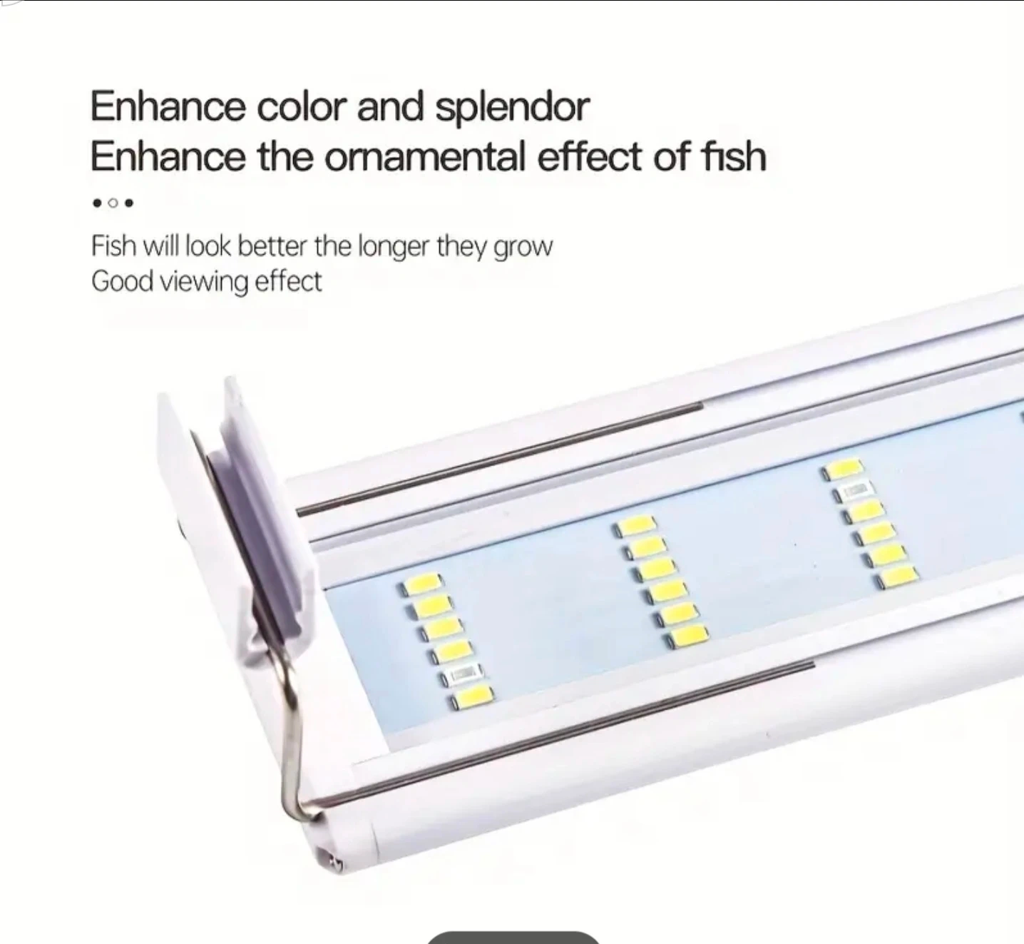 This is an aquarium LED light designed for fish tanks. It offers high brightness and color rendering. The light features an adjustable support bracket suitable for tanks with an 8mm wall thickness. It's perfect for small fish tanks 10 to 15 gallons.