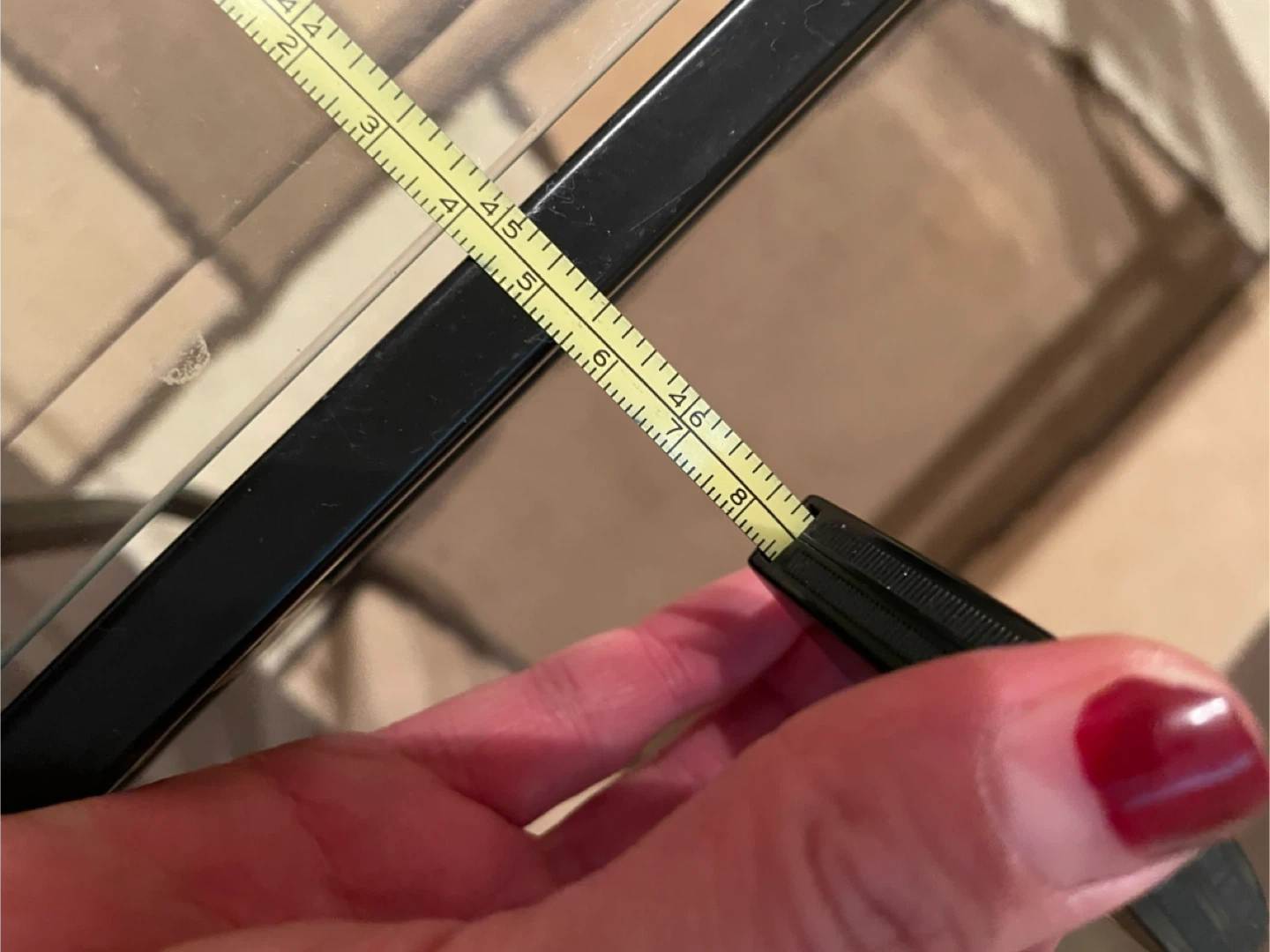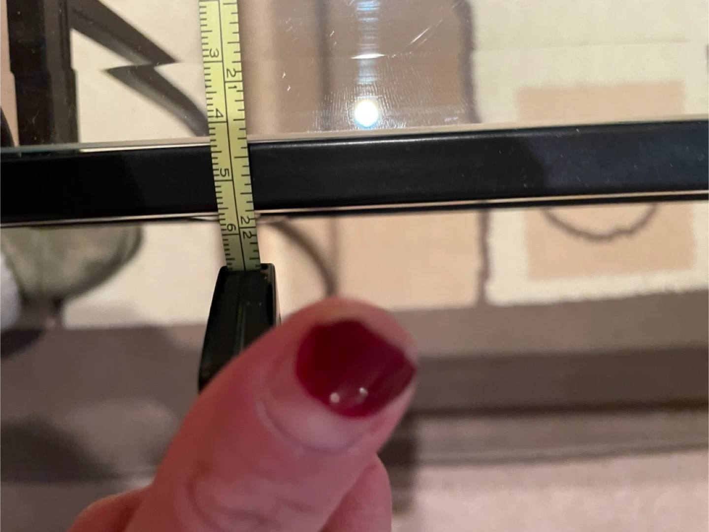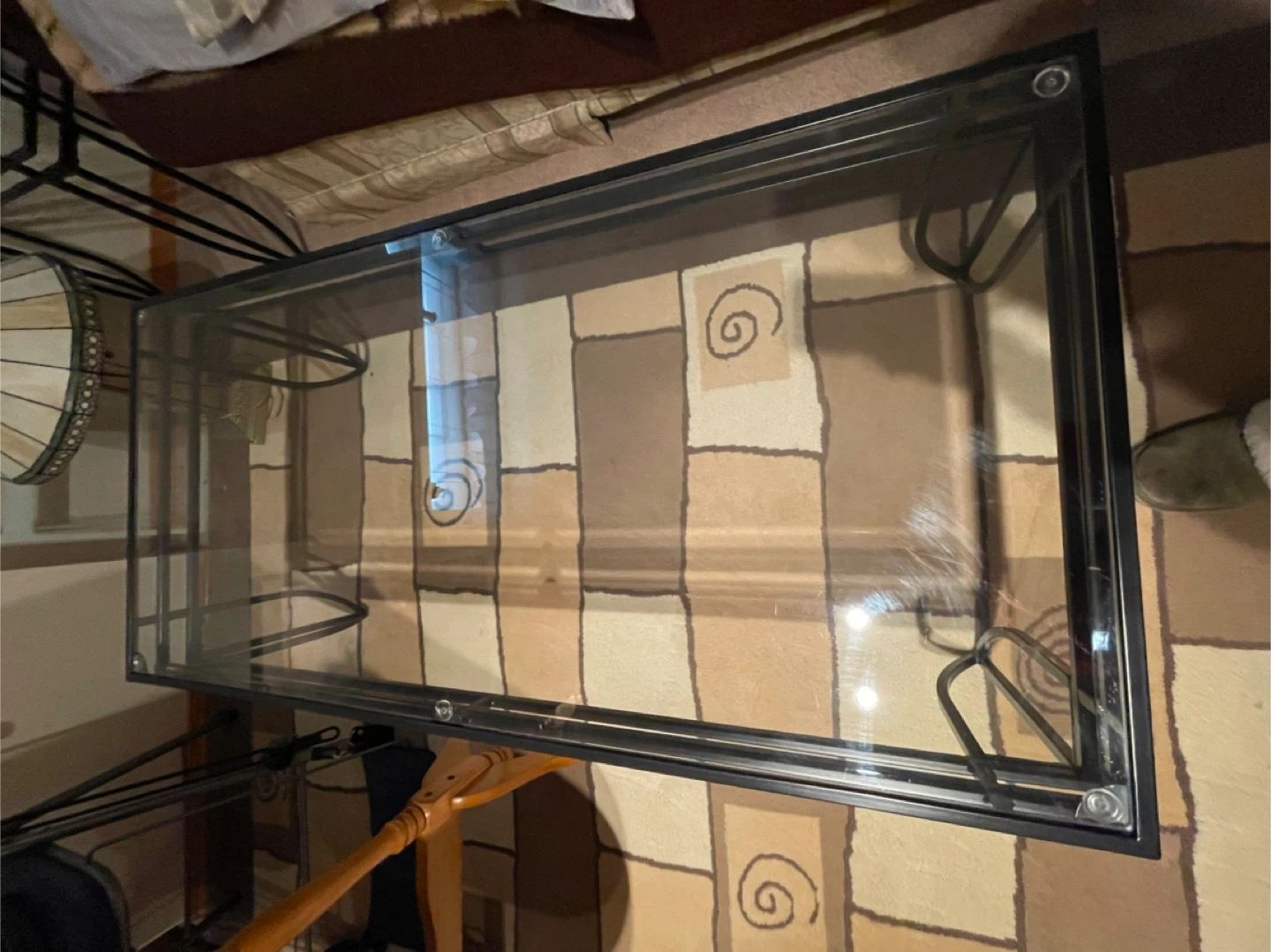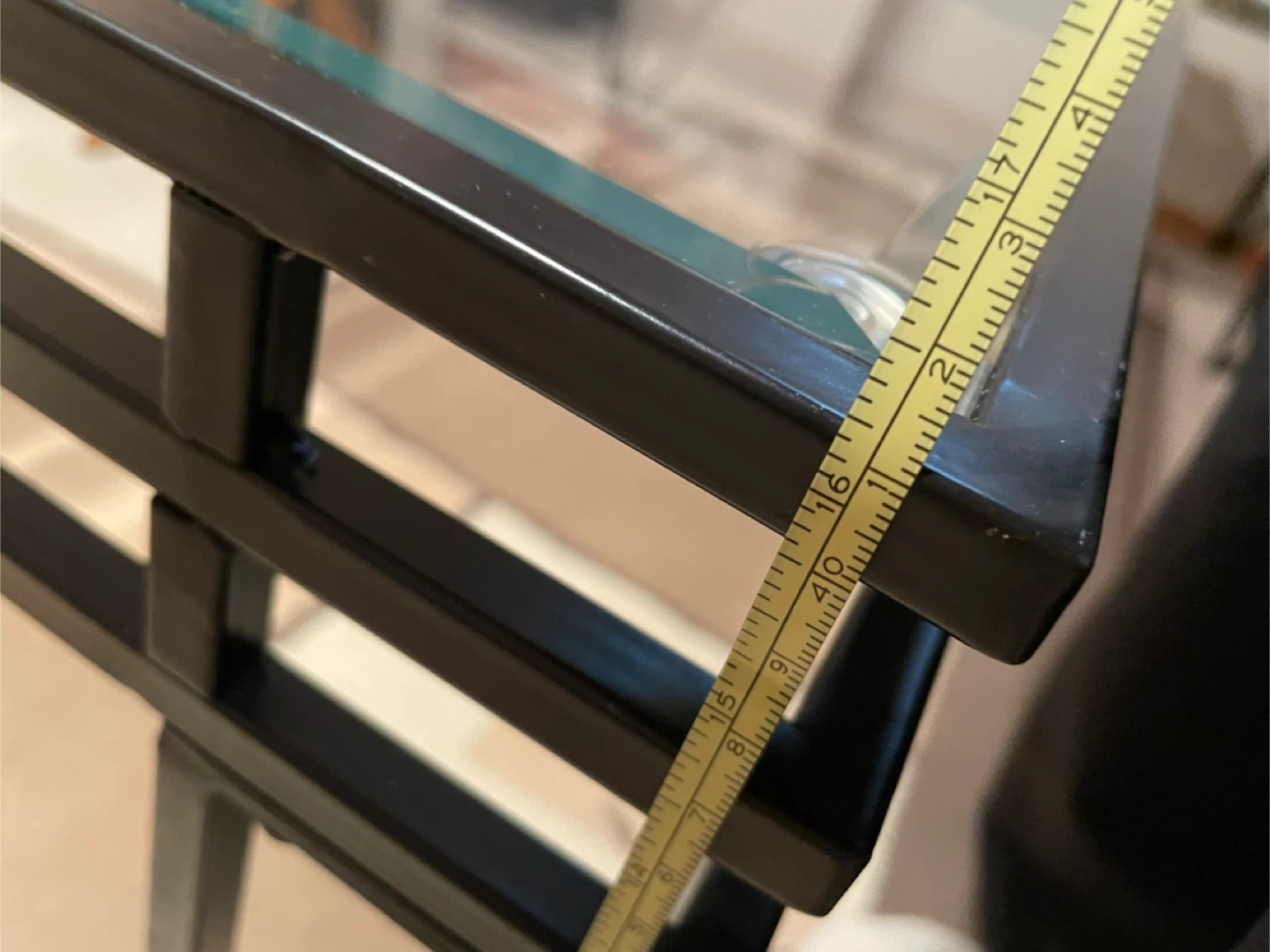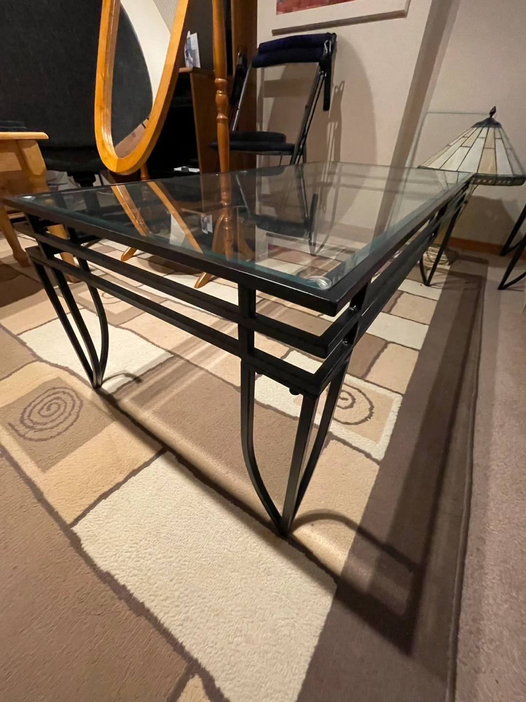 Rectangular coffee table featuring a clear glass top and a black metal frame with unique legs. The glass surface measures approximately 45 inches long and 22 inches wide and 16 inches tall. This table's sleek design fits well in most living rooms.