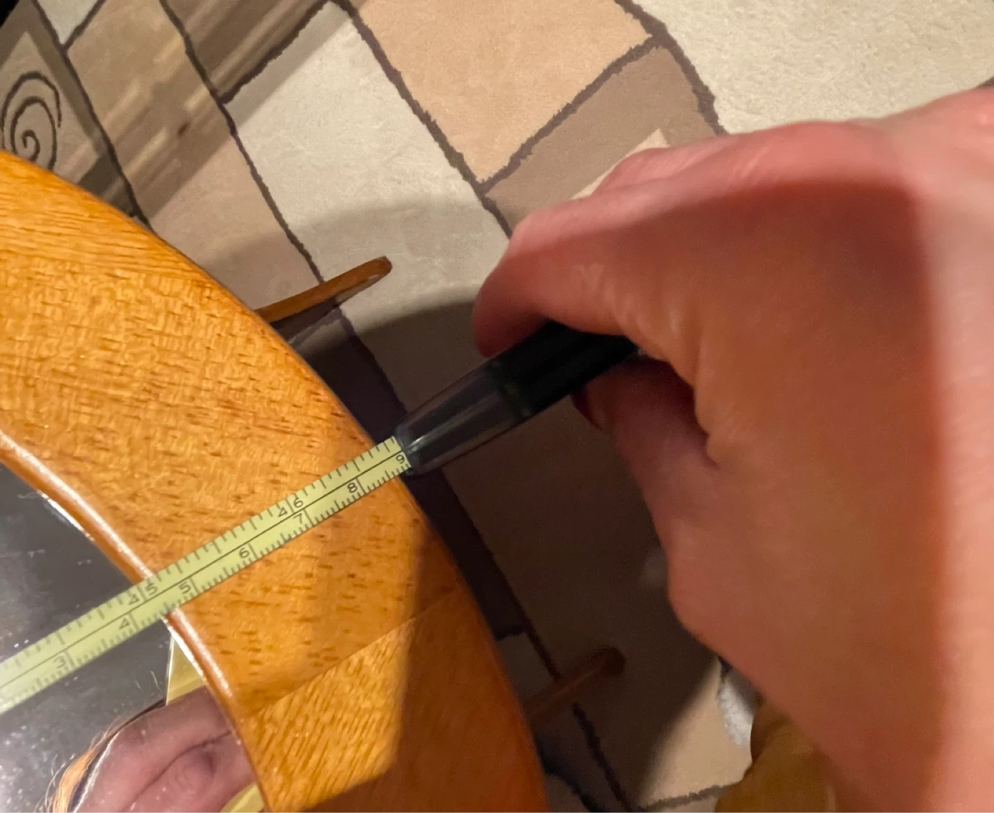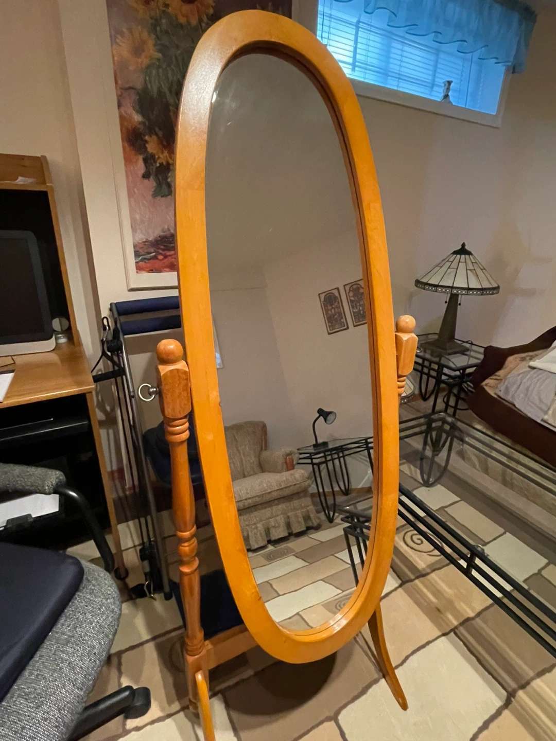 Oval standing mirror with a light wood finish. Its frame is made of wood. This mirror's dimensions are approximately 12 inches wide by 47 inches tall. 58 inches from floor to top.