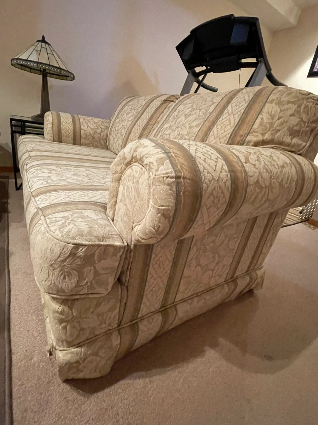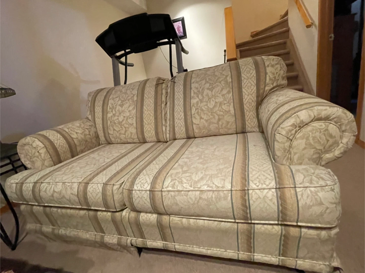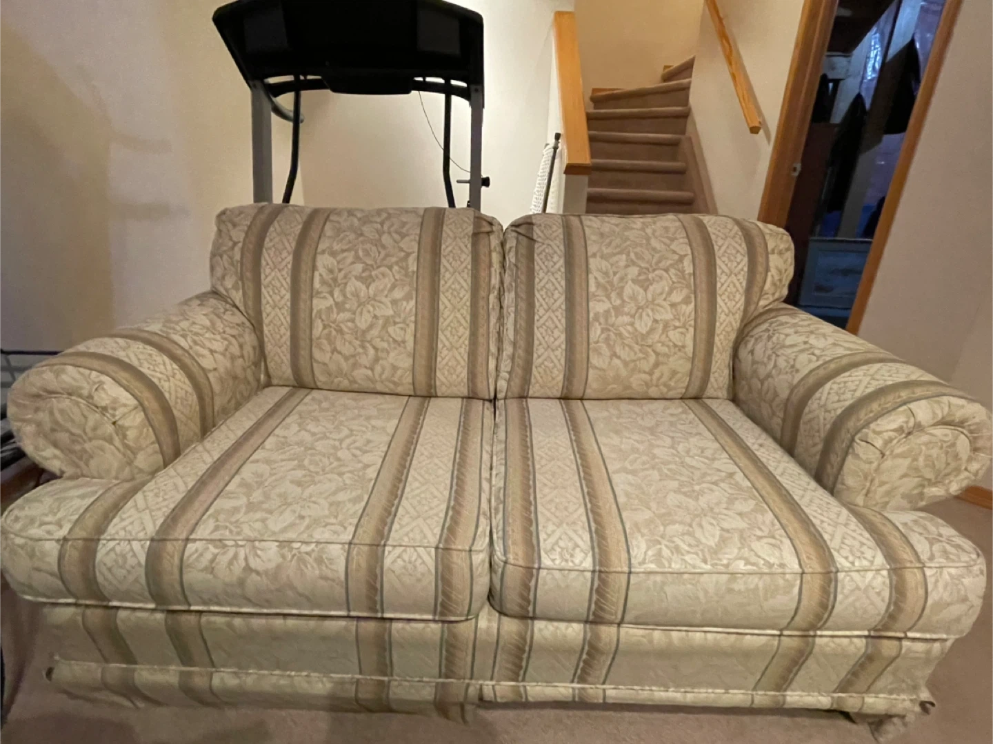 This is a two-seater sofa with a cream-coloured fabric featuring a floral and striped pattern. It has plush cushions and rolled arms. It's a comfortable addition to any living space. Very comfortable!
