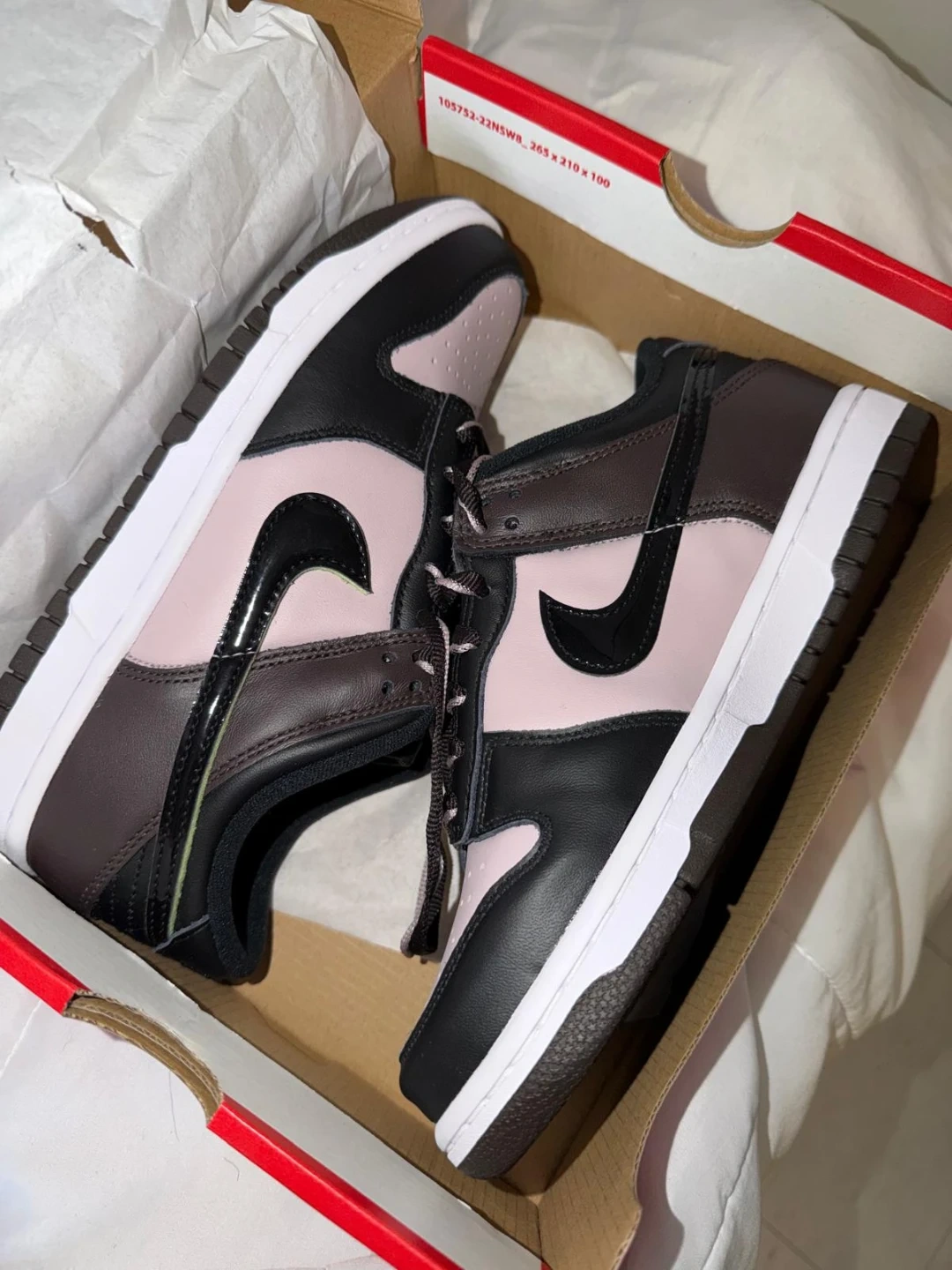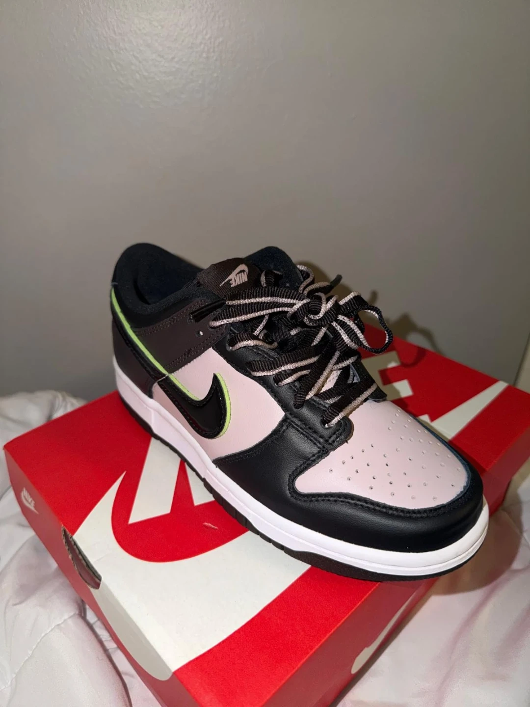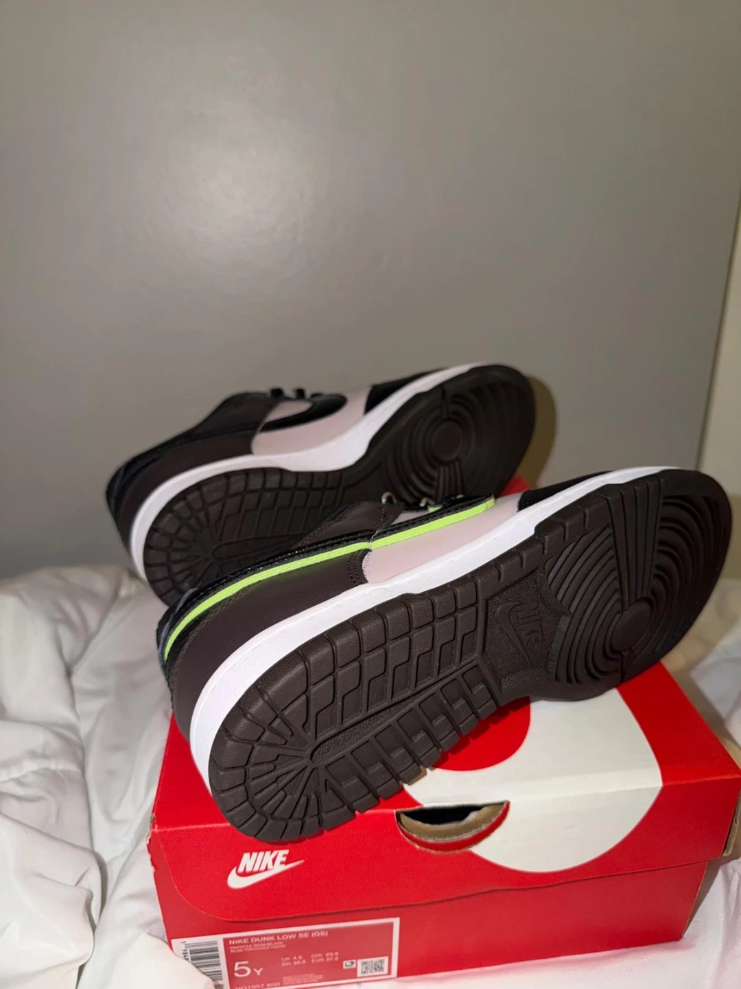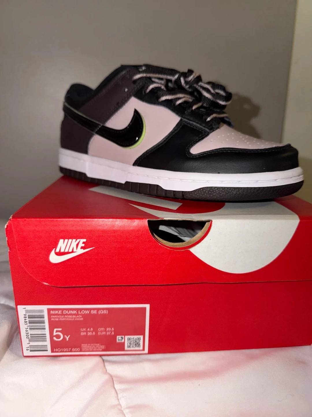 These Nike Dunk Low SE shoes come in a youth size grade school 5Y. They're a stylish blend of particle rose, black, and brown with a pop of lime green accent. Includes original box.
