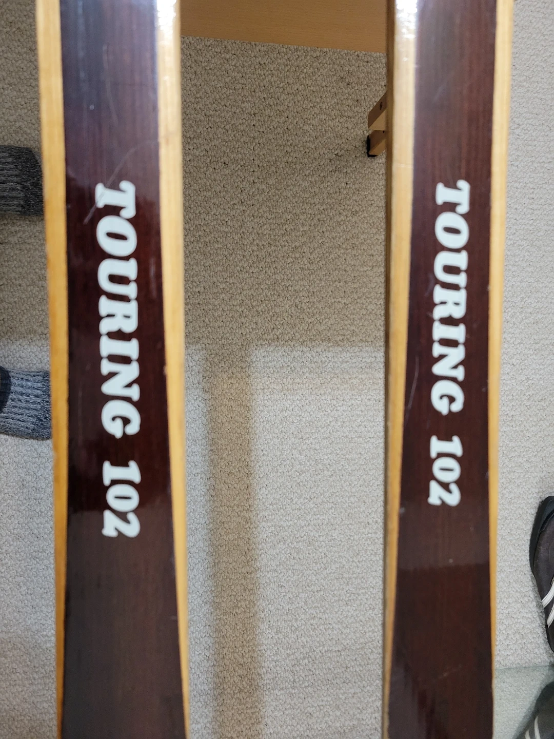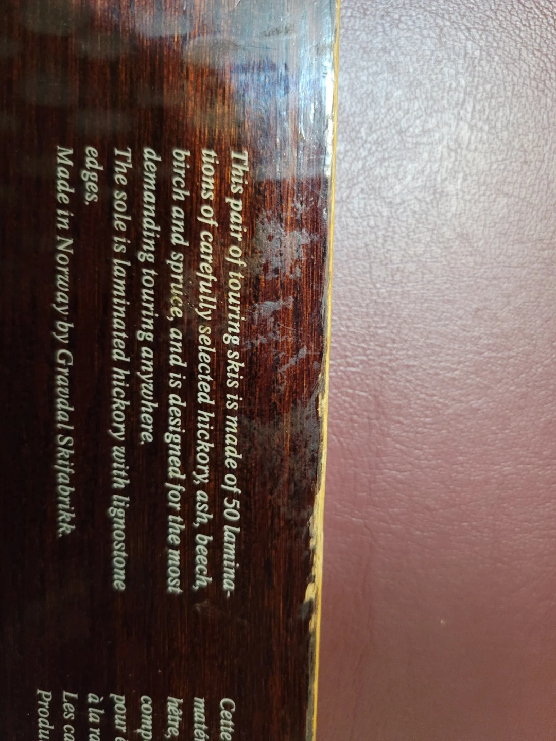 This pair of touring skis is made of 50 laminations of carefully selected hickory, ash, beech, birch, and spruce. They're designed for the most demanding touring anywhere. The sole is laminated hickory with lignostone edges. Made in Norway by Gravedal Skifabrikk. Very durable. 205 cm. long, 6 cm. wide. Will include a variety of waxes and scrapers.