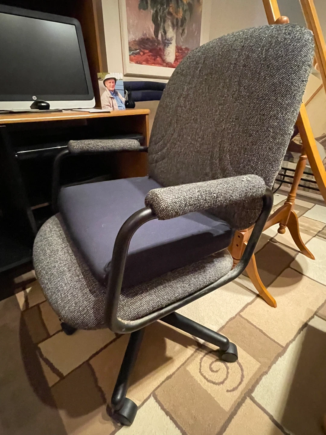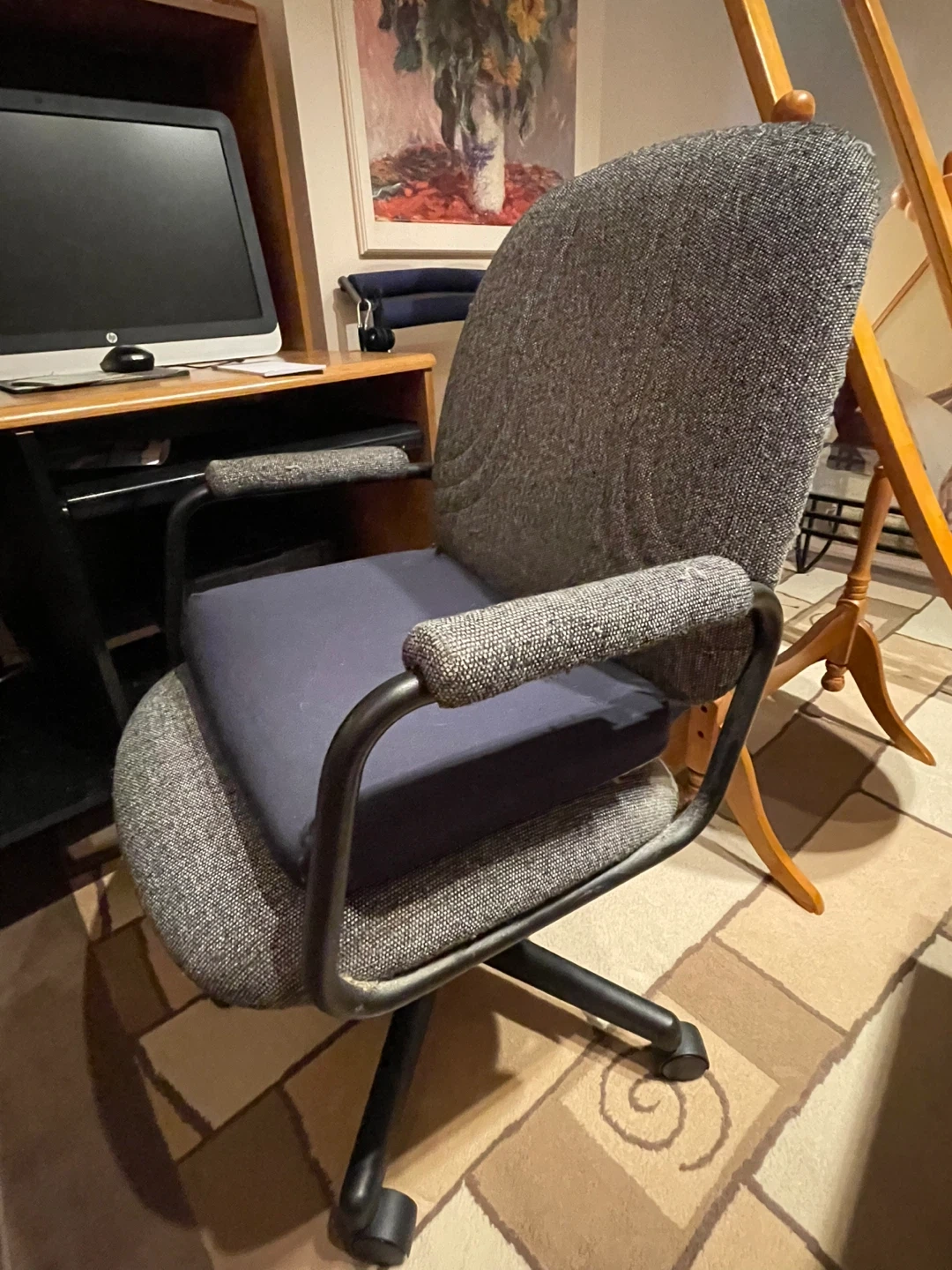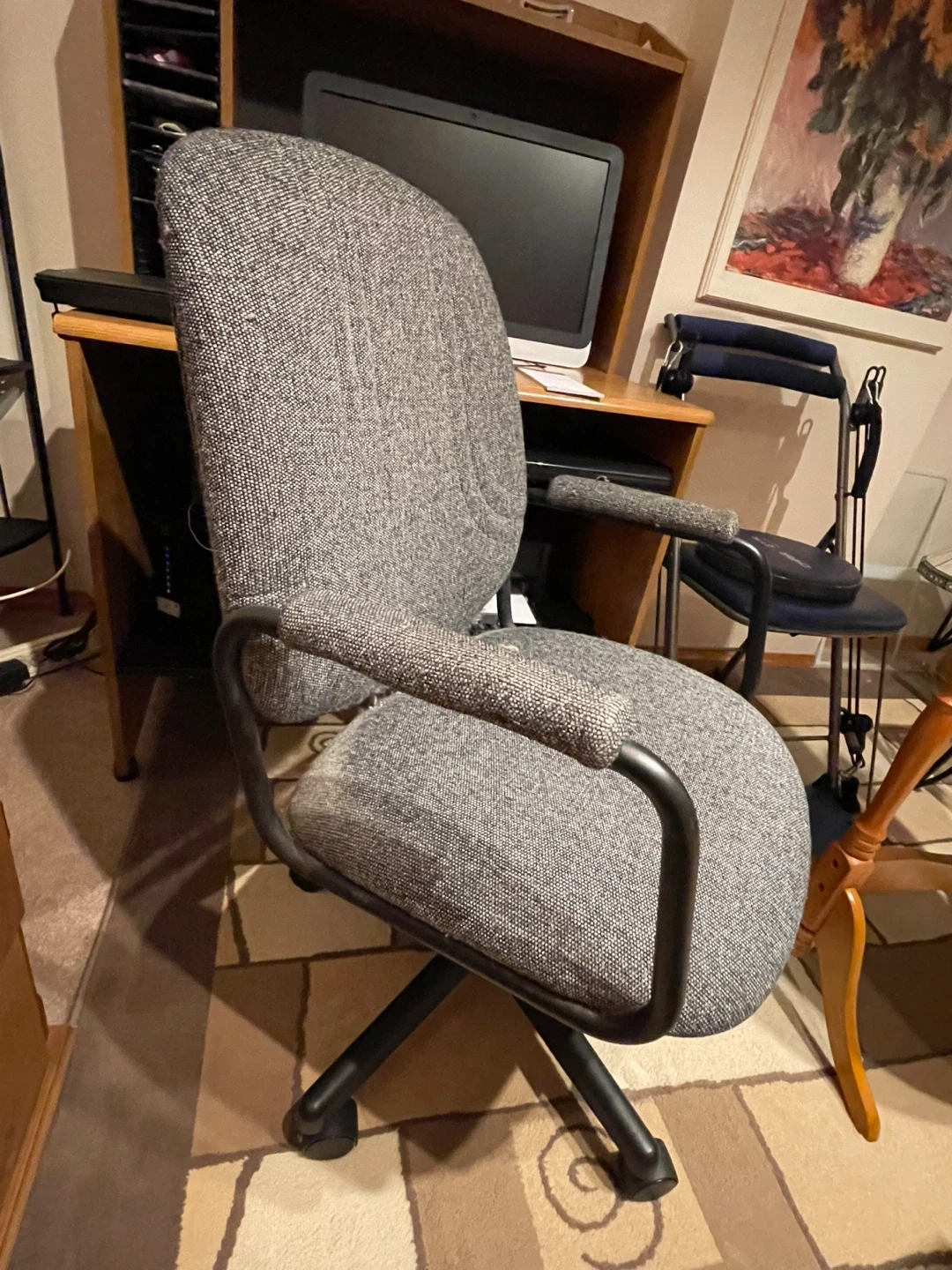 This office chair features a grey tweed-like fabric upholstery and padded armrests. It has a swivel base with casters for easy mobility. Perfect for a home office or workspace.
