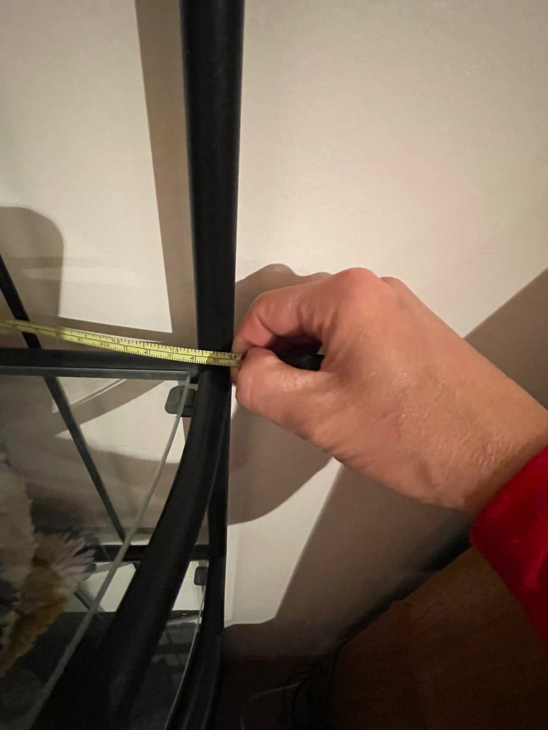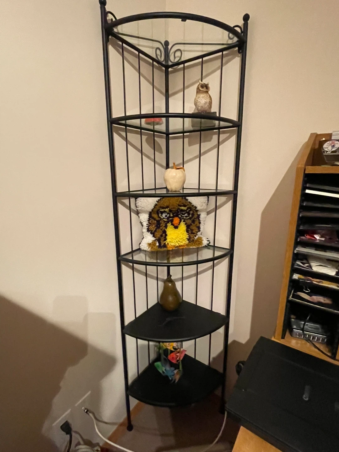 This is a black metal corner shelf unit with glass shelves. It has four tiers and a decorative top. Perfect for displaying small items or plants. The unit is approximately 70 inches tall and 14” corner to edge.