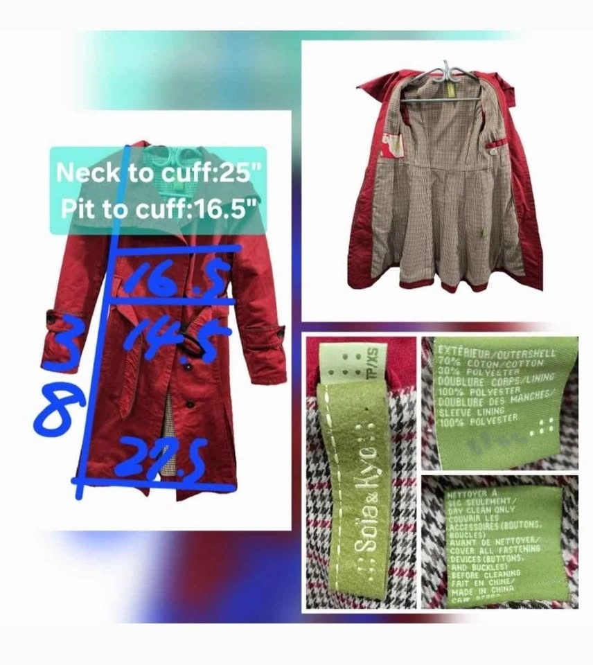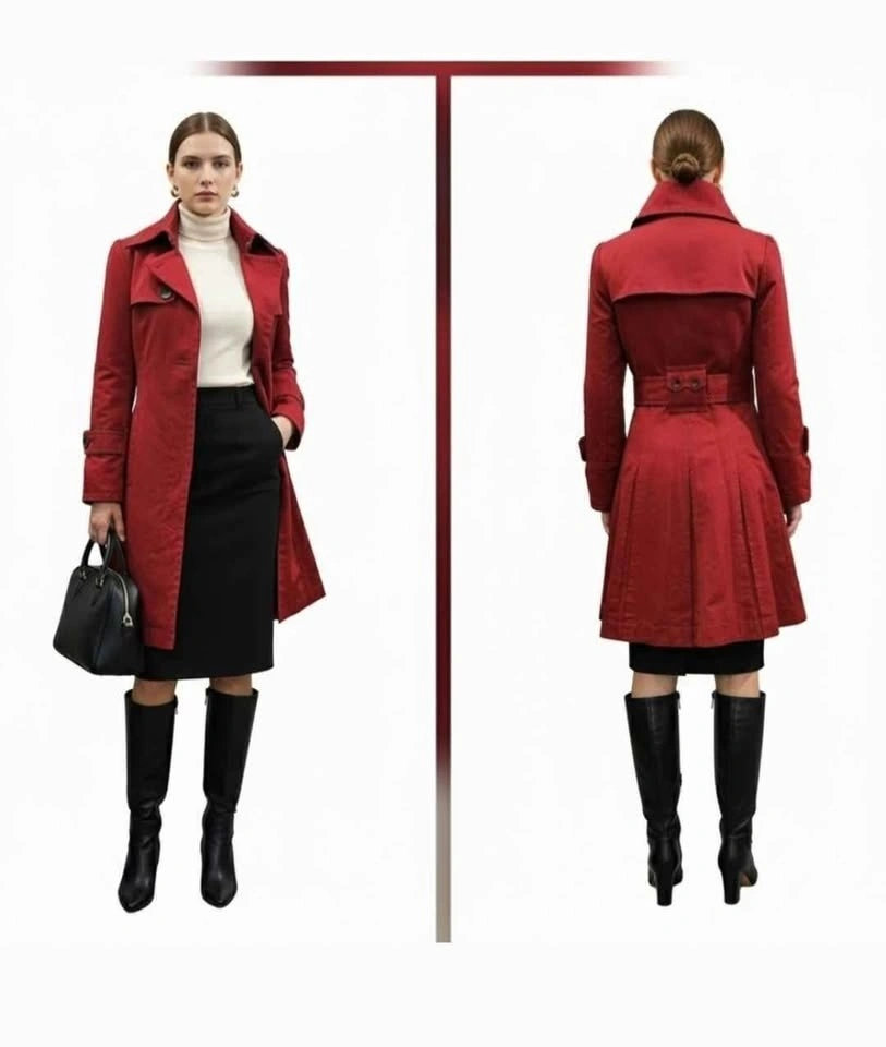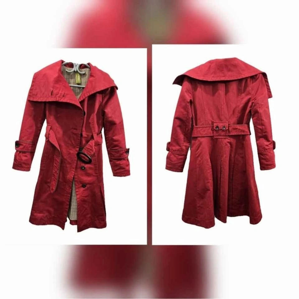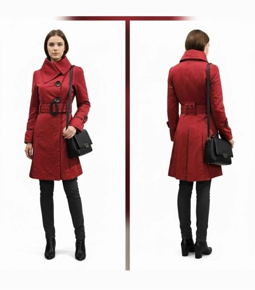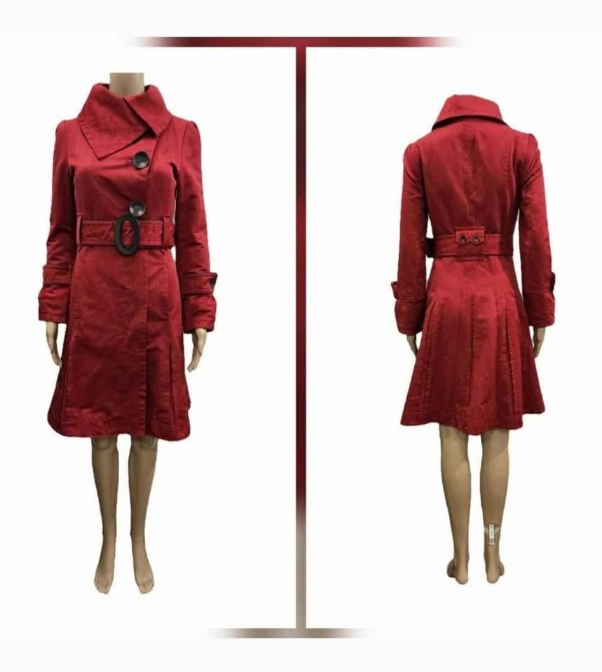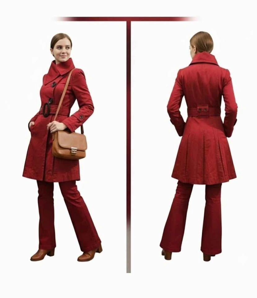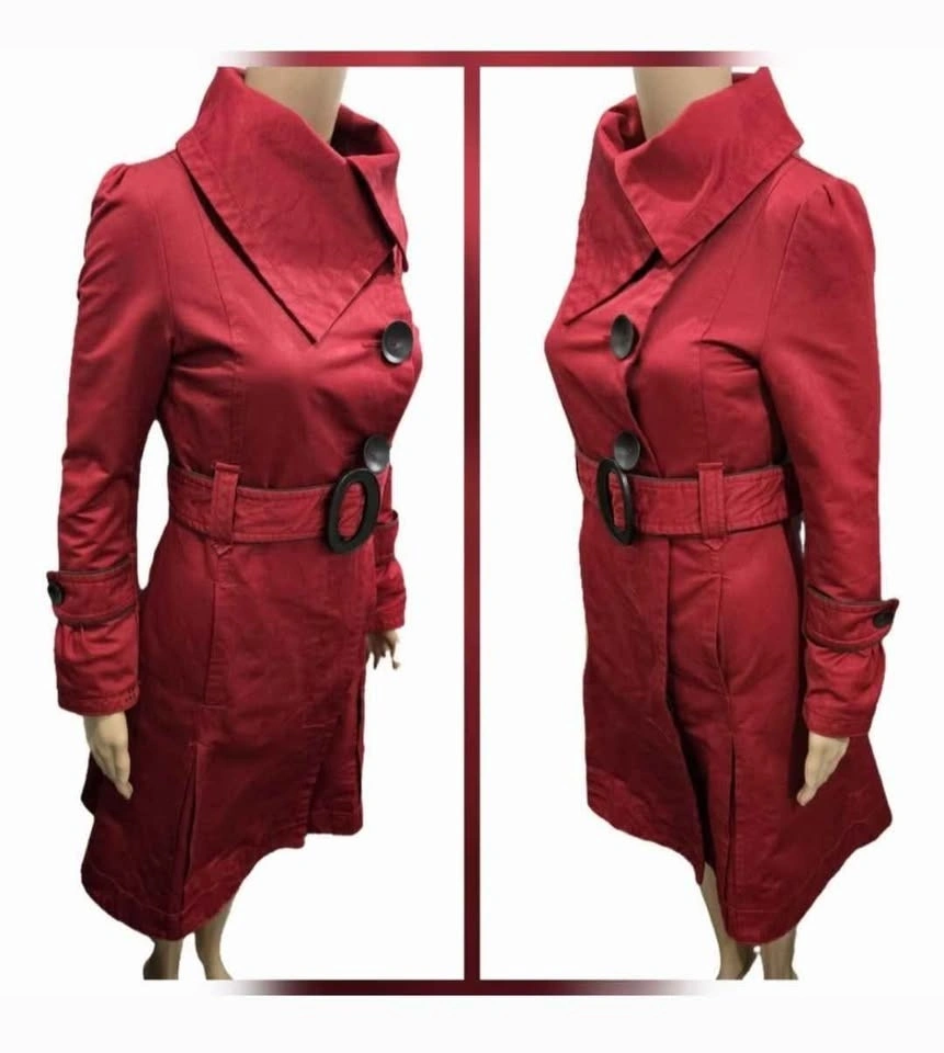 Asymmetrical button closure, removable belt, two side pockets and one lining pocket for storage. Knee-length. Perfect for early spring and fall through late fall.