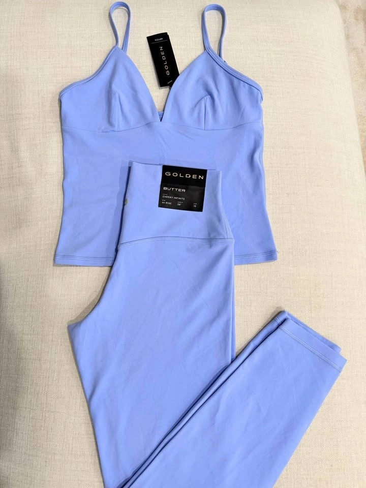 Brand new with tags. Colour: Dayflower Blue. Butter Vibrant Tank size M, Butter Cheeky Infinite Hi-Rise 26" Legging size 10. Pick up 130 King St W or Bronte & Dundas, Oakville. Can also meet in Mississauga only on my schedule. Check out my listings for other Aritzia items.