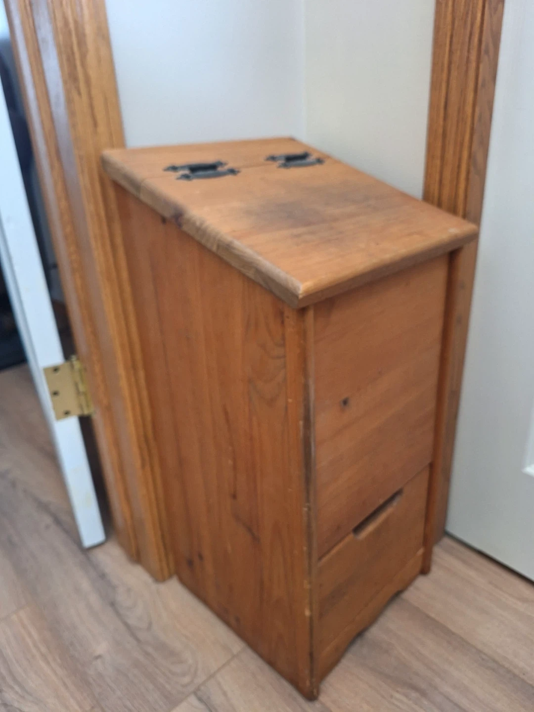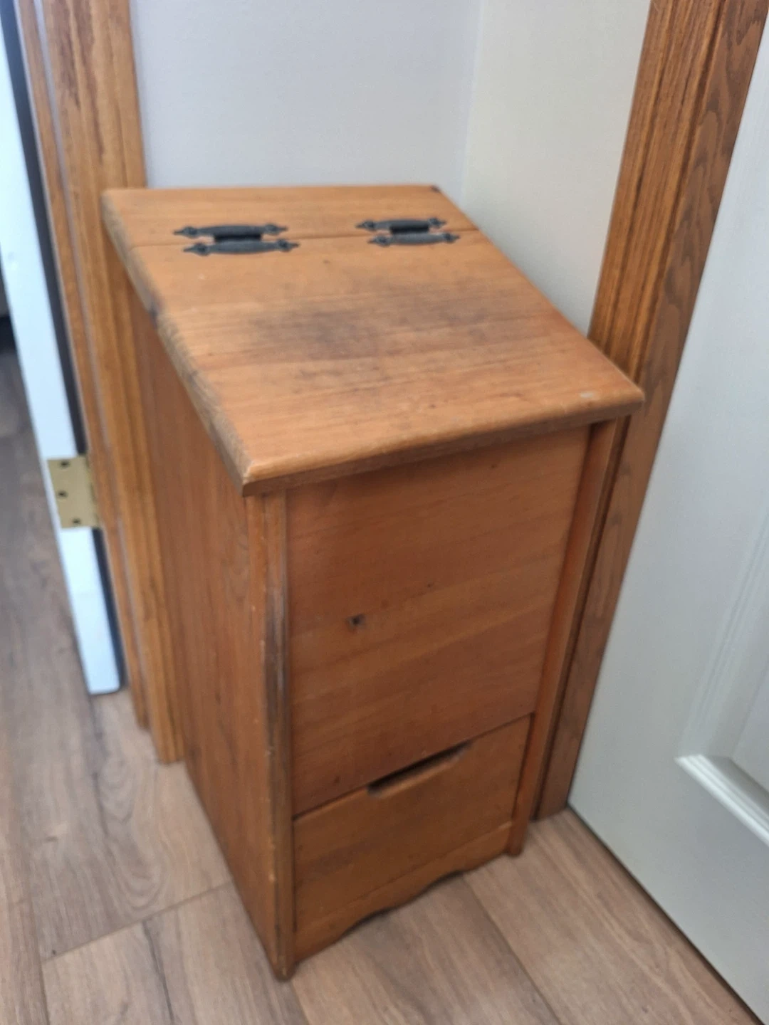 This wooden kitchen bin features a hinged lid and a lower drawer for added storage. It's made of wood with metal hardware. This bin would be useful for organizing kitchen waste or storing household items.