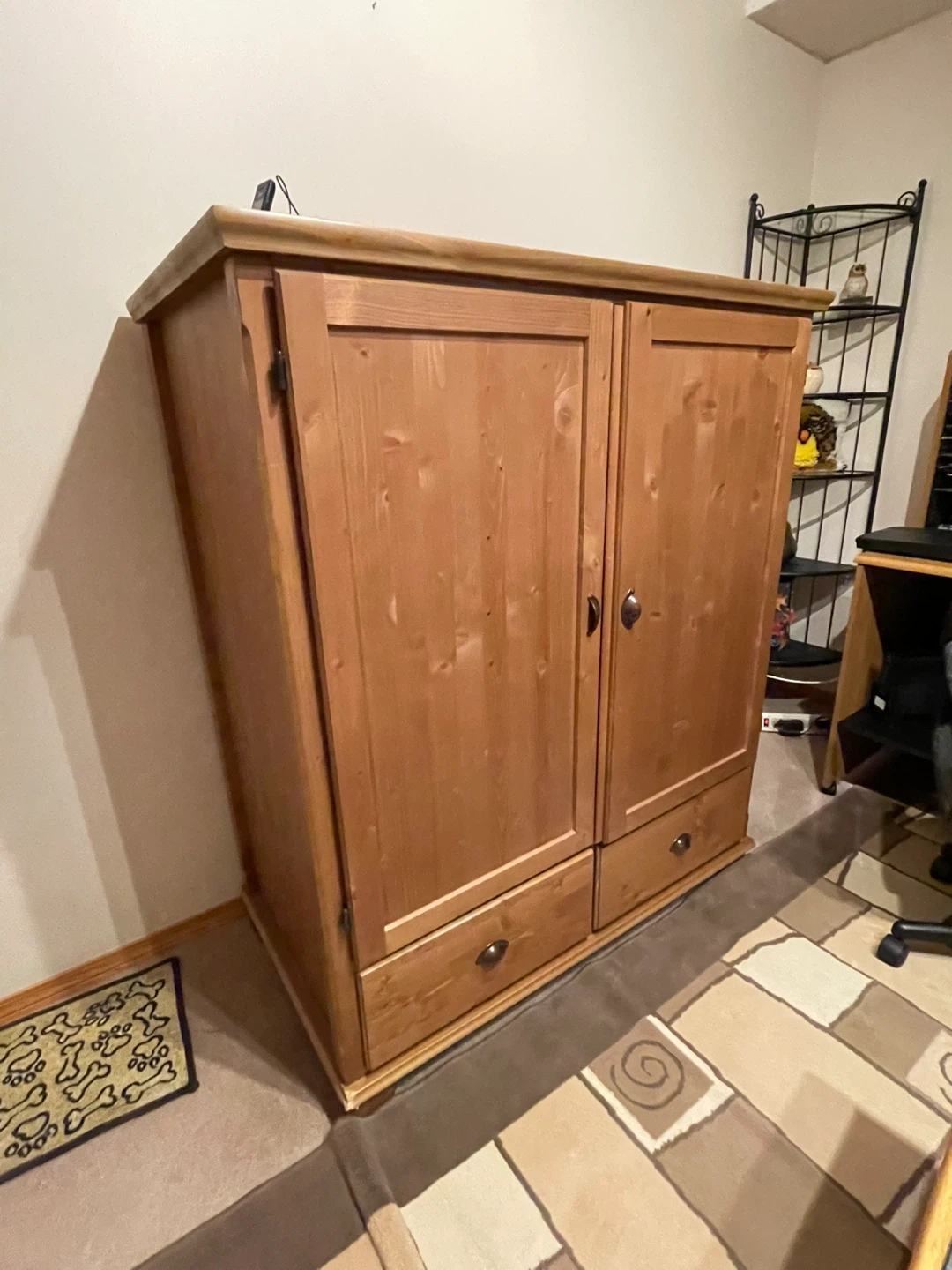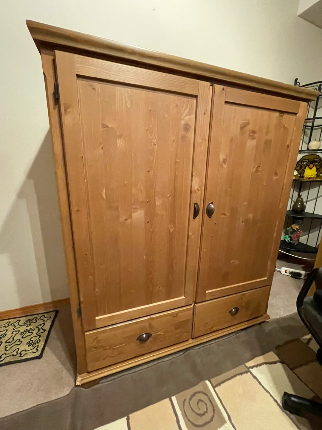 Solid wood cabinet with double doors and two bottom drawers. Dimensions are approximately 52 inches high, 40 inches wide, and 24 inches deep. Offers ample storage space!