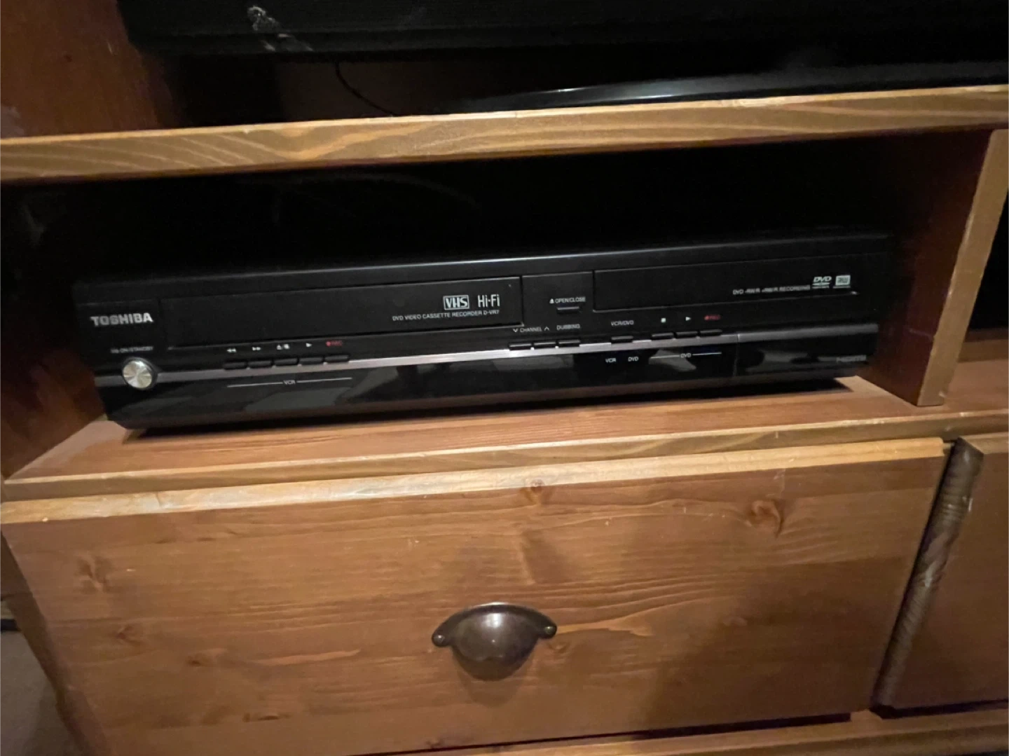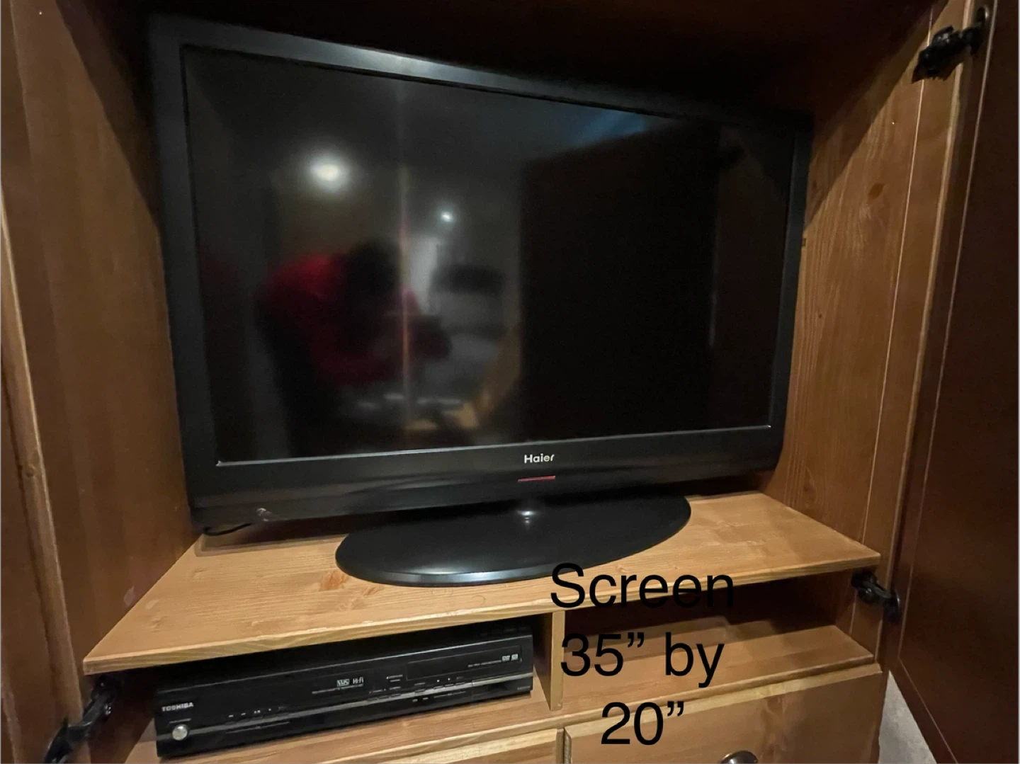 This Haier television has a 35-inch screen. It's paired with a Toshiba DVD and VHS combo player. This setup is great for enjoying your favourite movies and shows!