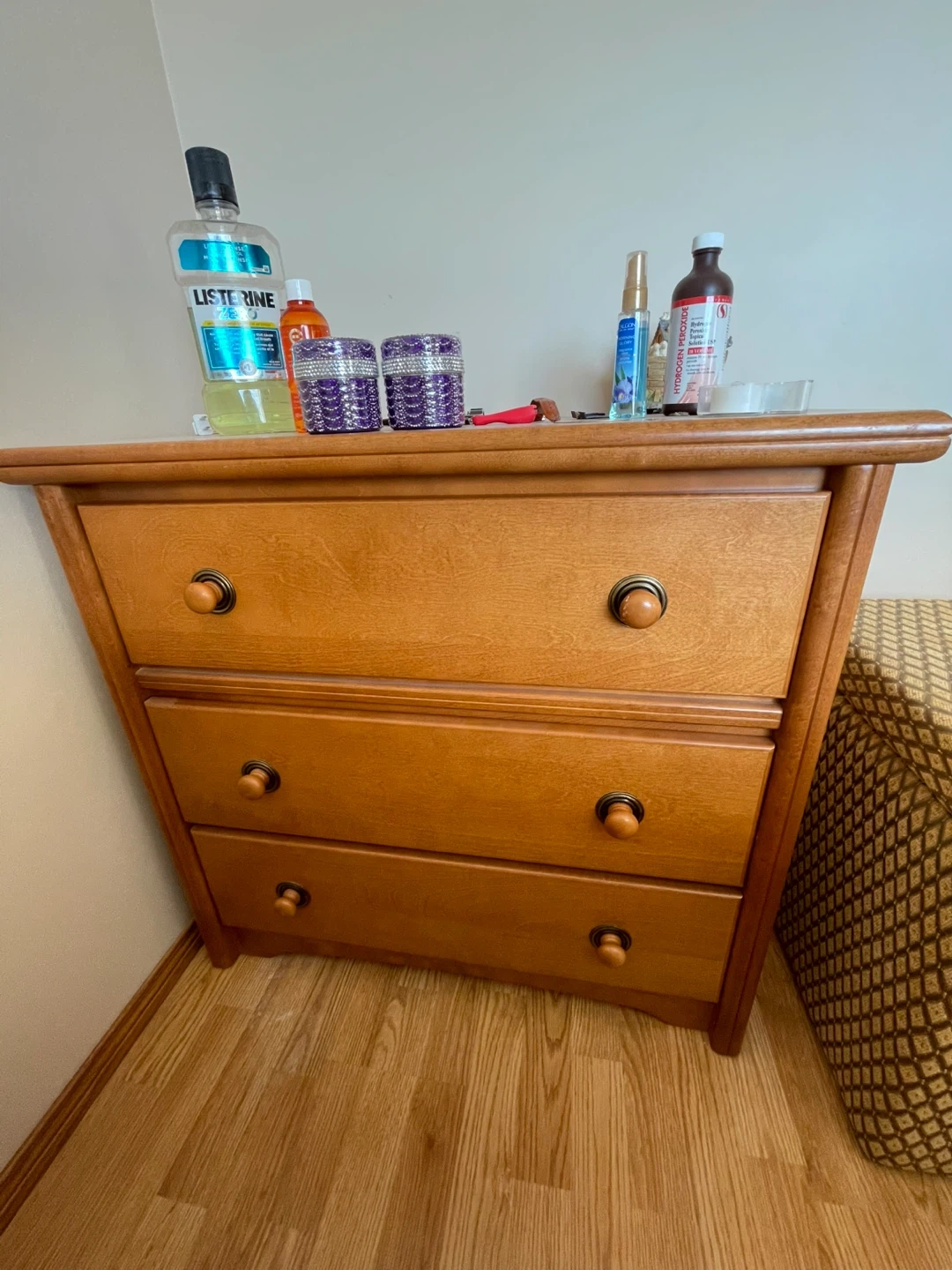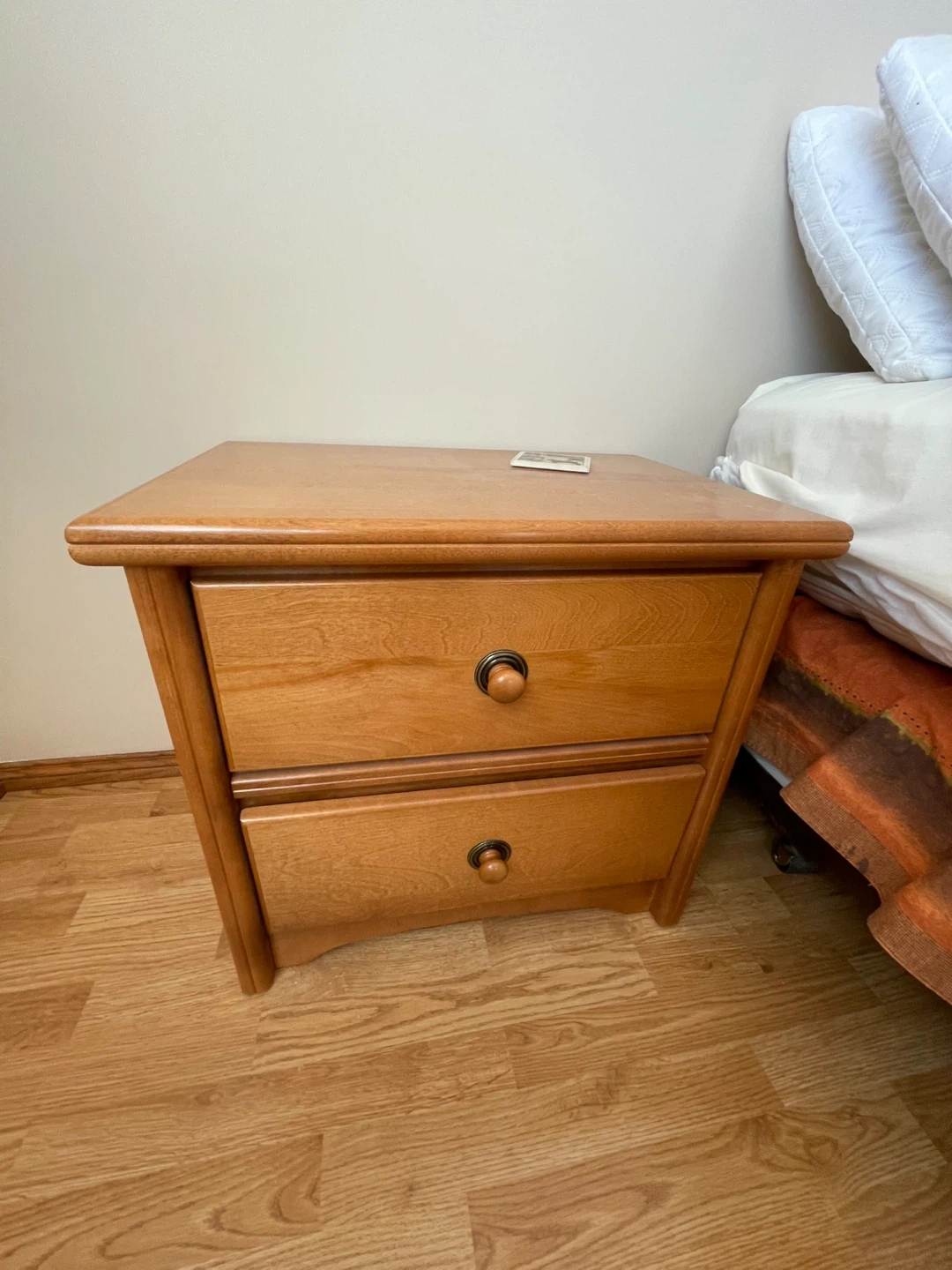 A sturdy wooden dresser and nightstand featuring two drawers for storage. Its natural wood finish complements most bedroom decor. Perfect for keeping essentials close by your bedside.