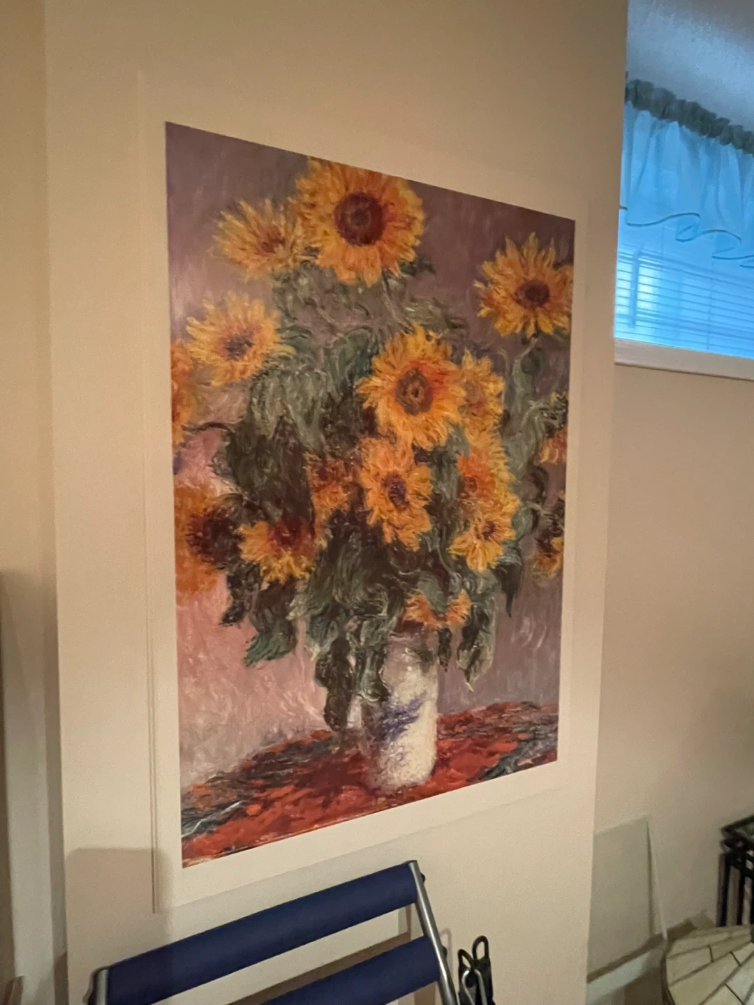 This is a print of Claude Monet's famous Sunflowers painting. It depicts a vibrant bouquet of sunflowers in a vase, rendered in a classic Impressionist style. The print itself has a framed border and is ready to hang.