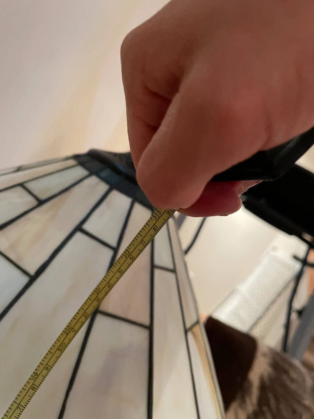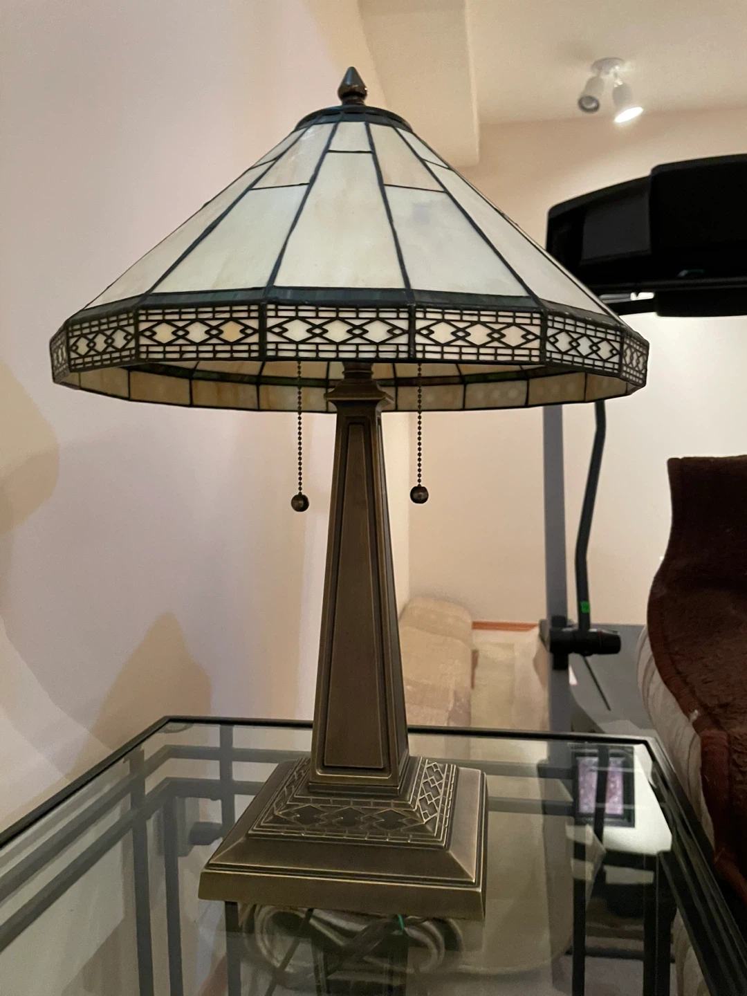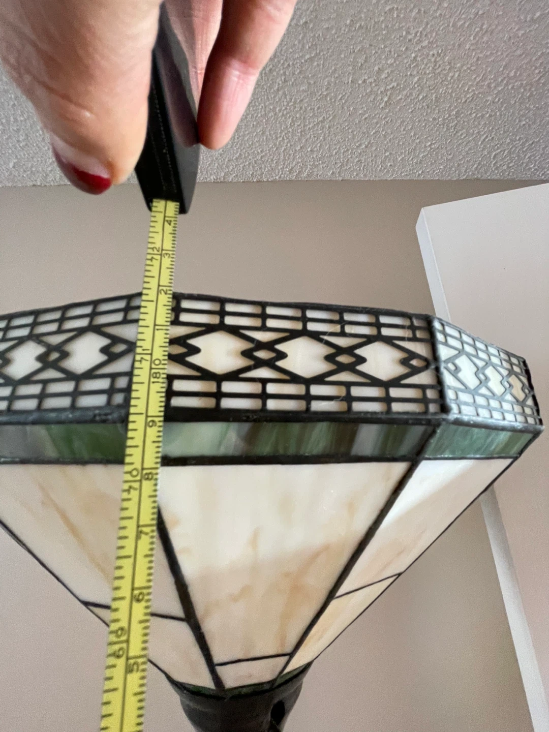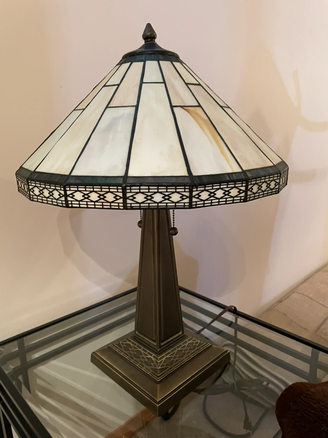 Two Beautiful Tiffany style table lamps along with a tall lamp with stained glass shades. These lamps have a decorative base and pull chains for operation. They are classic pieces that add warmth and style to any room. The table lamp shades measures approximately 23” tall and 21” wide. Lamp base is 7.5” wide. Tall lamp is 71” tall.