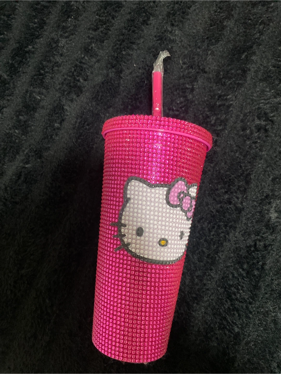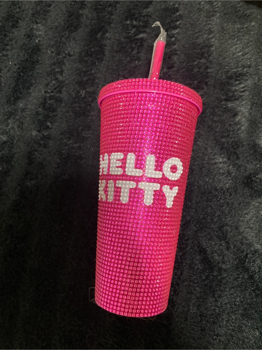 Sparkly pink tumbler adorned with rhinestones and a Hello Kitty graphic. It comes with a matching pink straw. This cup adds a fun touch to your drinkware! Pick up cash only