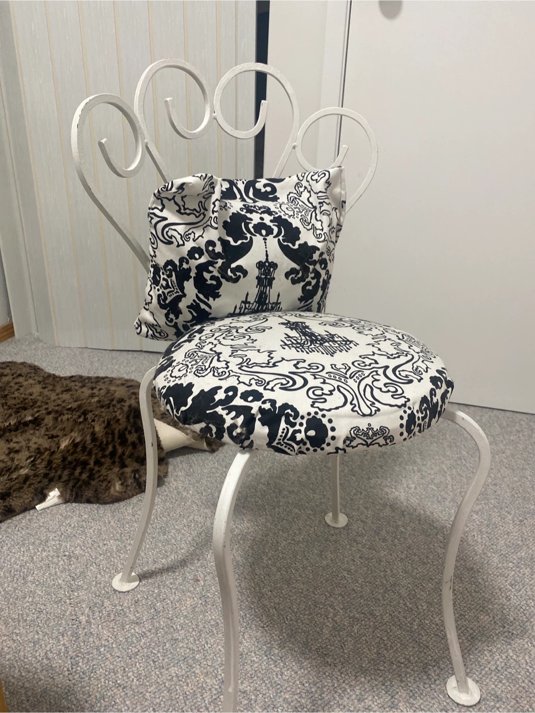 This is a charming white metal vanity stool with a decorative black and white damask upholstered seat and back cushion. The ornate scrollwork on the backrest adds a touch of elegance. It's a lovely accent piece for a bedroom or dressing area. Pick up cash only
