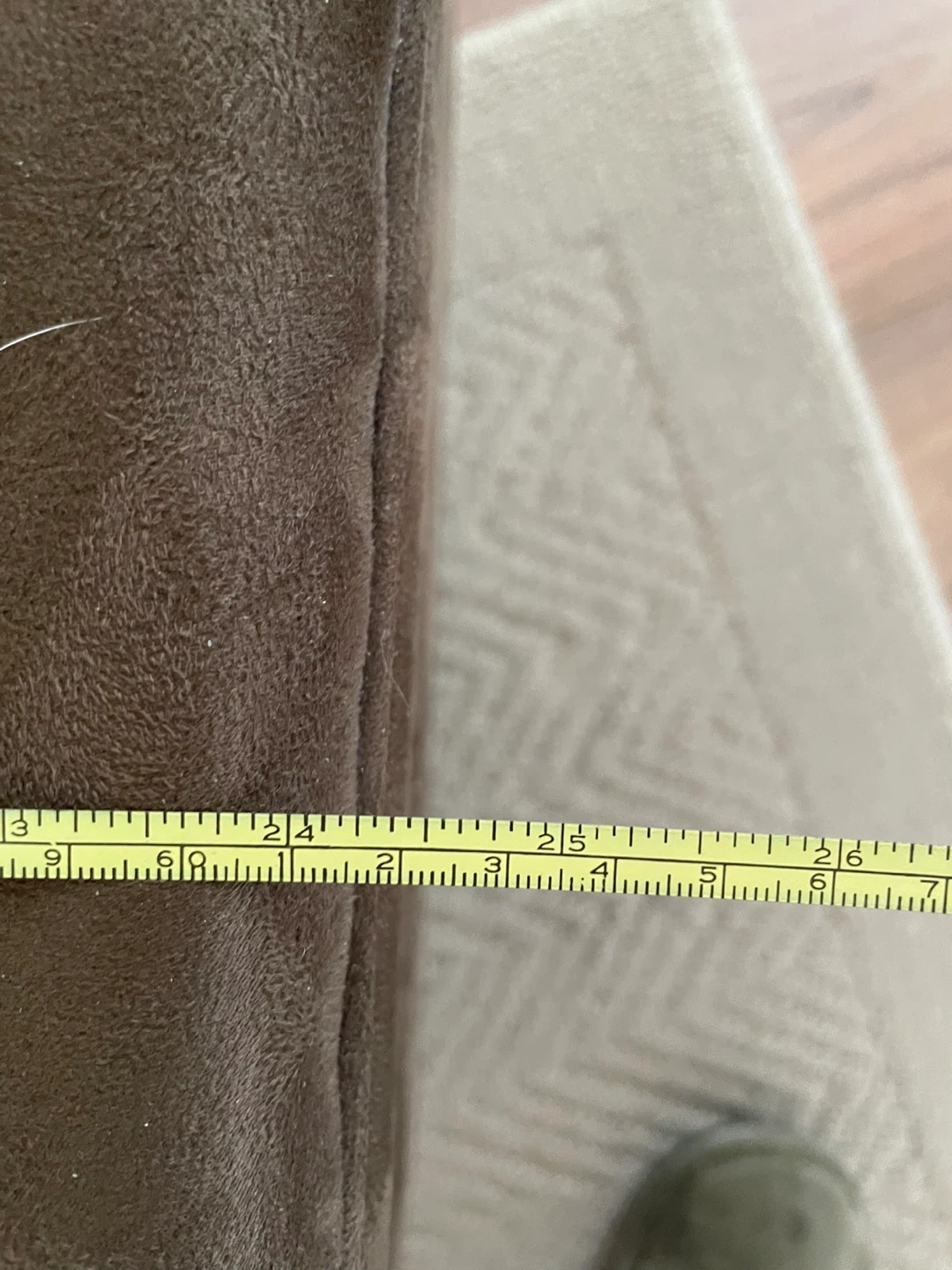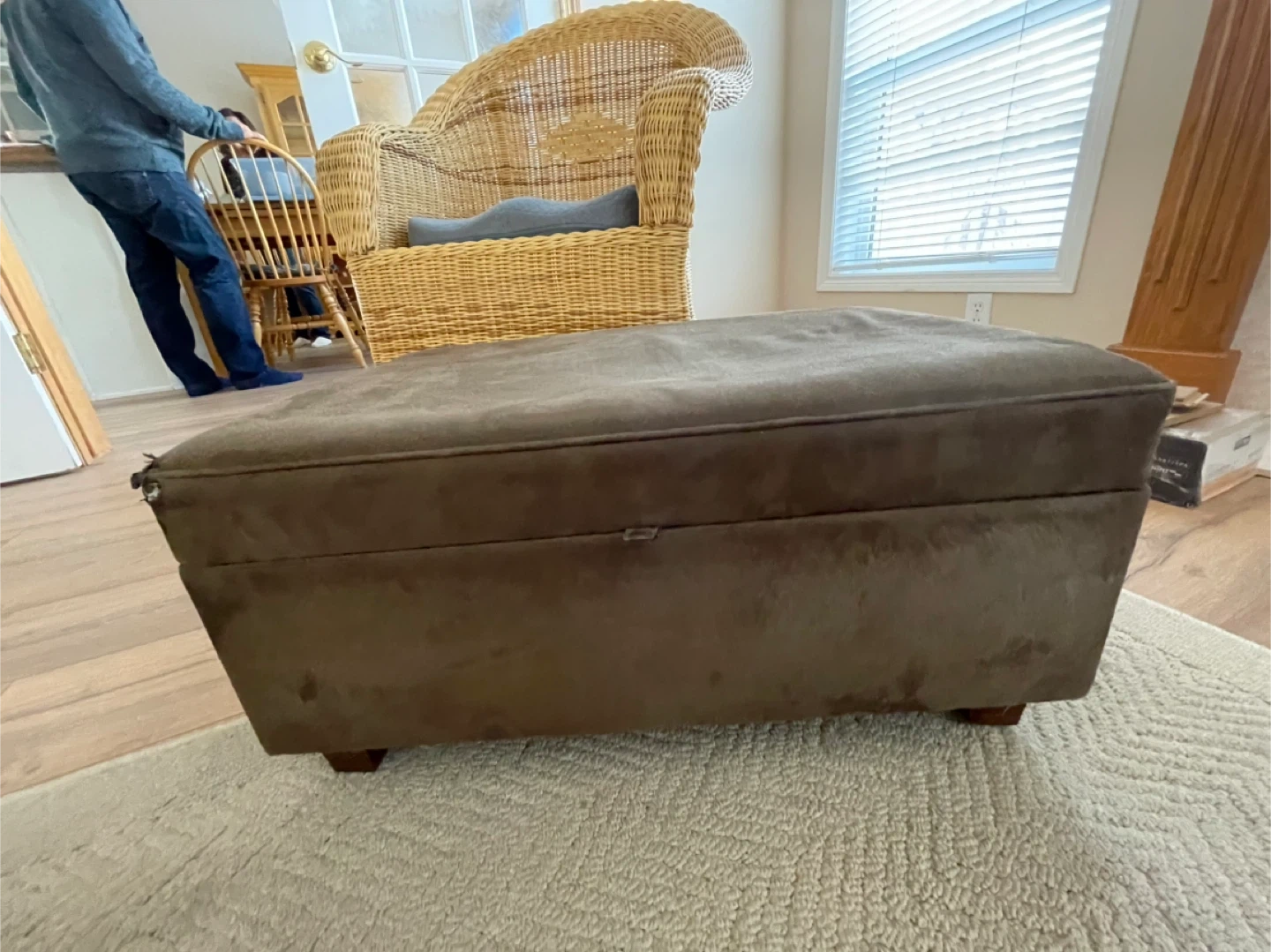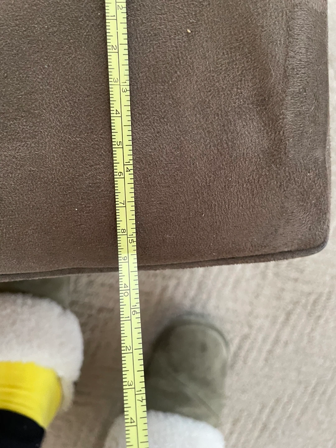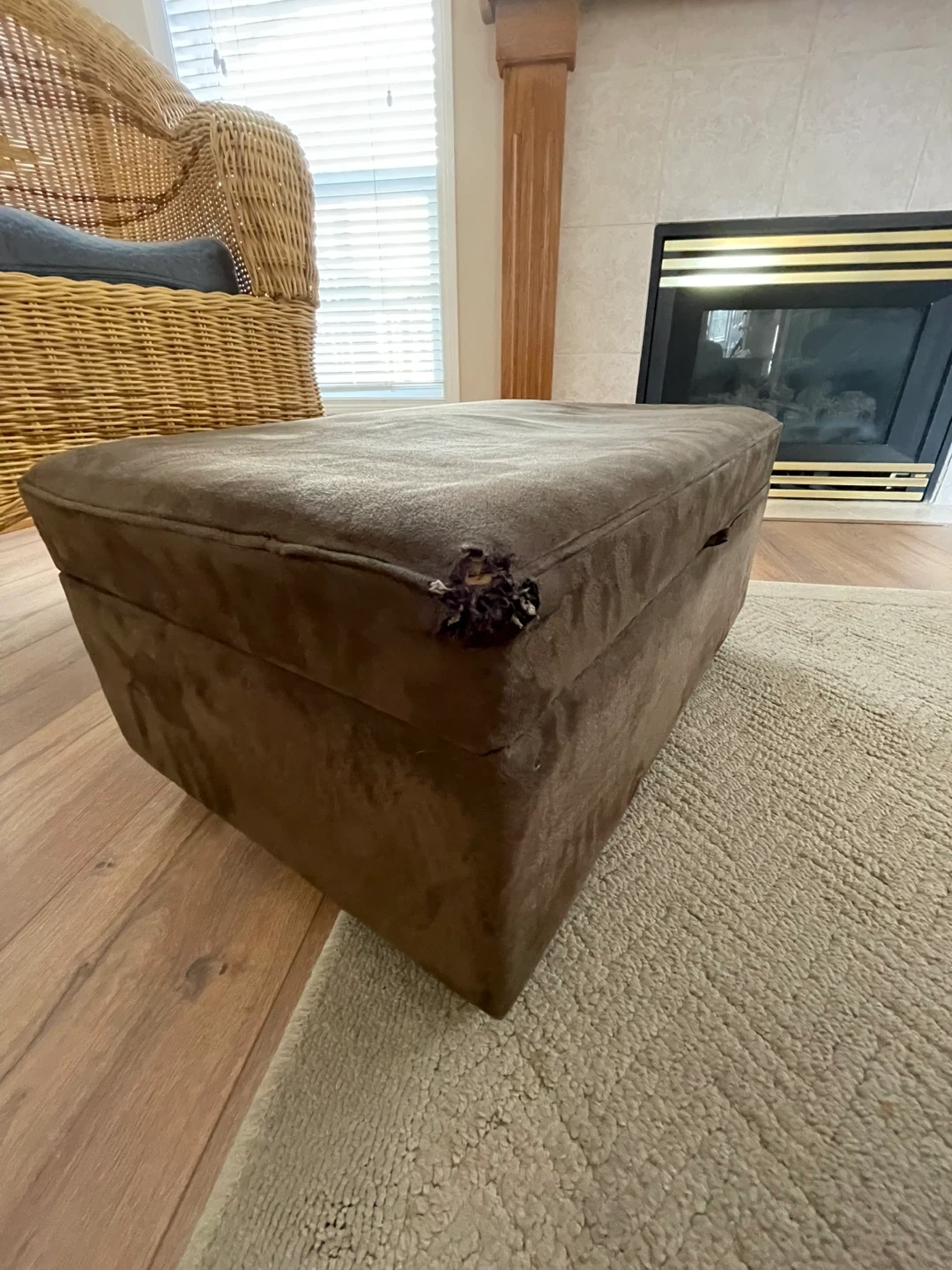 Brown fabric ottoman footrest. It's approximately 24 inches wide and 16 inches tall. Some wear is visible on one corner.
