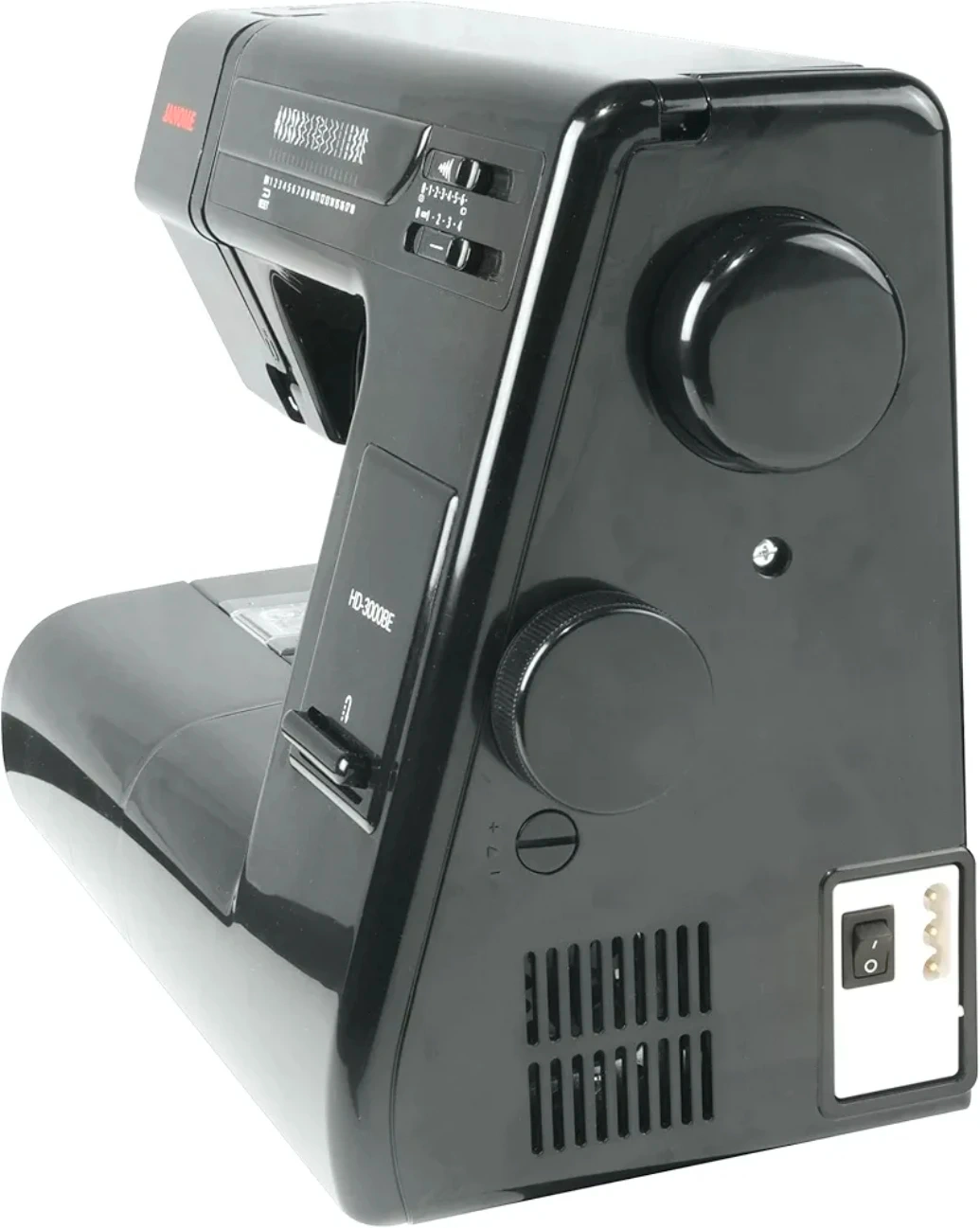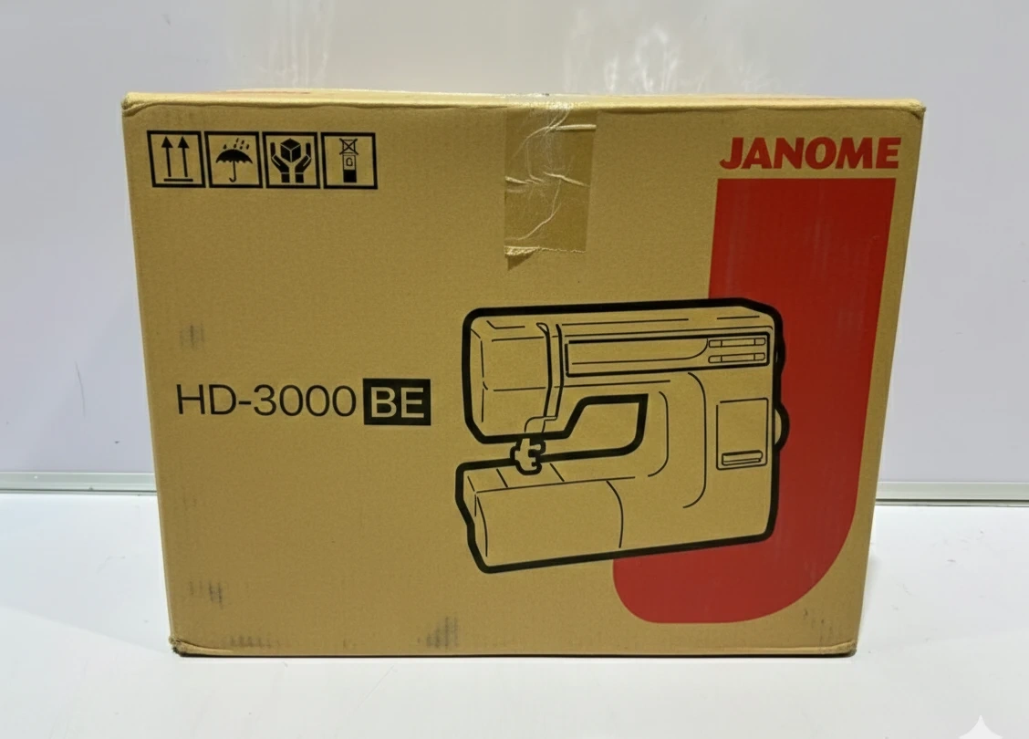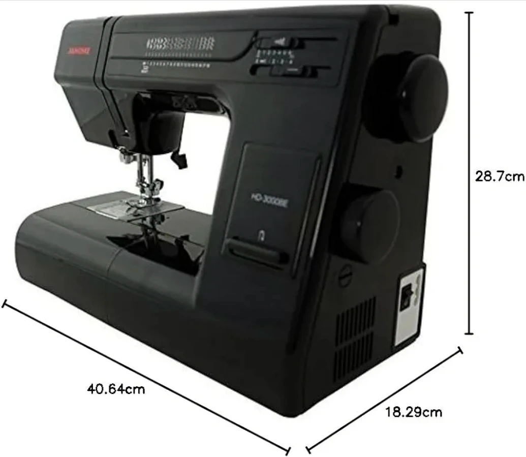 Janome HD-3000BE sewing machine in black. It's an all-metal body, mechanical machine with 18 built-in stitches and a built-in needle threader. Includes a hard cover and various accessories. Great for everyday sewing tasks!