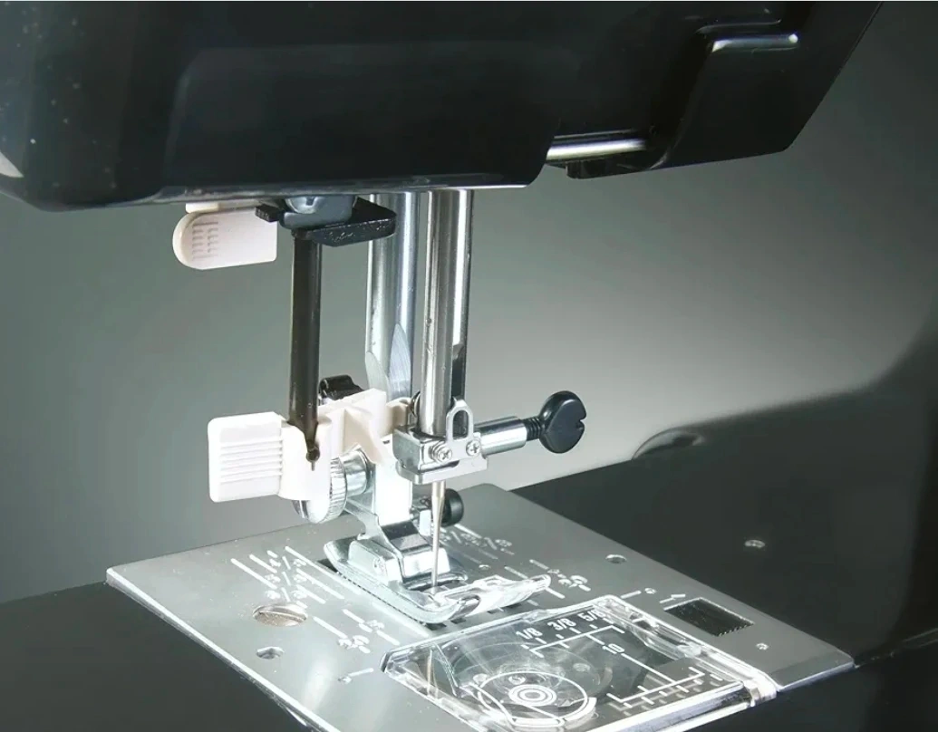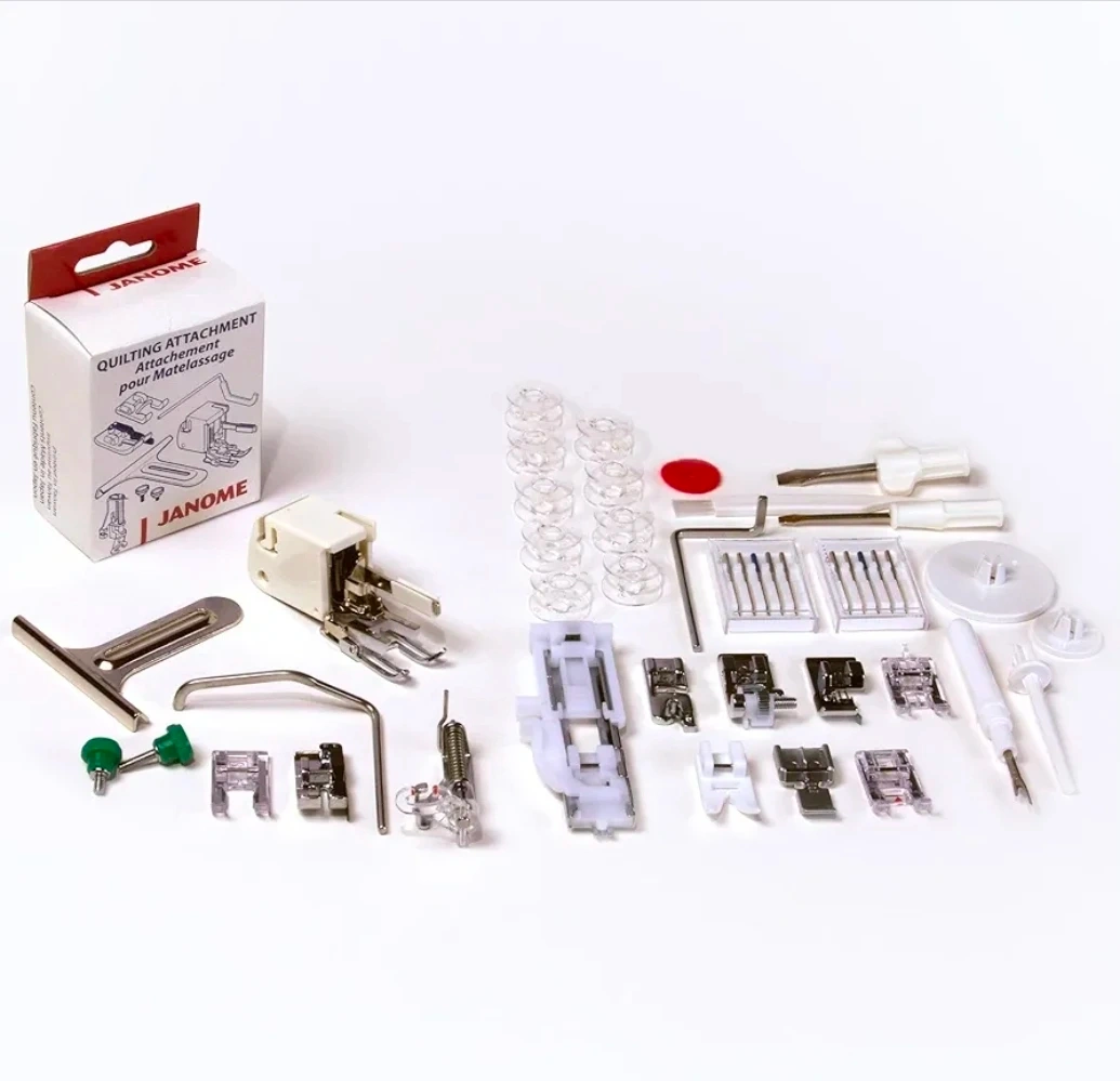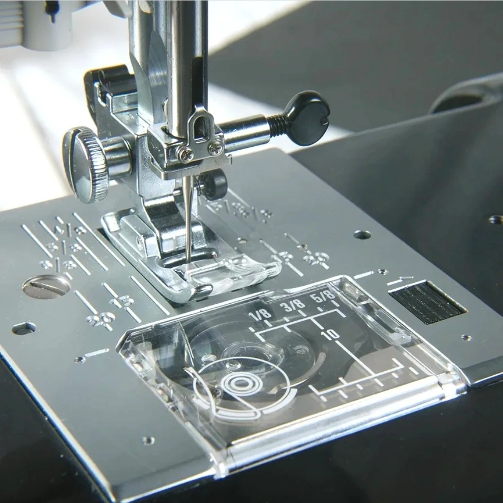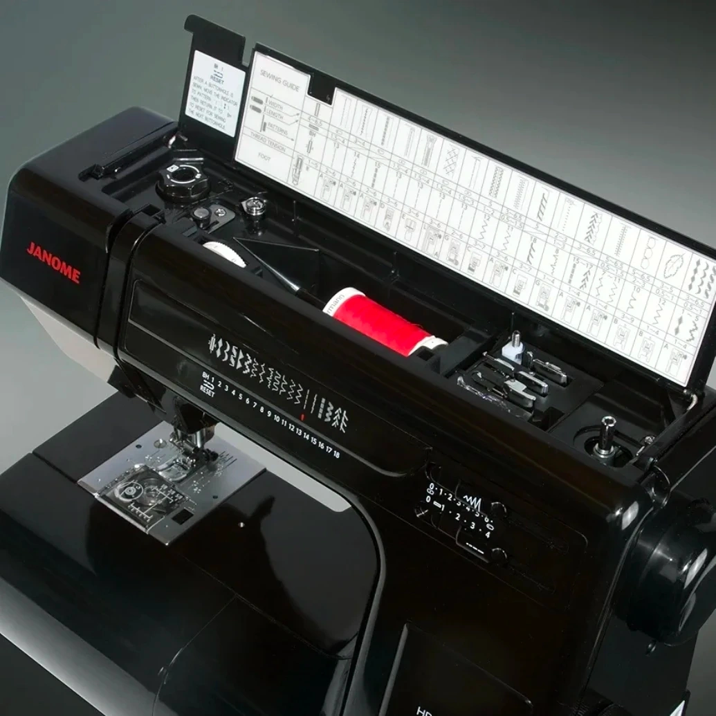 Janome HD-3000BE sewing machine in black. It's an all-metal body, mechanical machine with 18 built-in stitches and a built-in needle threader. Includes a hard cover and various accessories. Great for everyday sewing tasks!