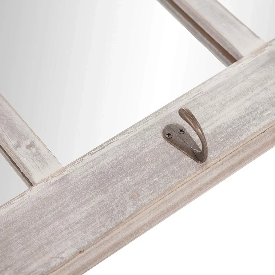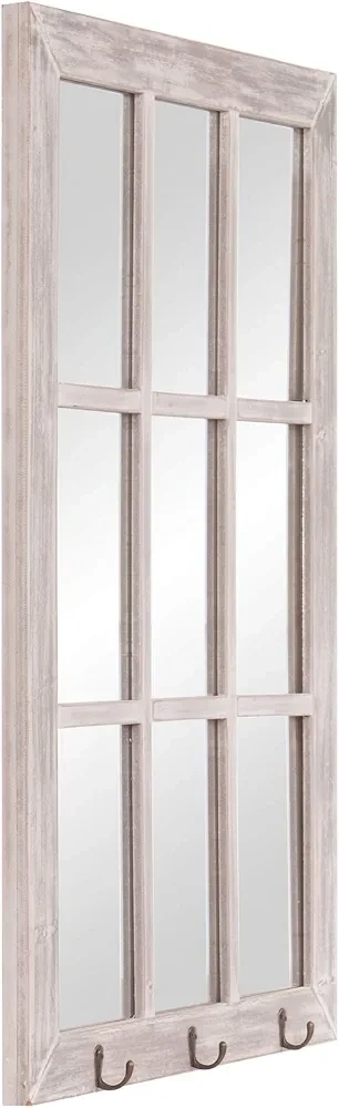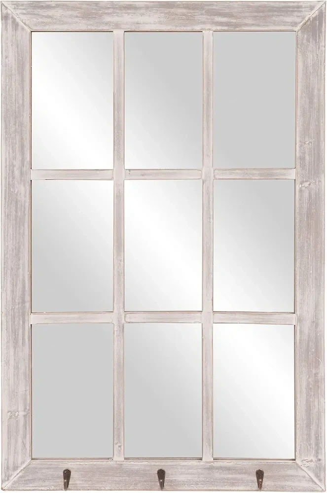 This distressed wood mirror features a charming window pane design with nine individual reflective panels. It includes three metal hooks at the bottom for hanging items. It's a lovely accent piece for any entryway or room!
