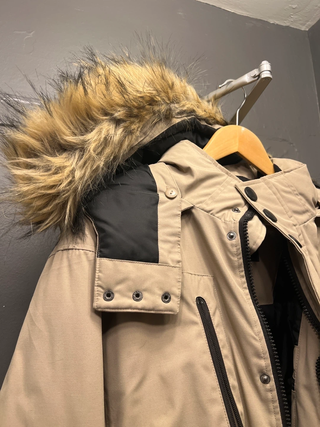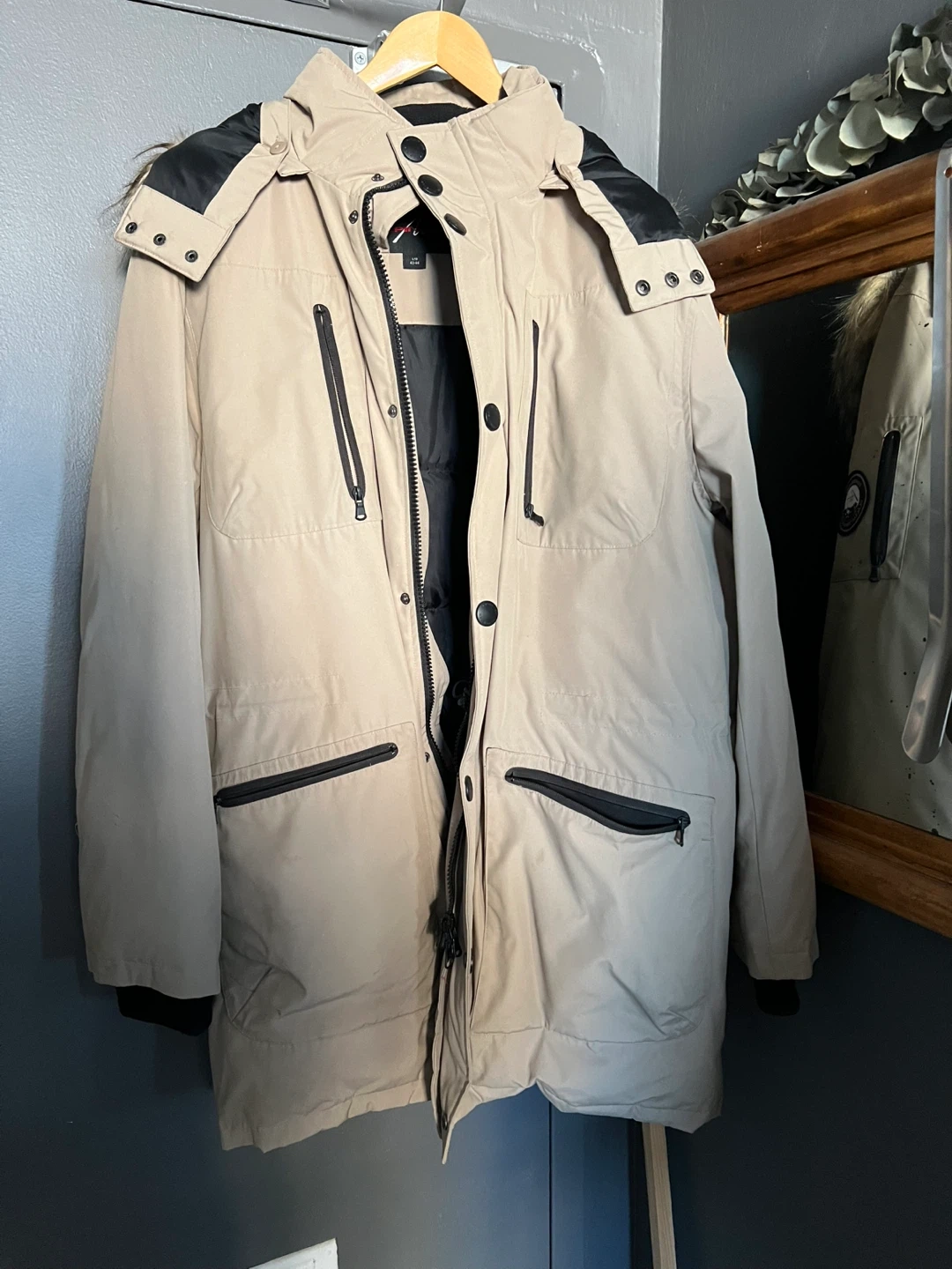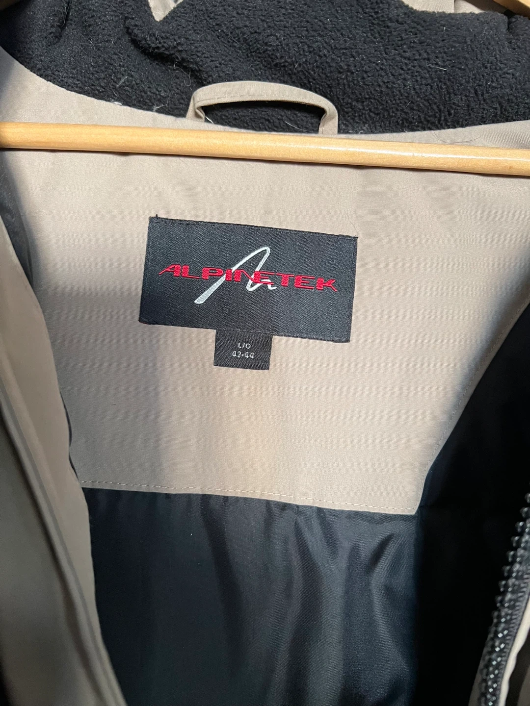 This Alpinetek down filled parka jacket is a size Large, measuring 42-44. It's a stylish and warm option for colder weather. It features a faux fur-lined hood and multiple zippered pockets for convenience.