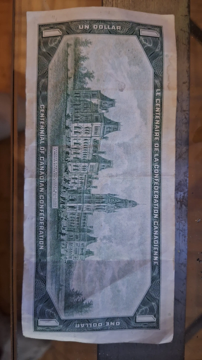 This is a one dollar bank note from Canada, celebrating the Centennial of Canadian Confederation in 1967. It features Queen Elizabeth II on the front and images of Canadian Parliament buildings on the back. A great piece for collectors!