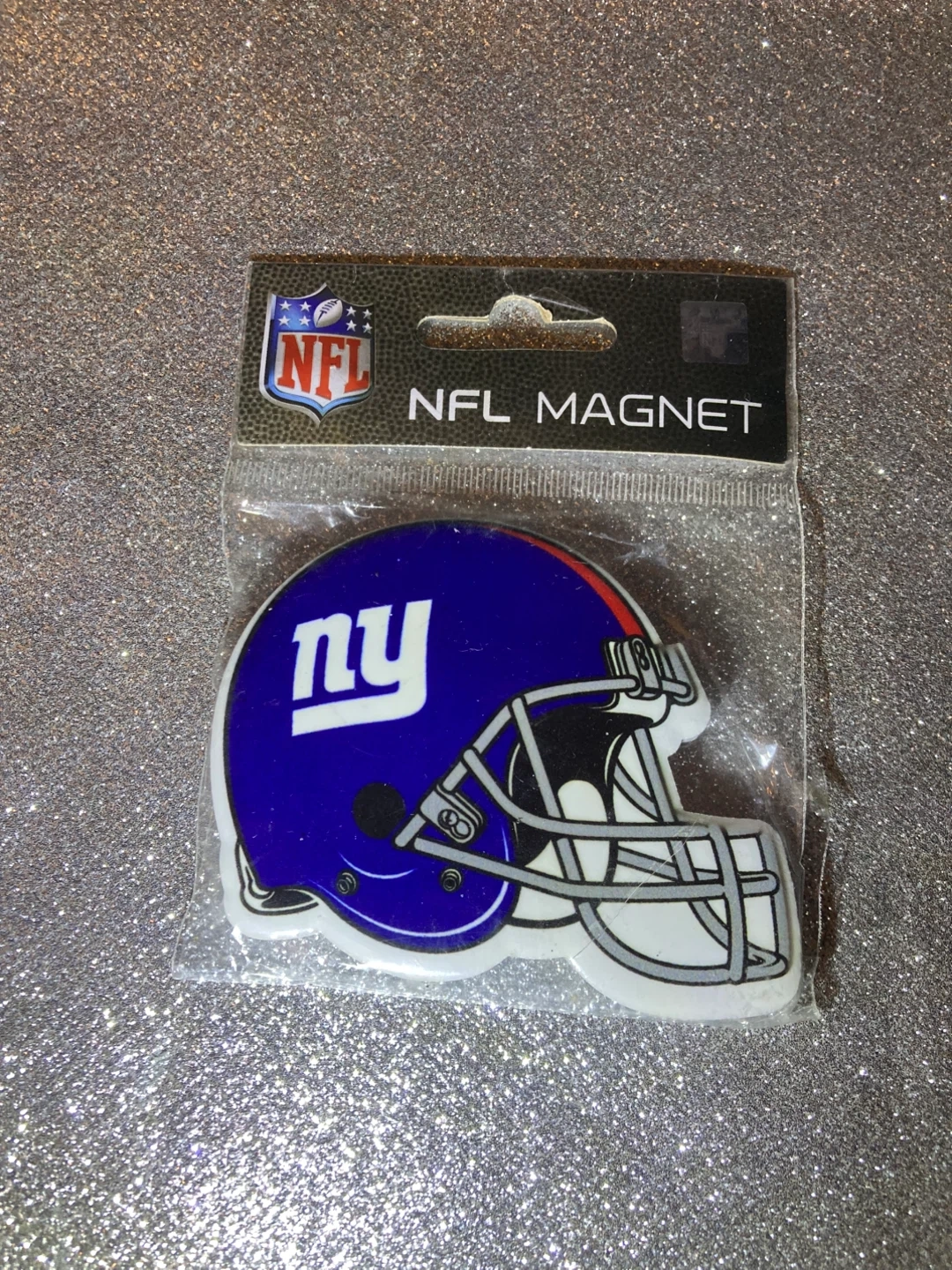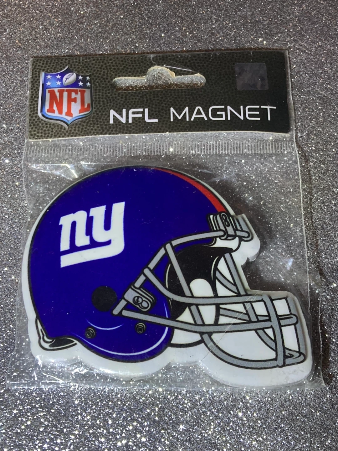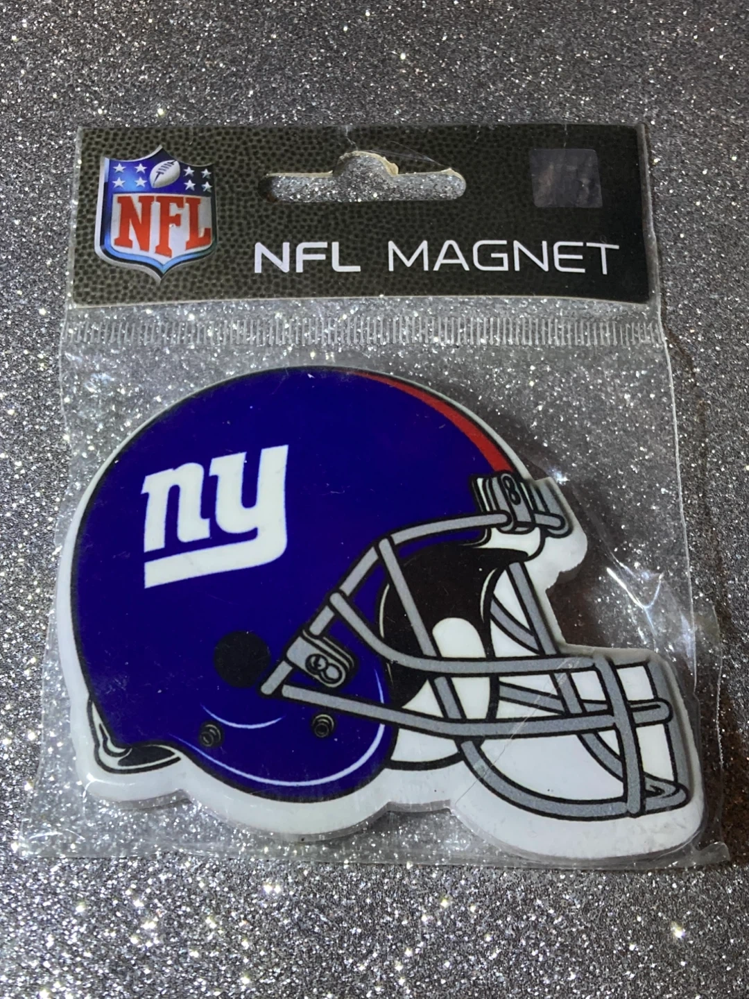 Show your team spirit with this New York Giants NFL magnet! It's shaped like a football helmet and ready to stick on your fridge or locker. Perfect for any Giants fan!