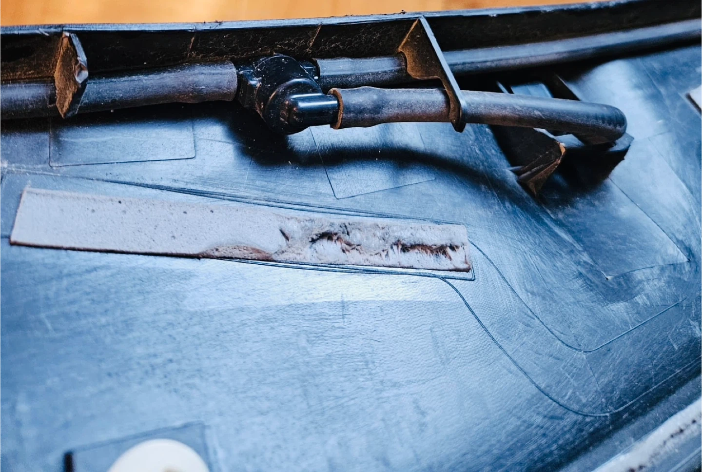 Genuine hood panel for Toyota Scion iQ models (2012–2015), complete with windshield washer sprayers installed. This part mounts on the hood and holds the washer nozzles for the windshield cleaning system.