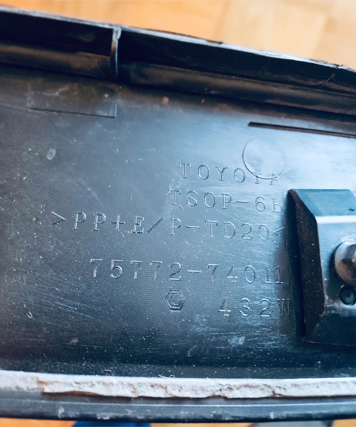 The part number 75772-74011. It's made of PP+E/P-TD20 material. The trim shows some wear and tear.