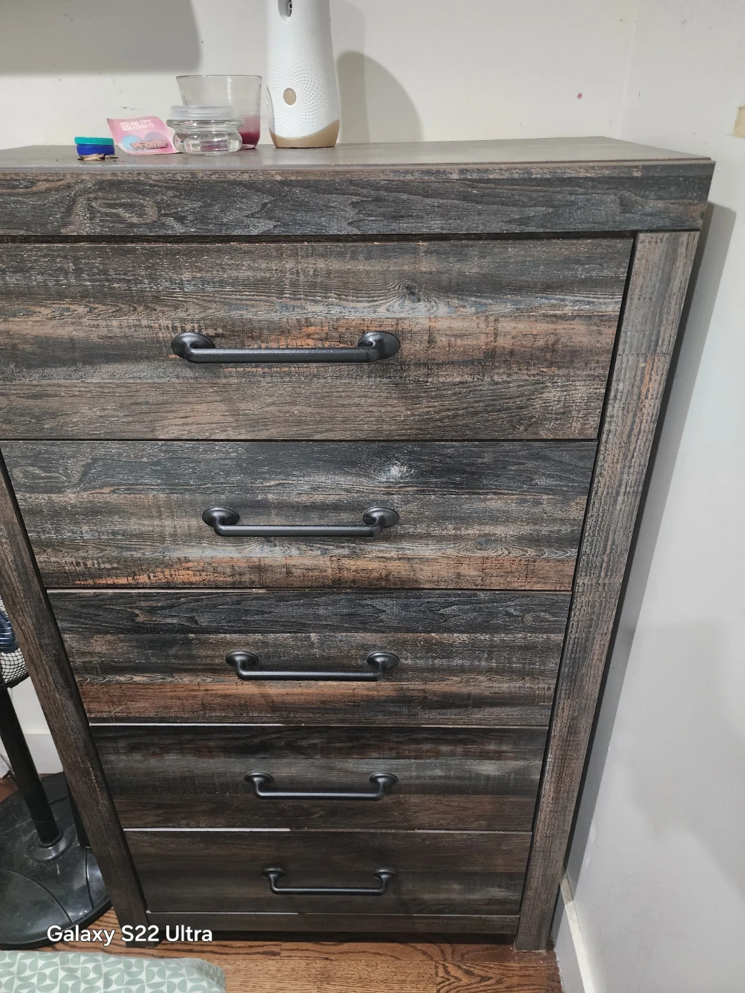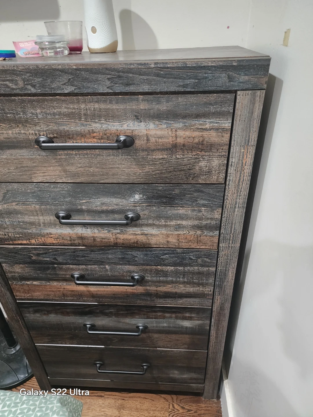 Rustic wood dresser with 6 drawers and matching nightstand with 2 drawers. Features dark, distressed wood finish with black metal hardware. Plenty of storage for clothes and bedroom essentials! This set's design adds a charming, farmhouse touch to any bedroom.