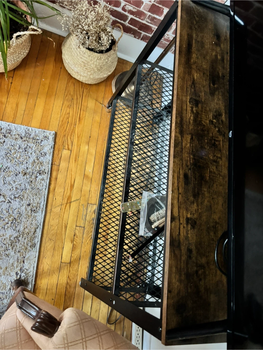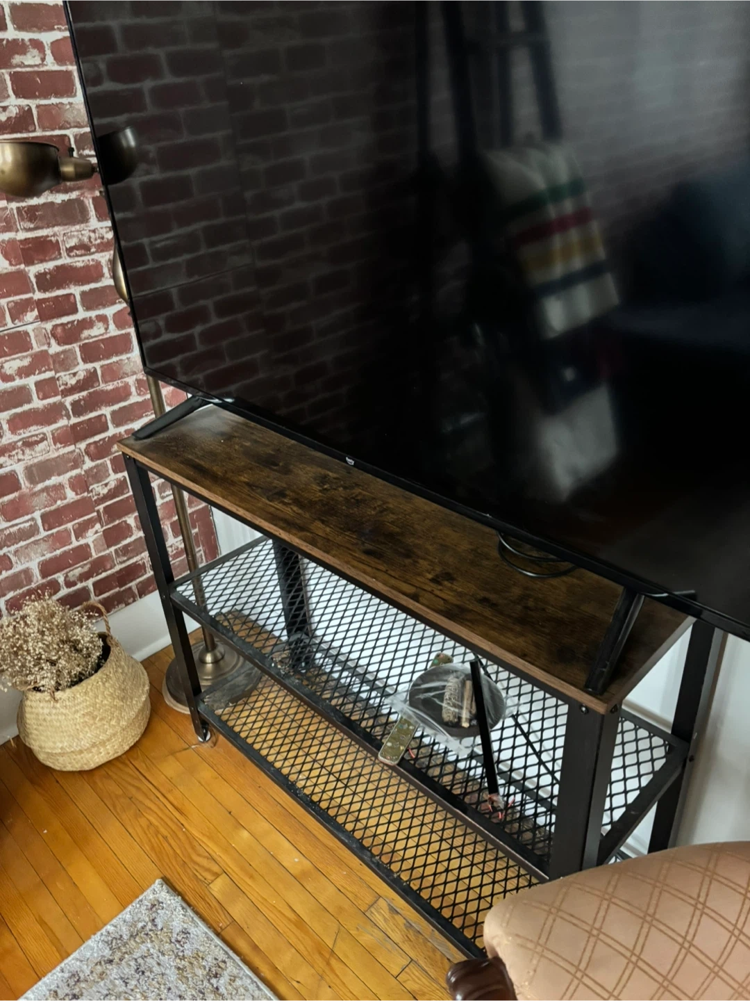 This TV stand features a rustic wood-look top with a metal frame. It has three open shelves for storage and display. The industrial design makes it a stylish addition to any living space.
