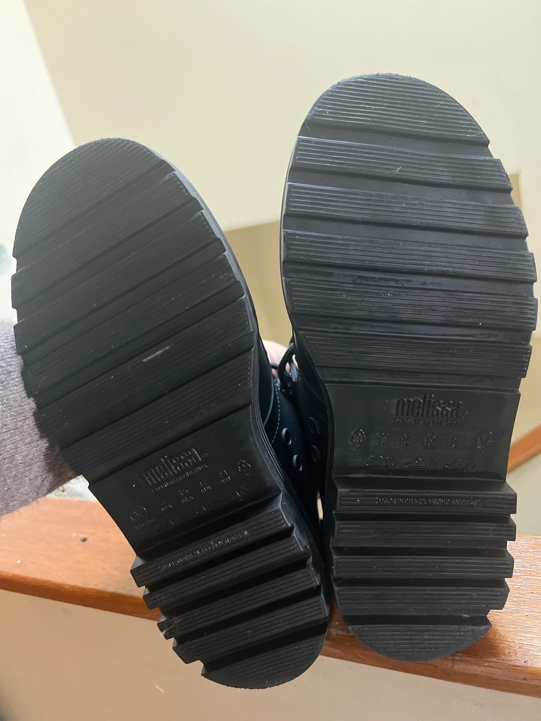 These black Melissa combat boots are made of rubber. They feature a lace-up closure for a secure fit. The lug sole provides good traction.