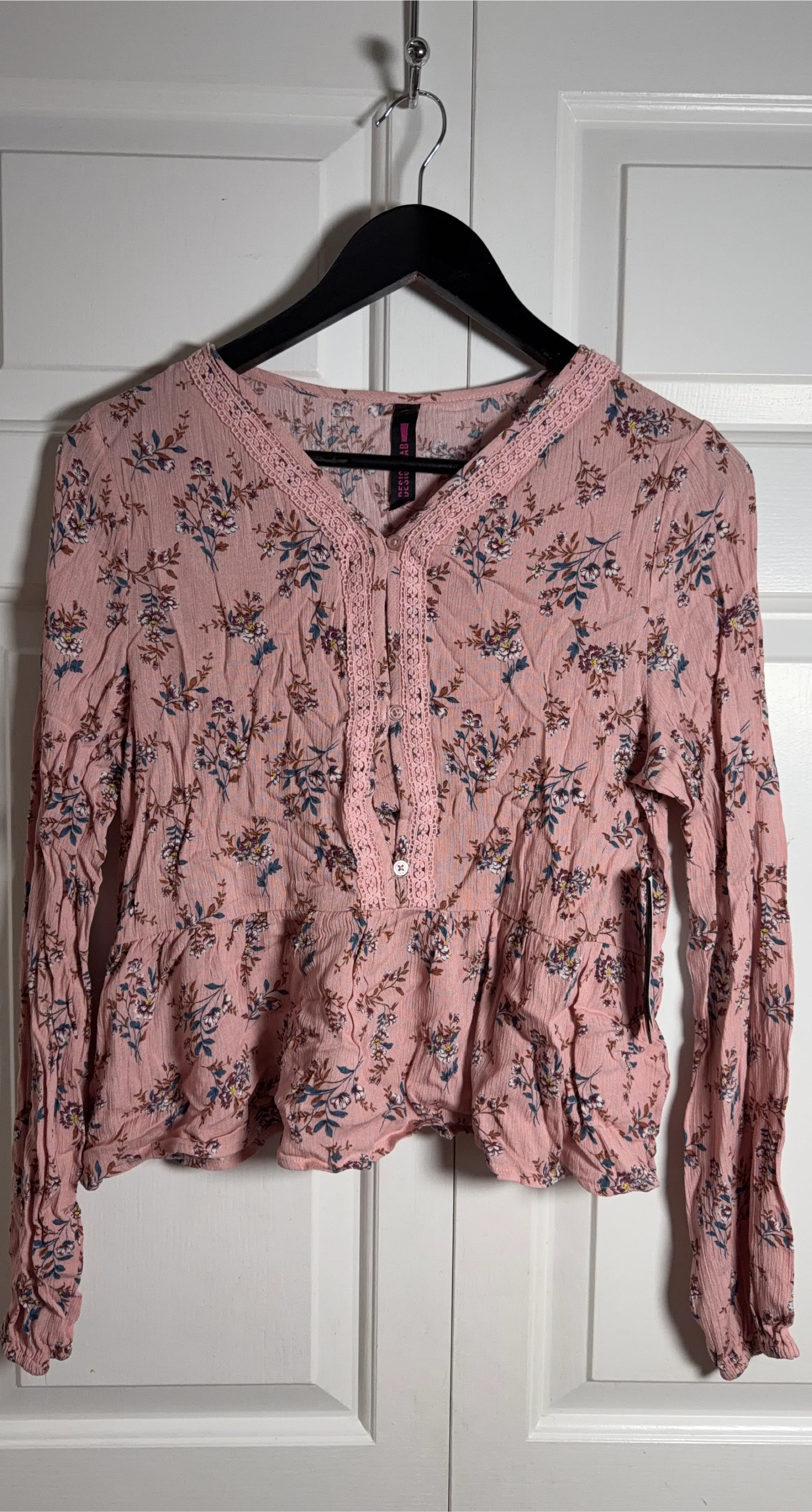 Girls size Large This is a Design Lab girls' peplum top with a delicate floral print. It features a V-neck and button-up front with lace trim. The fabric is lightweight and has a crinkled texture.