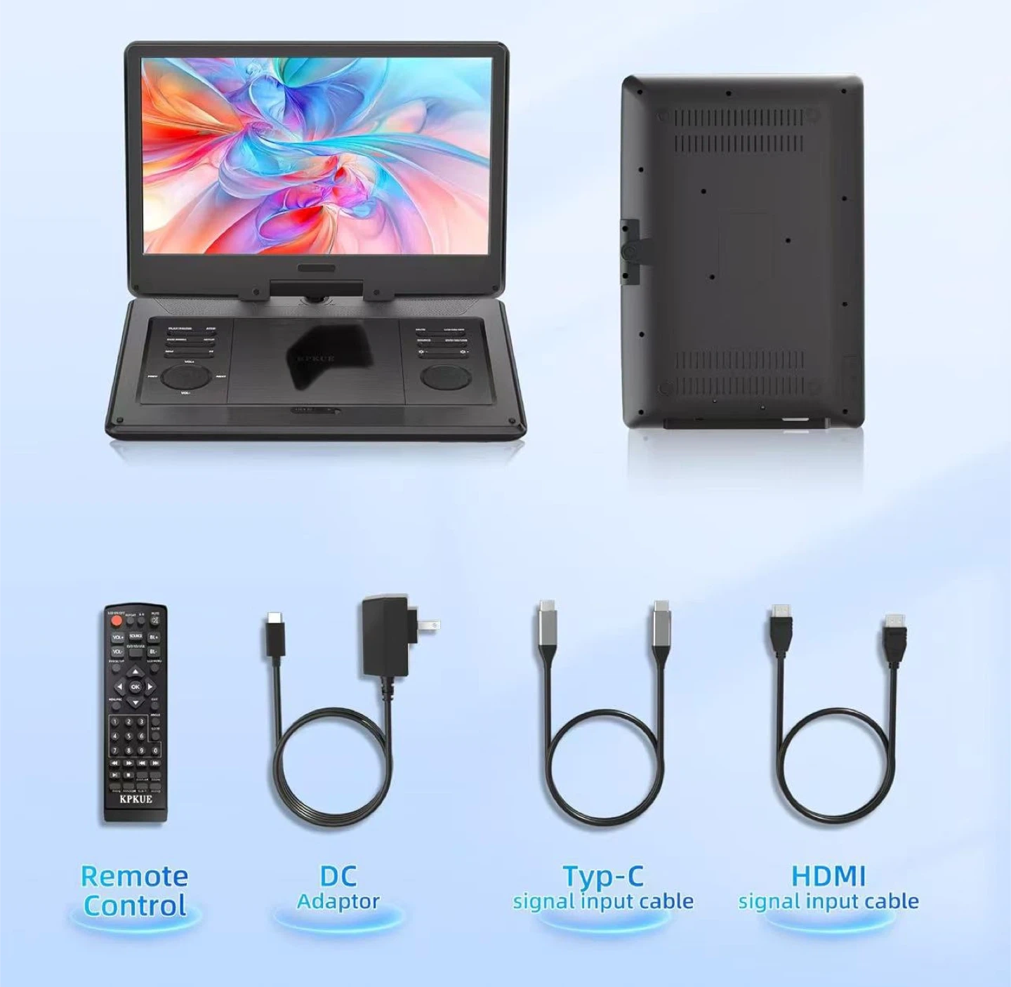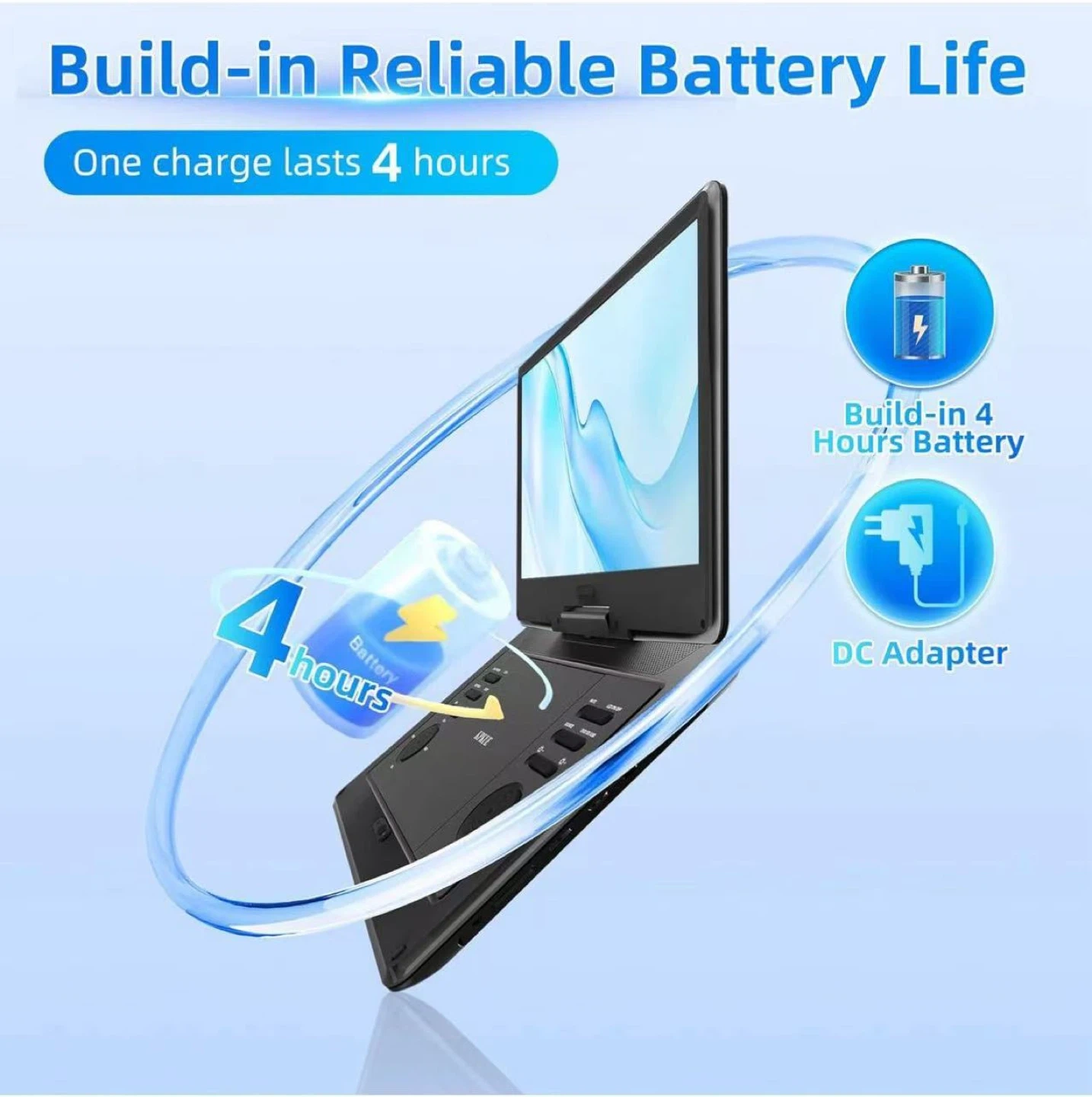 15.6" FHD Portable DVD Player with 13.3" Swivel Screen, 1920 * 1080P Car Player for Kids, 4 Hours Rechargeable Battery Support USB/SD Card, Multiple Disc Formats, Type-C/HDMI Port Dual Speakers