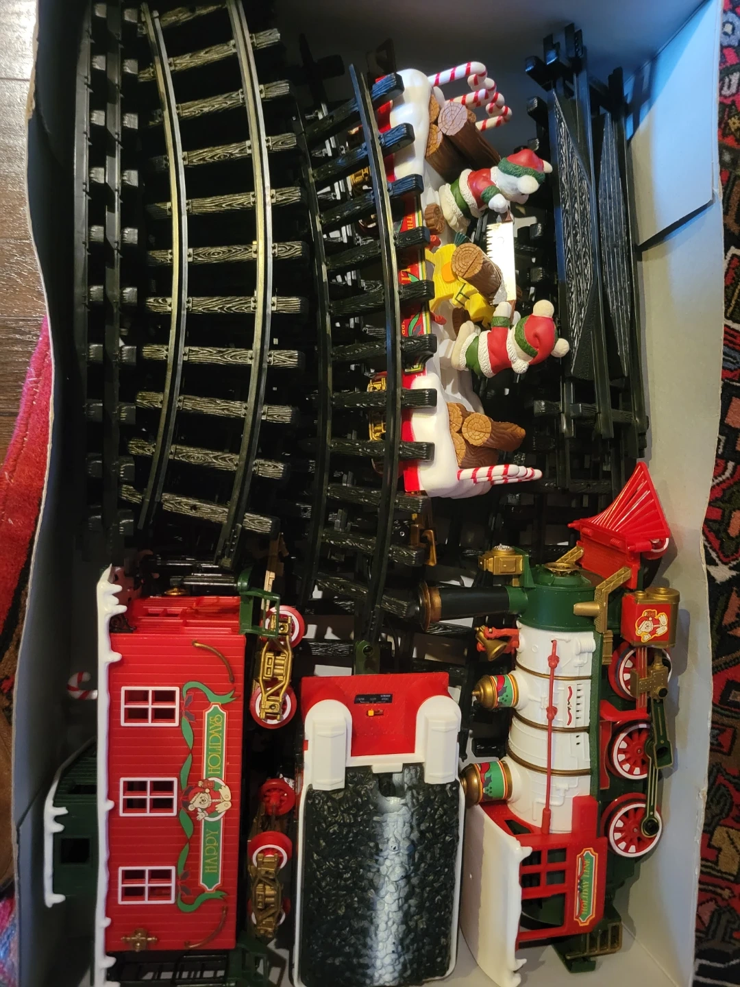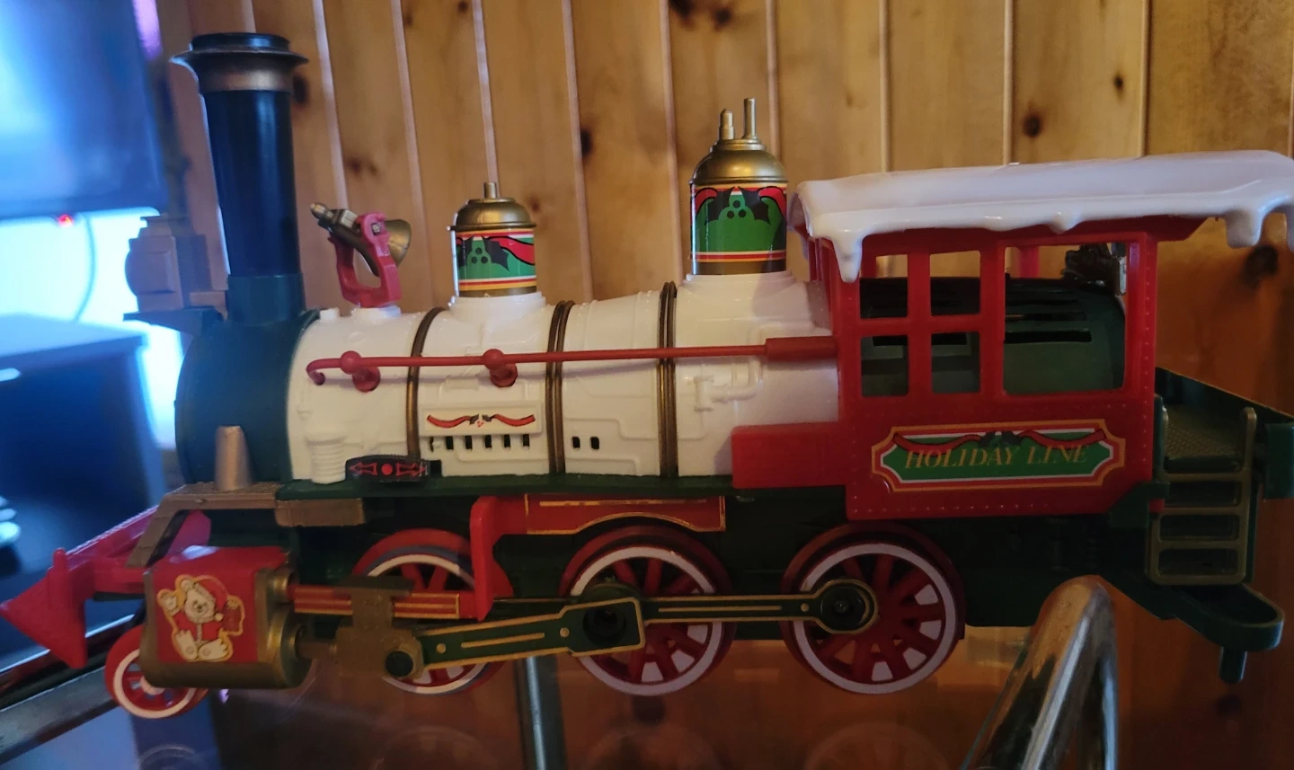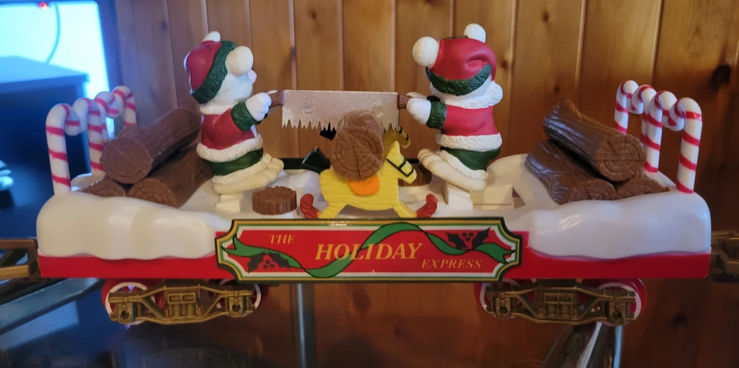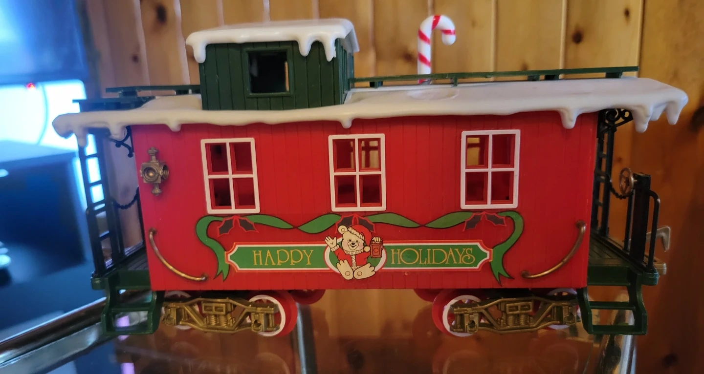 This festive train set features a locomotive, caboose, and a special holiday car with teddy bears. Includes tracks and accessories for a complete setup. Great for adding some holiday cheer to your home!