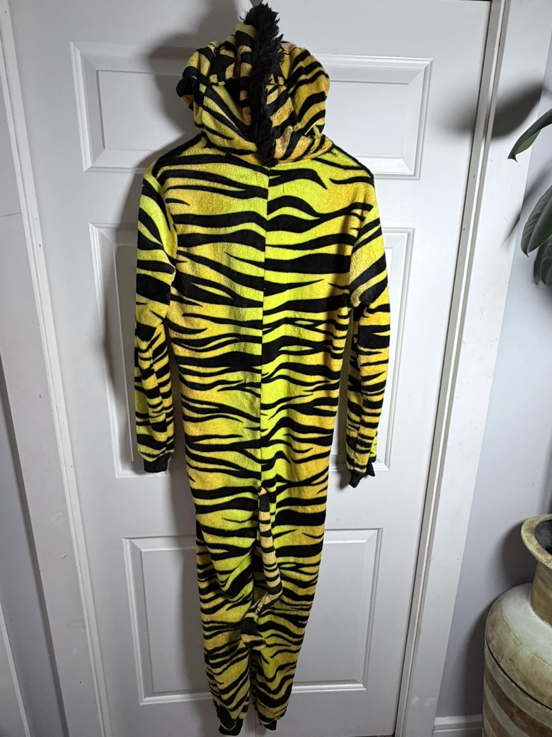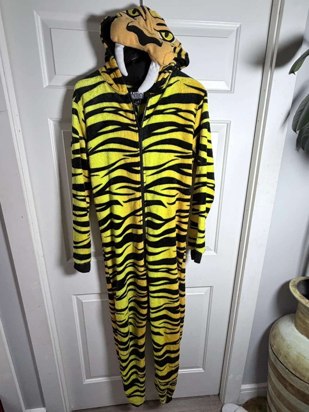 Adult size small This comfy fleece onesie is designed to look like a tiger. It features a hood with a tiger face and tiger stripes throughout. Zips up the front and has ribbed cuffs on the wrists and ankles. It's soft and cozy for lounging! New no tag