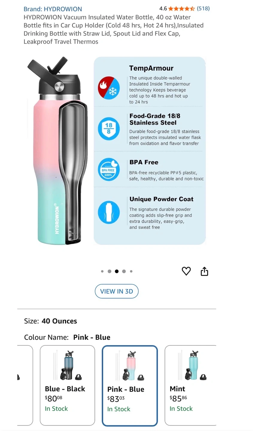 This HYDROWION insulated water bottle is 40 ounces and features a pink and blue ombre design. It's made of food-grade 18/8 stainless steel and keeps drinks cold for up to 48 hours or hot for up to 24 hours. Includes a straw lid, spout lid, and flex cap.