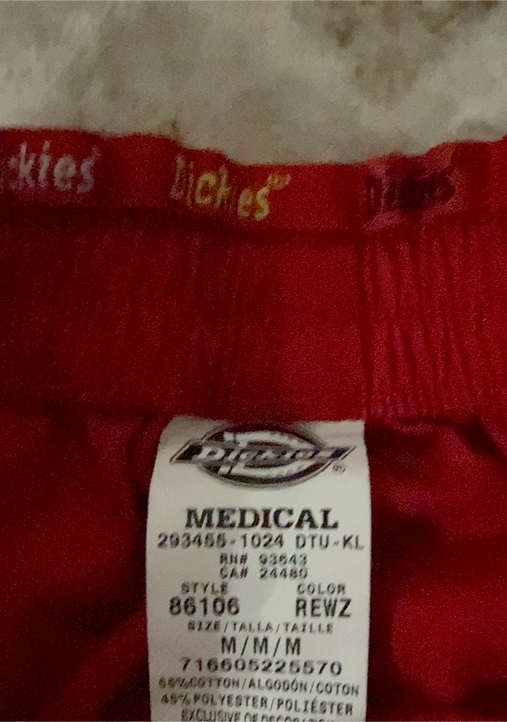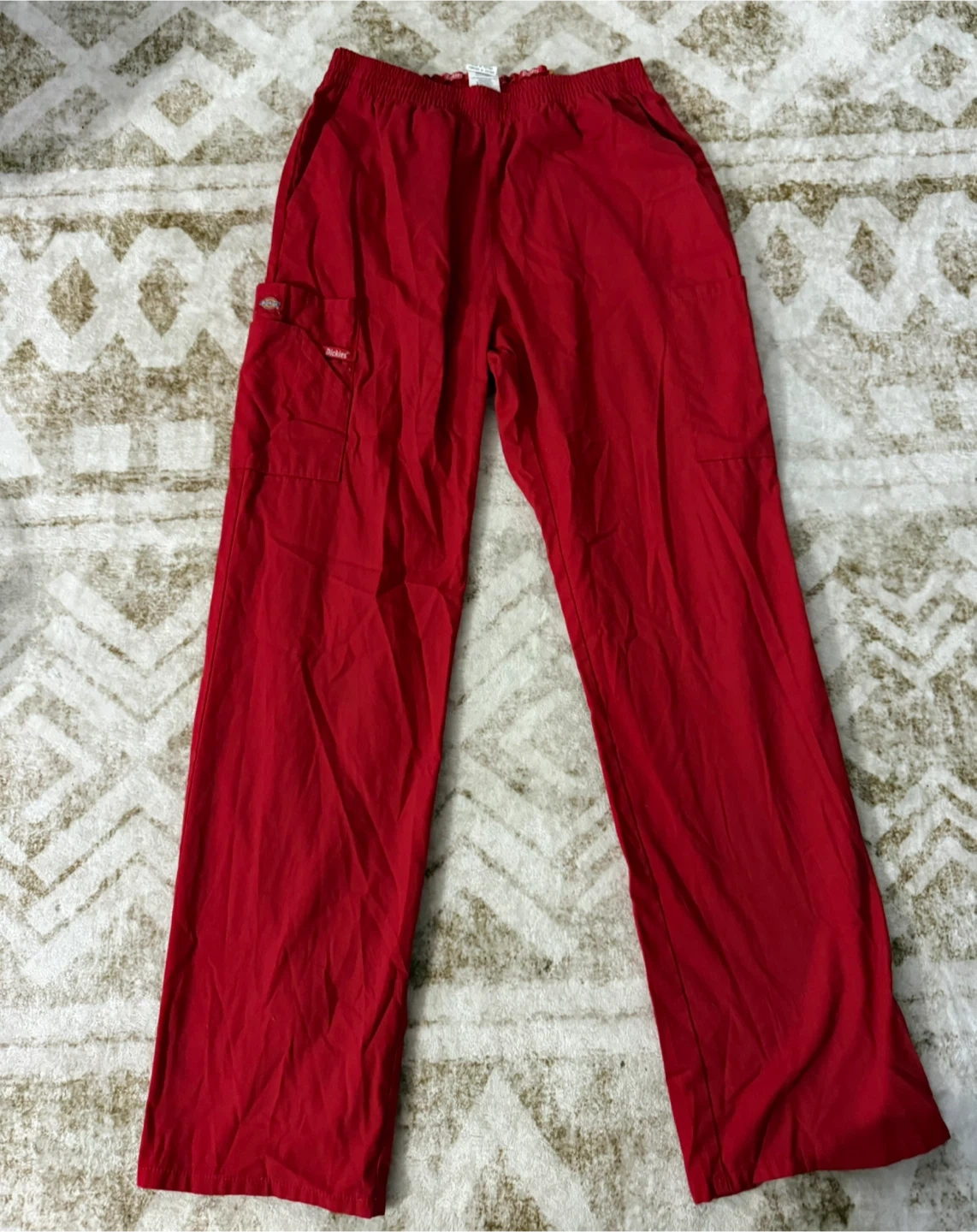 Dickies Medical scrub pants in red. These pants are size M/M. They're made of 50% cotton and 45% polyester. These are great for medical professionals!