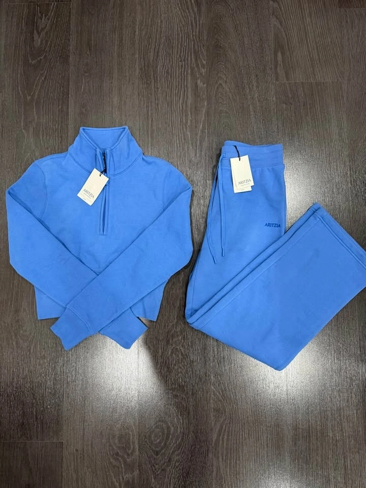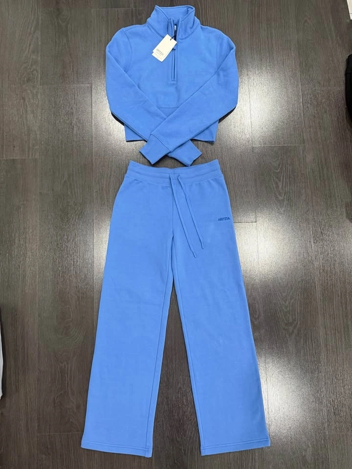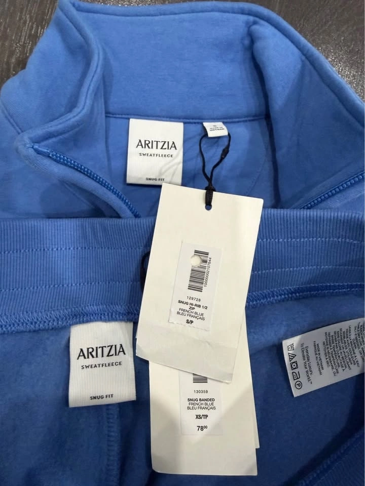 Brand new with tags. Colour: French Blue. Cozy Sweatfleece Snug Hi-Rib 1/2 Zip Mockneck Size S. Cozy Sweatfleece Snug Banded Sweatpant Size XS. Pick up 130 King St W or Bronte & Dundas, Oakville. Can also meet in Mississauga only on my schedule. Check out my listings for other Aritzia items.