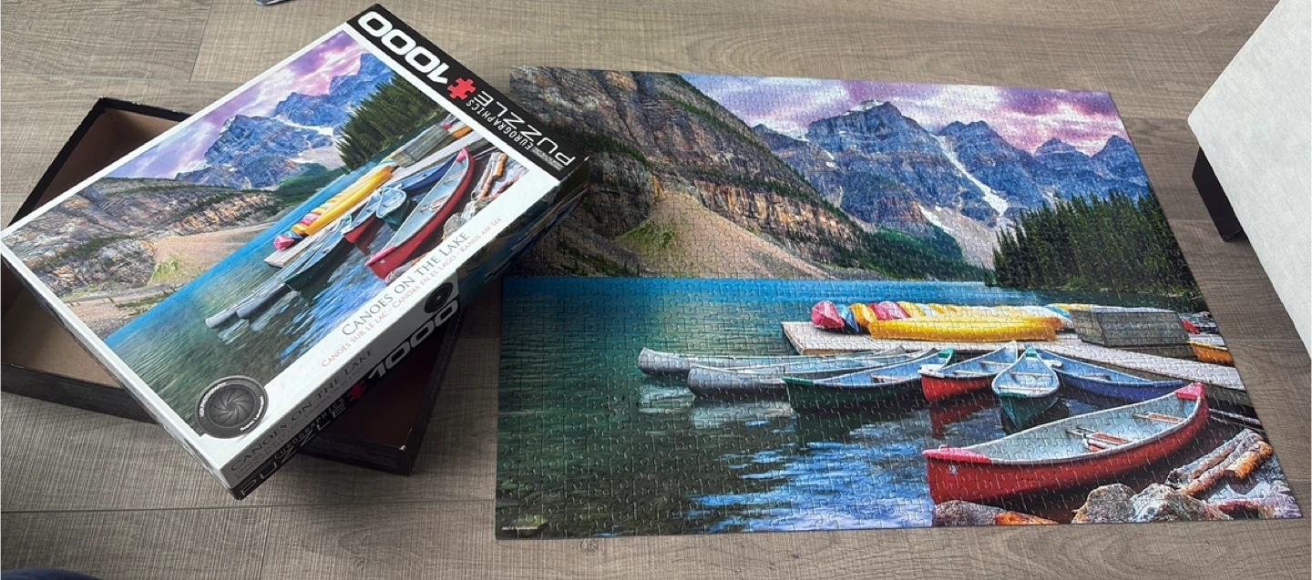 It's a 1000-piece jigsaw puzzle featuring a scenic image of canoes on a lake with mountains in the background. Comes with the original box. A fun challenge for puzzle enthusiasts! Pickup Yonge and Steeles