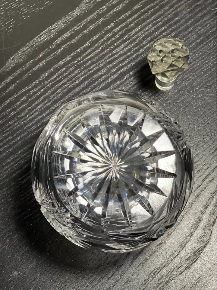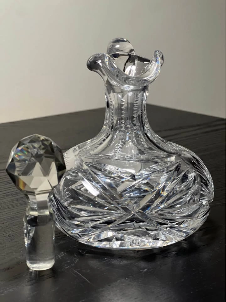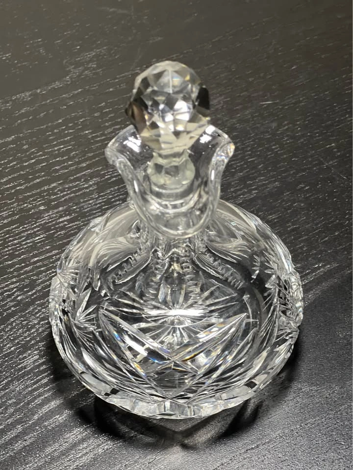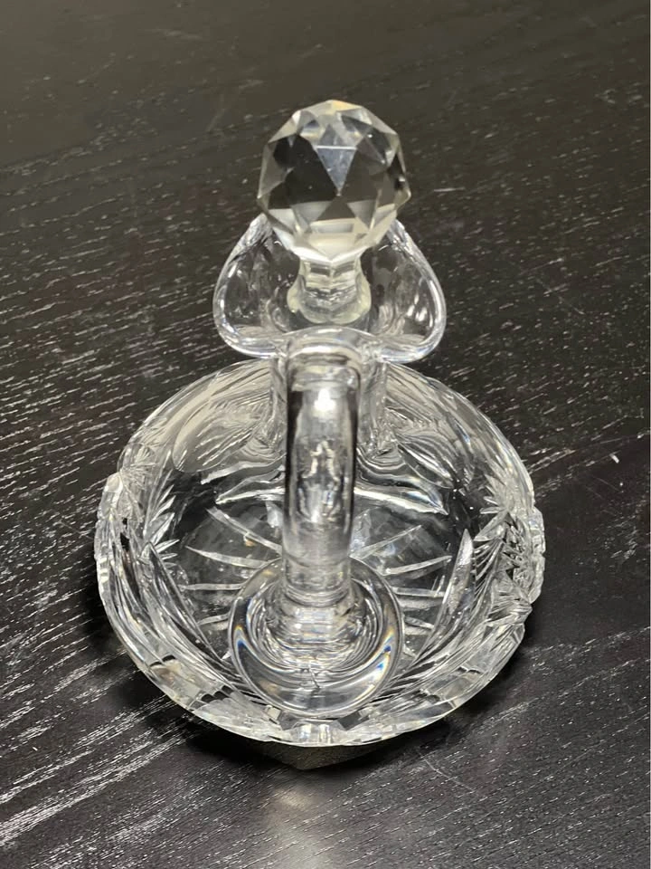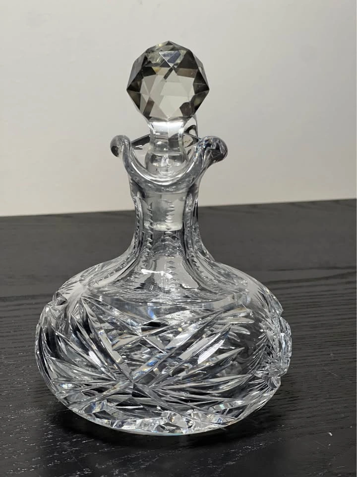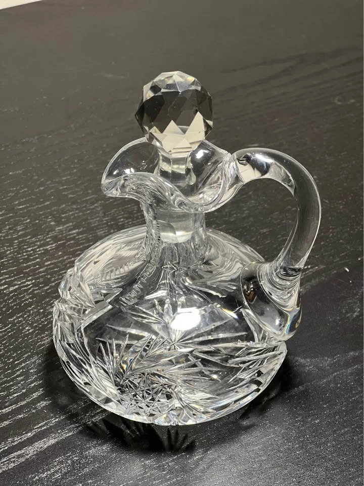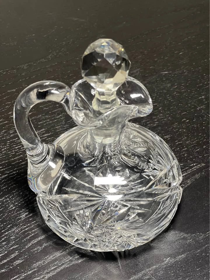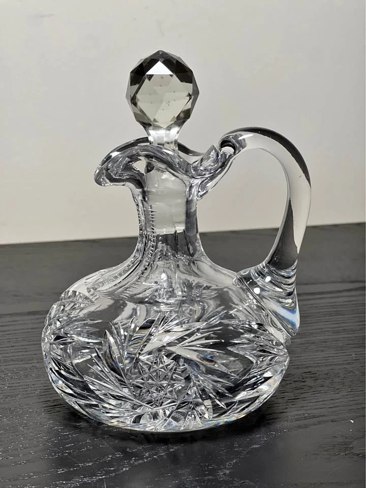 Antique American Brilliant cut glass cruet or handled decanter. Features brilliant hand-cut patterns, including starburst and cross-hatching motifs. Made of heavy, clear crystal. Includes a handle and a faceted stopper. Produced during the American Brilliant Period (ABP), approximately 1876-1920. Approximately 5.5” tall and 4” wide. Preowned. Pickup is 58th and 7th Ave in midtown Manhattan.