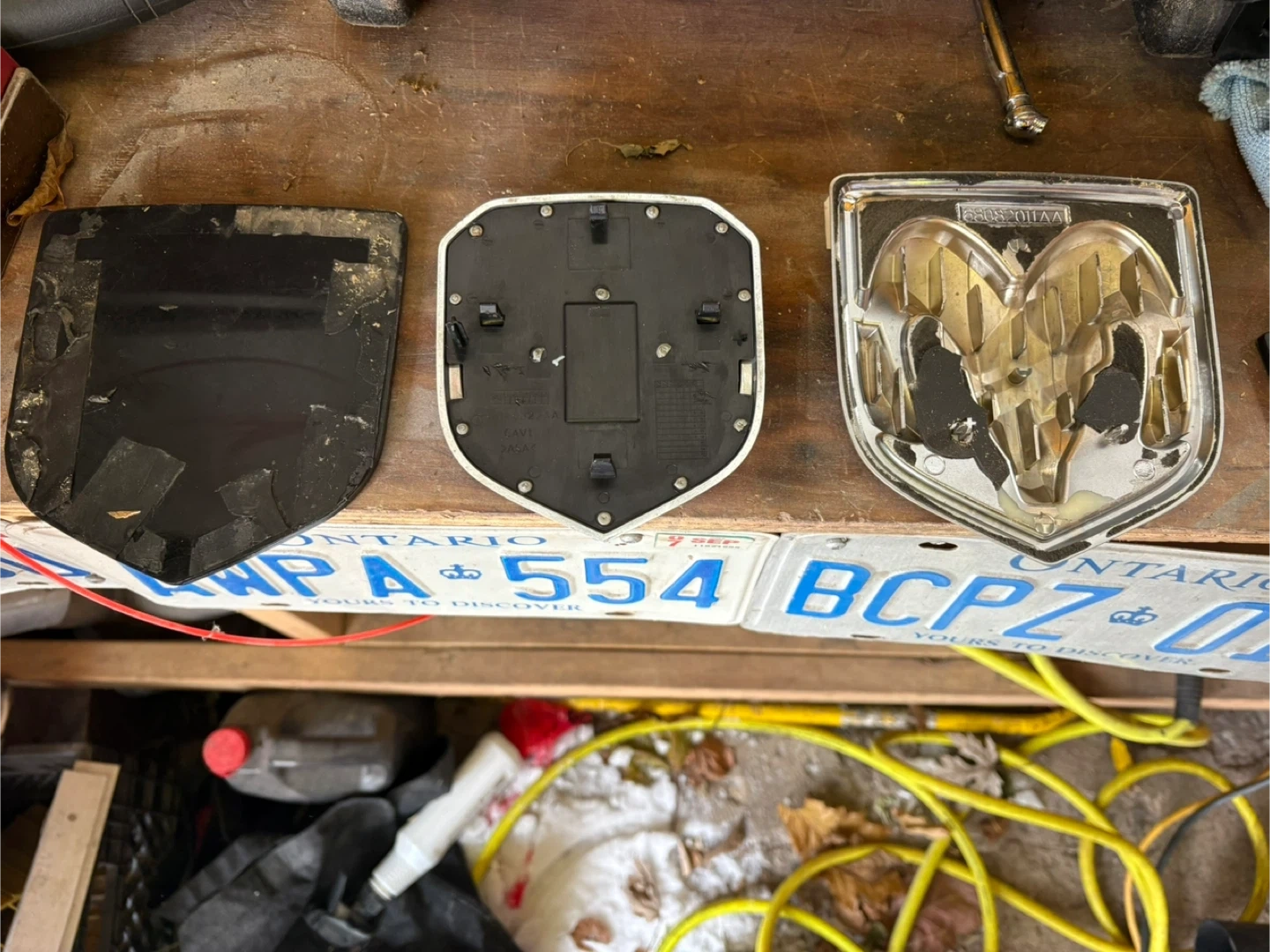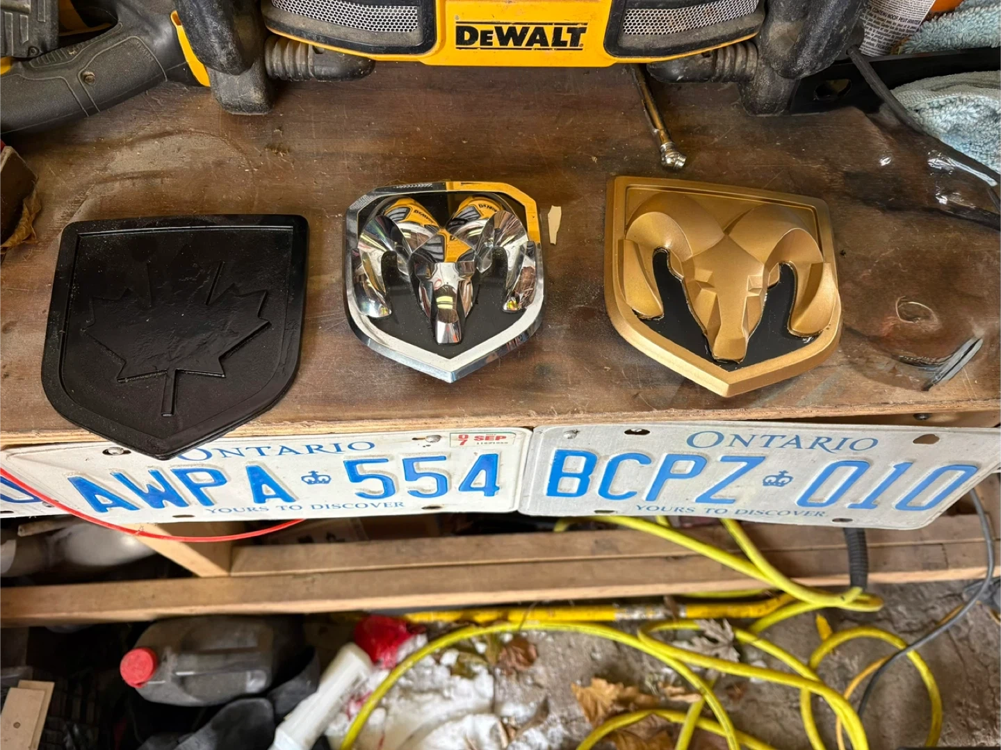 This set includes three Ram truck emblems. One is a black maple leaf emblem, one is a chrome and silver Ram head emblem, and the third is a gold Ram head emblem. These are replacement emblems for a Ram vehicle.