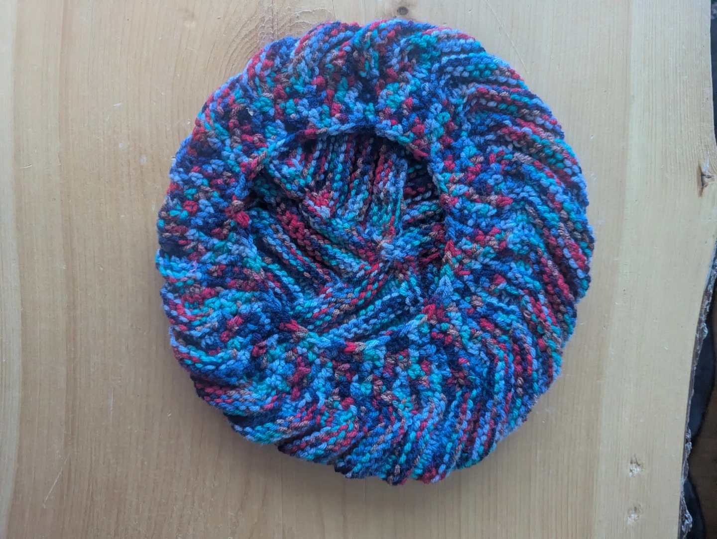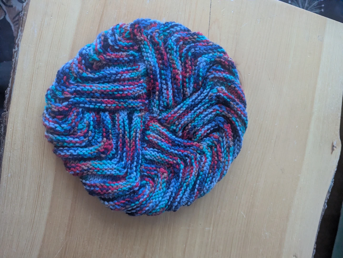 This is a cozy, hand-knitted beret in a vibrant multi-coloured yarn. It features a unique twisted pattern. One size fits most.
